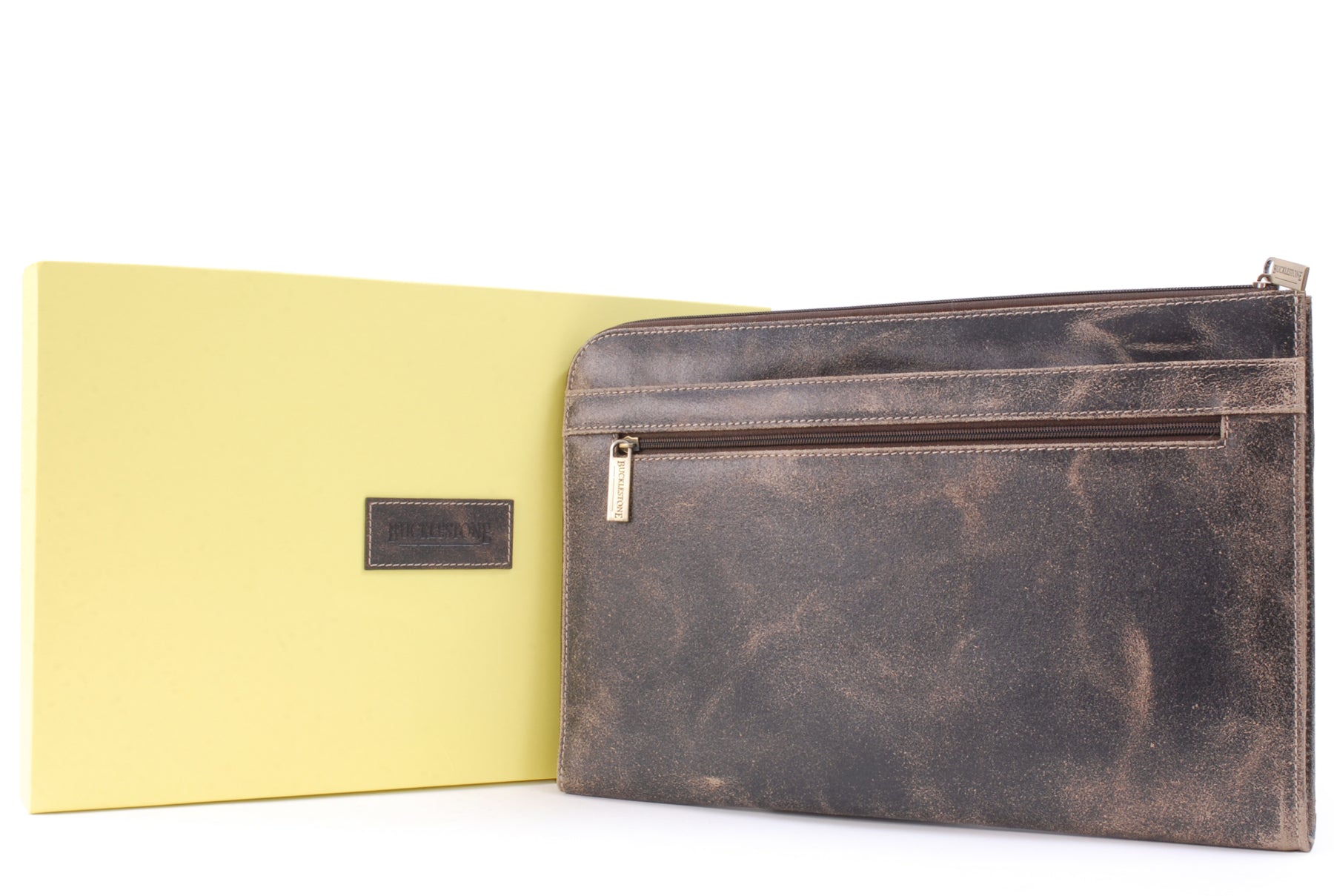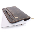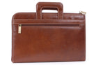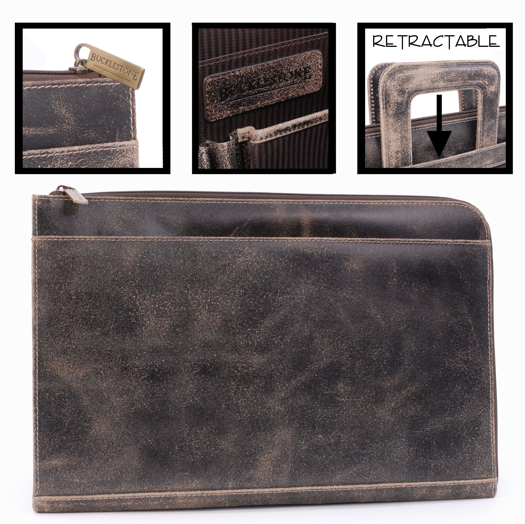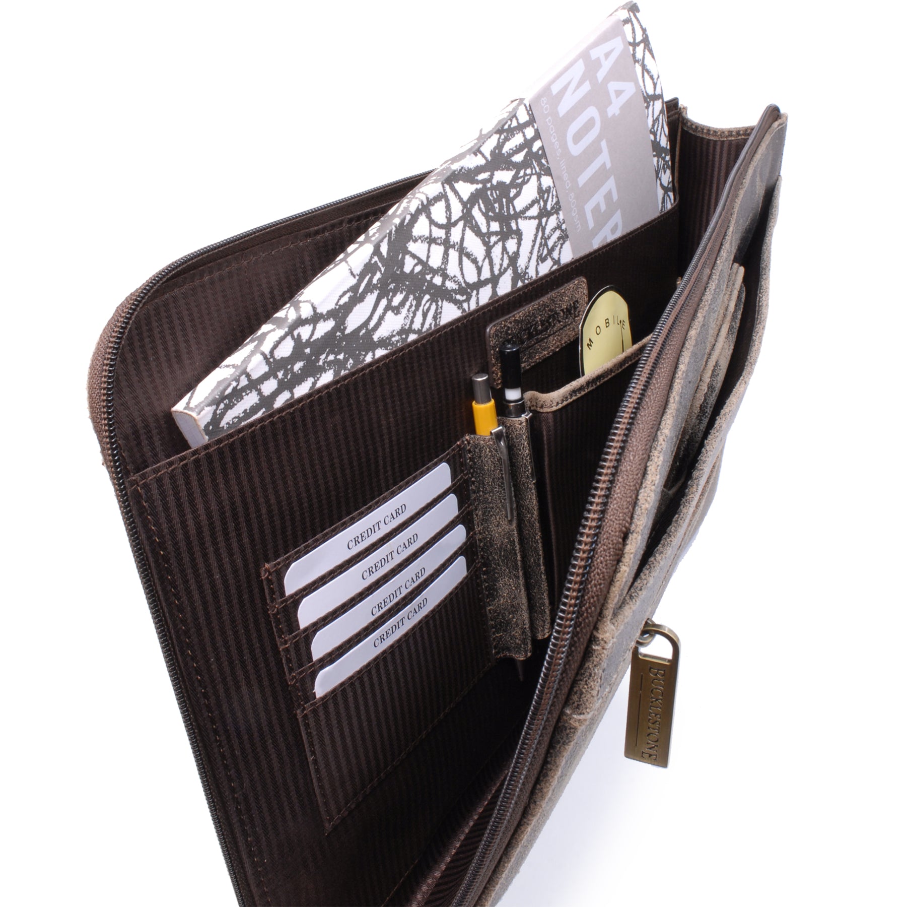 This A4 leather document folder is designed for use in business, travel, or other professional environments.This practical and versatile zip folder is designed to be the ideal blend of document folio and briefcase. Clever, retractable handles mean that this conference folder can be carried under the arm or in the hand.It can be used as a conference folder, travel document holder, or portfolio.The main compartment opens wide for access to contents. The interior includes dedicated pockets for organising items such as a mobile phone, pens, and business cards.Designed with capacity to hold tablets, slim laptops, and A4-size notebooks or documents. Interior dimensions: 35 x 24.5 x 1.5 cm.The interior is lined with a combination of leather and striped fabric. The folder includes contrast stitching and structured edges.Suitable for use as a professional A4 folder, travel portfolio, or work document holder.Distressed leather is designed to look aged or worn without weakening the overall integrity of the leather.Size: Height 25.5 cm, Width 39.5 cm, Depth 3.25 cm.Pockets: 1 Main Compartment + 1 Interior Open Pocket + 1 Leather topped Mobile Phone Holder + 2 Leather topped Pen Holders + 3 Credit Card Holders + 1 Outer Front Open Pocket + 1 Outer Front Zipped Compartment + 1 Outer Rear Open PocketMaterial: Distressed.Closure: Zip.Hardware: Antique Brass.Included: Each comes with a branded cloth dust cover.