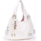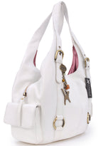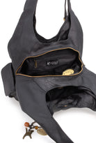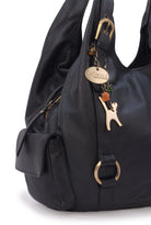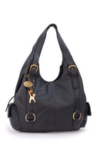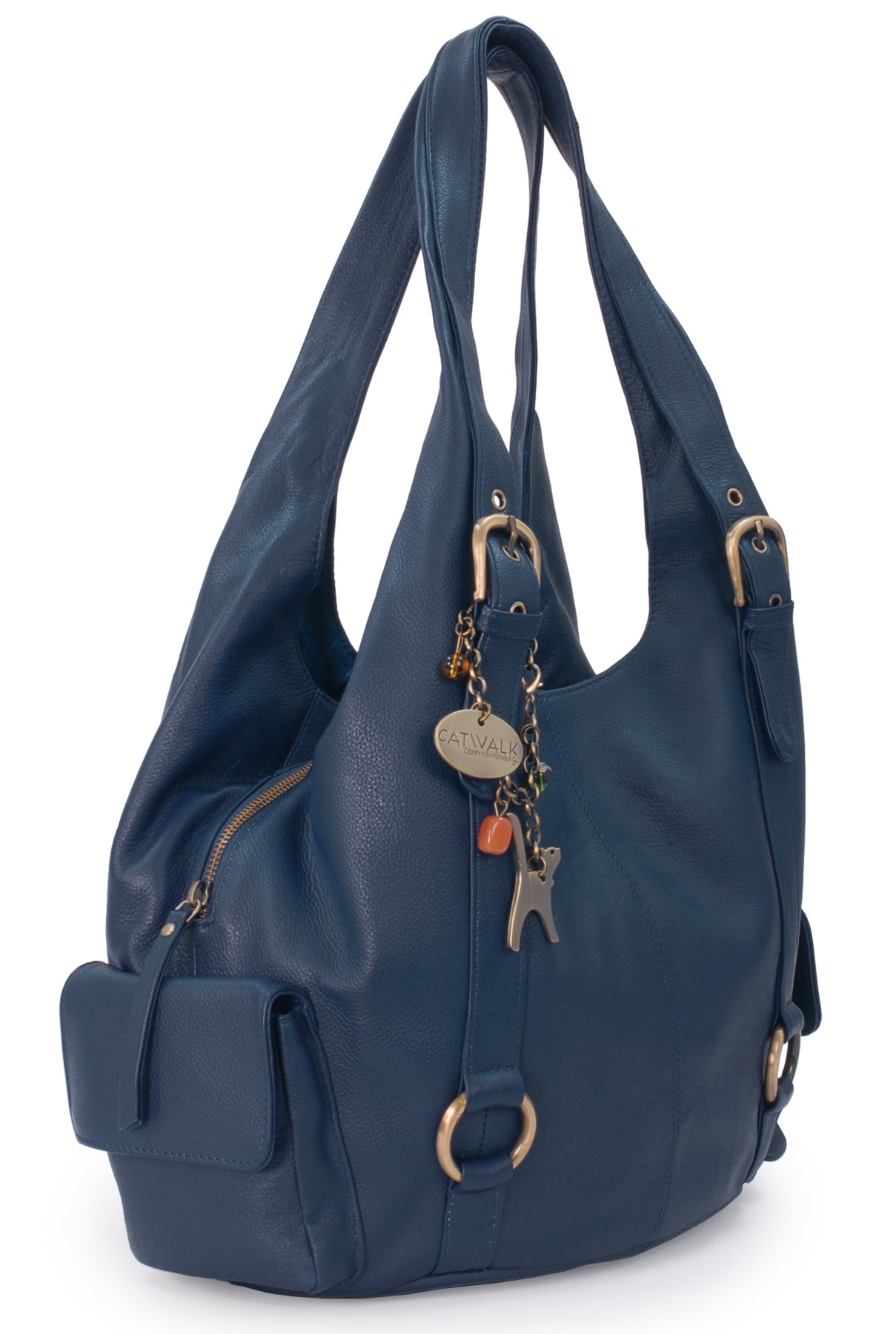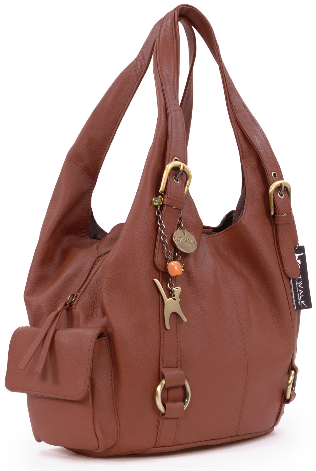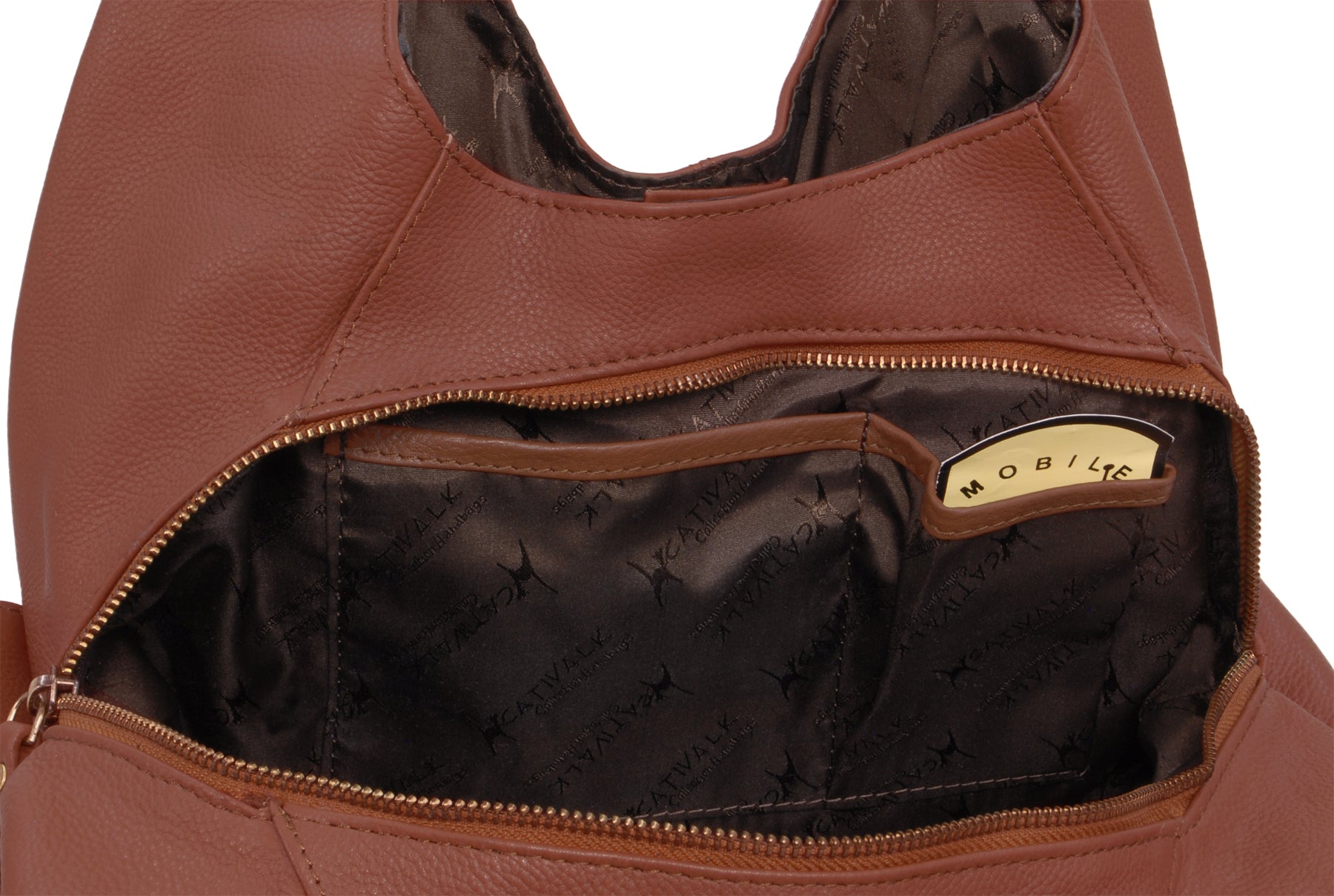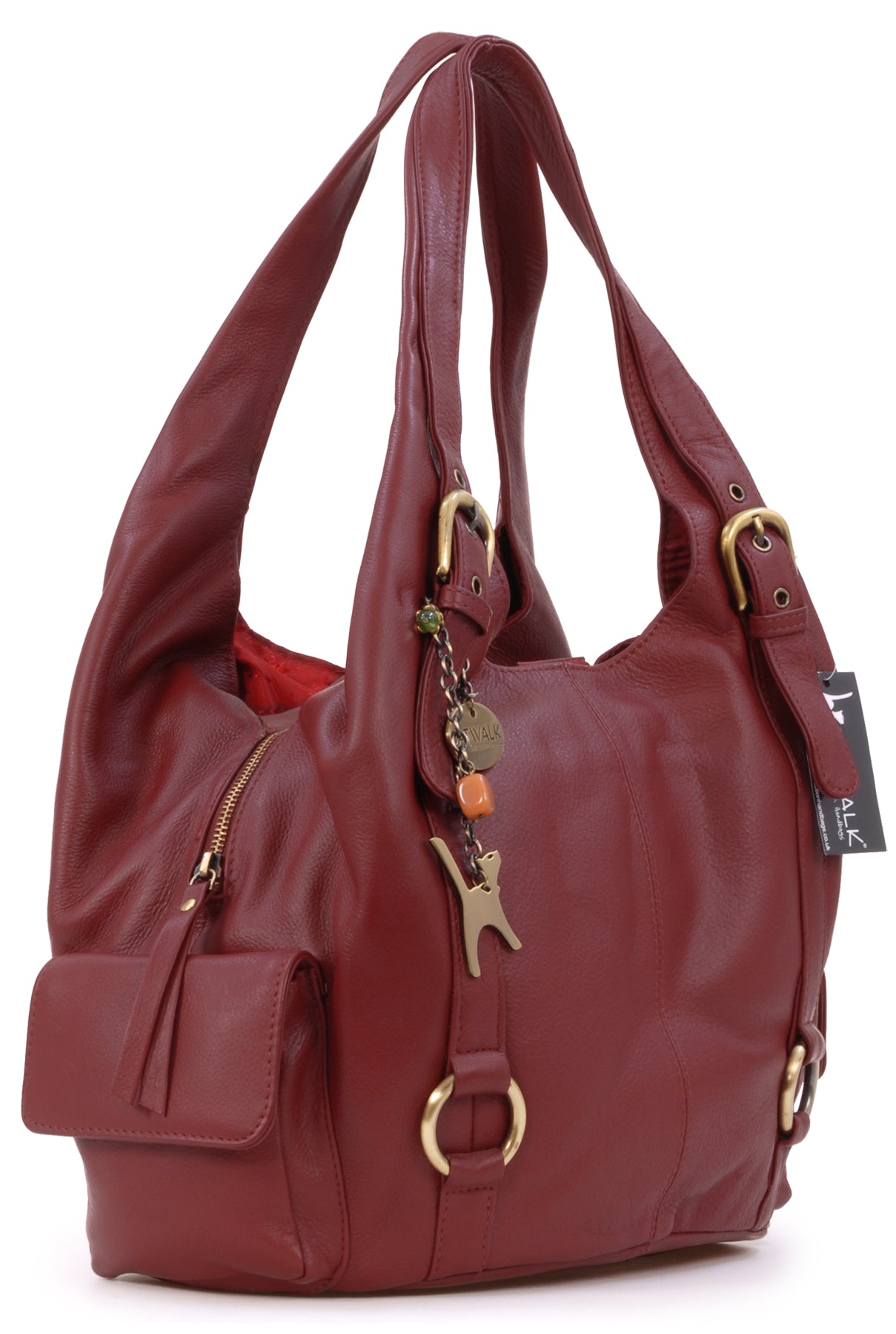 A leather bucket-shaped shoulder bag with multiple compartments and storage features.This large shoulder bag is designed for everyday use, offering substantial capacity for carrying personal belongings. The soft, unstructured design creates a slouchy silhouette that accommodates a wide volume of contents.The bucket-style structure allows for packing a variety of items with flexibility in how the space is used. The main central compartment fastens securely with a metal zip, providing enclosed storage for valuables. Additional front and rear outer pockets close with magnetic snaps for quick access to frequently used items.Multiple interior compartments and pockets support the organisation of contents, including everyday essentials such as phone, keys, makeup case, notepad, and more. Interior pocket edges are trimmed in leather for added reinforcement. The interior is fully lined and lightly padded.Long, flat handles allow the bag to be carried over the shoulder or in hand. The base of the bag is flat for stability when placed on surfaces.Suitable for use as a shoulder bag, tote bag, or large everyday handbag, with a slouchy construction and organisational layout designed to adapt to varied daily needs.