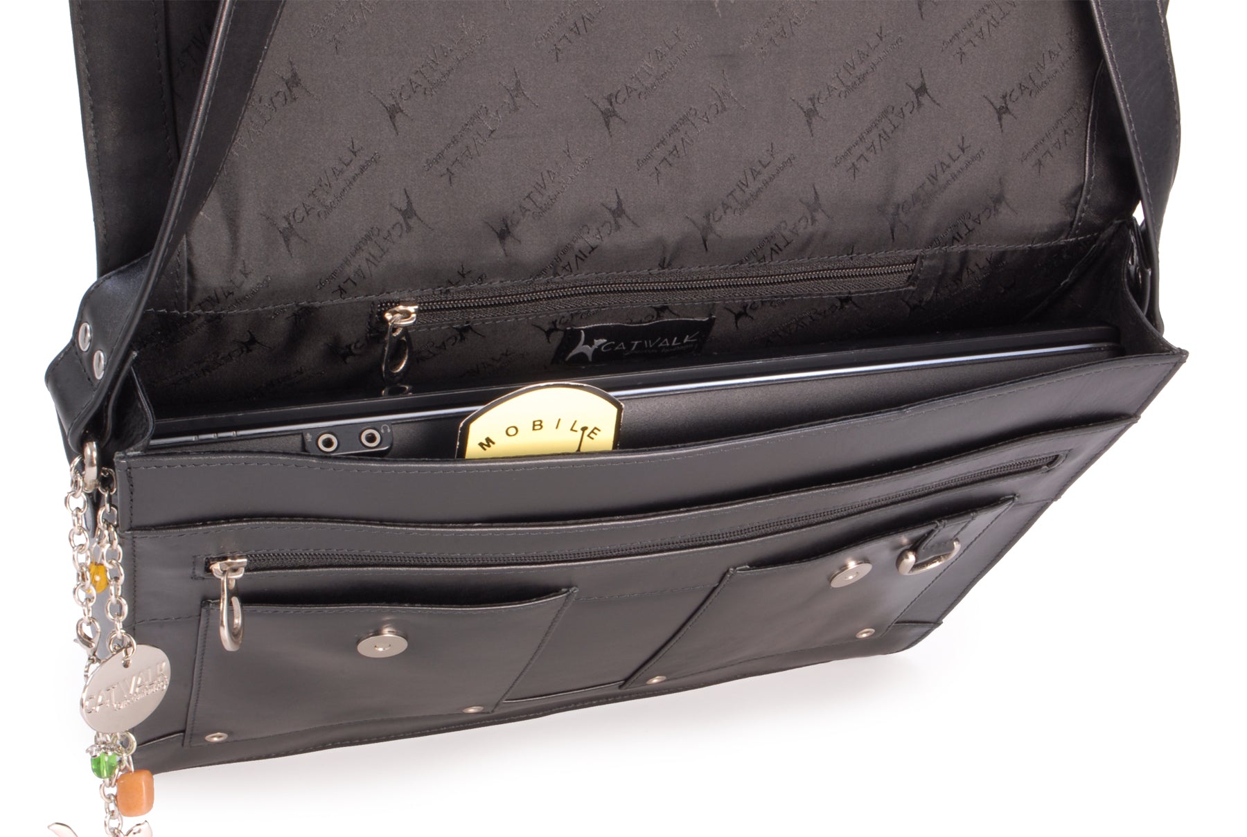 The Apprentice is a messenger-style work bag designed for office use, commuting, or business travel. The large main compartment fits A4 notepads, documents, folders, and laptops up to 16 inches, making it suitable as a business bag, document holder, or laptop bag for the office.It includes multiple internal compartments and pockets designed to organise everyday items. These include slots for pens, storage for credit cards, and a dedicated space for a mobile phone, helping to keep essential items easy to locate.A long, adjustable crossbody strap allows the bag to be worn across the body or on the shoulder, providing flexibility while travelling or moving between meetings. The exterior features silver buckle detailing and multiple zipped sections for additional storage.This messenger bag works well as a practical work bag for women, and is designed to support everyday business use, whether in the office or on the move.