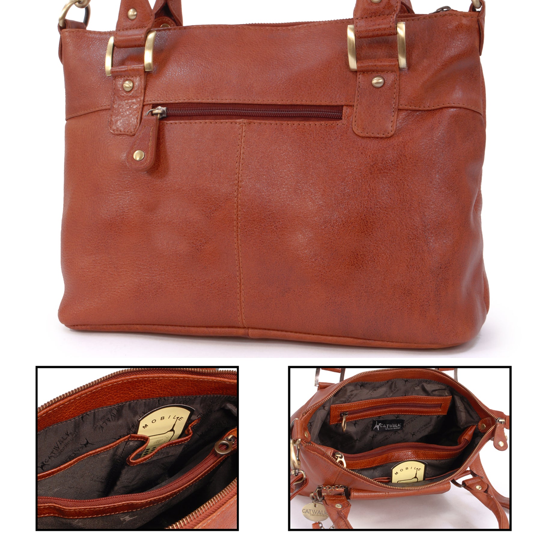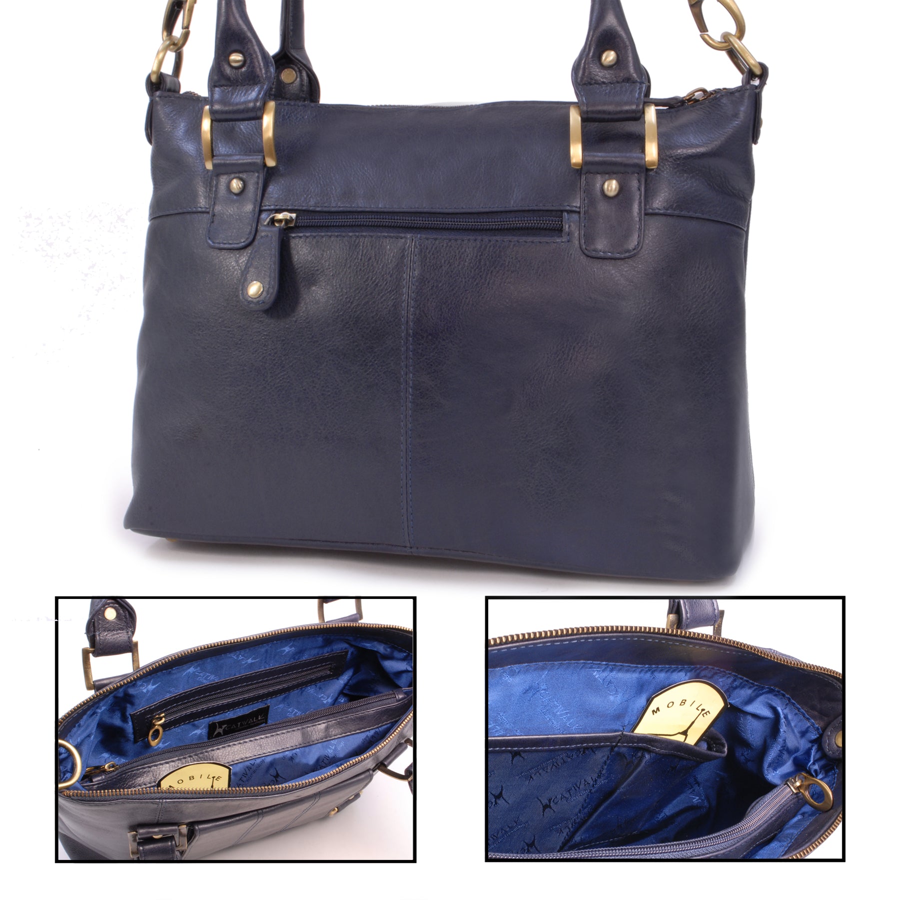 A versatile leather shoulder bag featuring an additional crossbody strap. This is a large bag offering ample capacity with multiple compartments and pockets to organise belongings. Suitable for carrying a tablet and notepad up to A4 size. Ideal as a work bag.The main compartment opens wide for easy access and closes securely with a zip. The interior is lined with signature fabric. Two interior zipped pockets provide secure storage for valuables.Under the decorative front flap is a convenient ID window, ideal for photo ID cards, bus passes, travel tickets, or health cards. A zipped outer pocket is located on the rear of the bag for extra storage.Handles are rolled for comfort when carrying by hand. The bag can be worn on the shoulder. The long detachable, adjustable crossbody strap allows for over-the-shoulder or hands-free crossbody wear.The base of the handbag is flat and features studded feet for stability and protection.