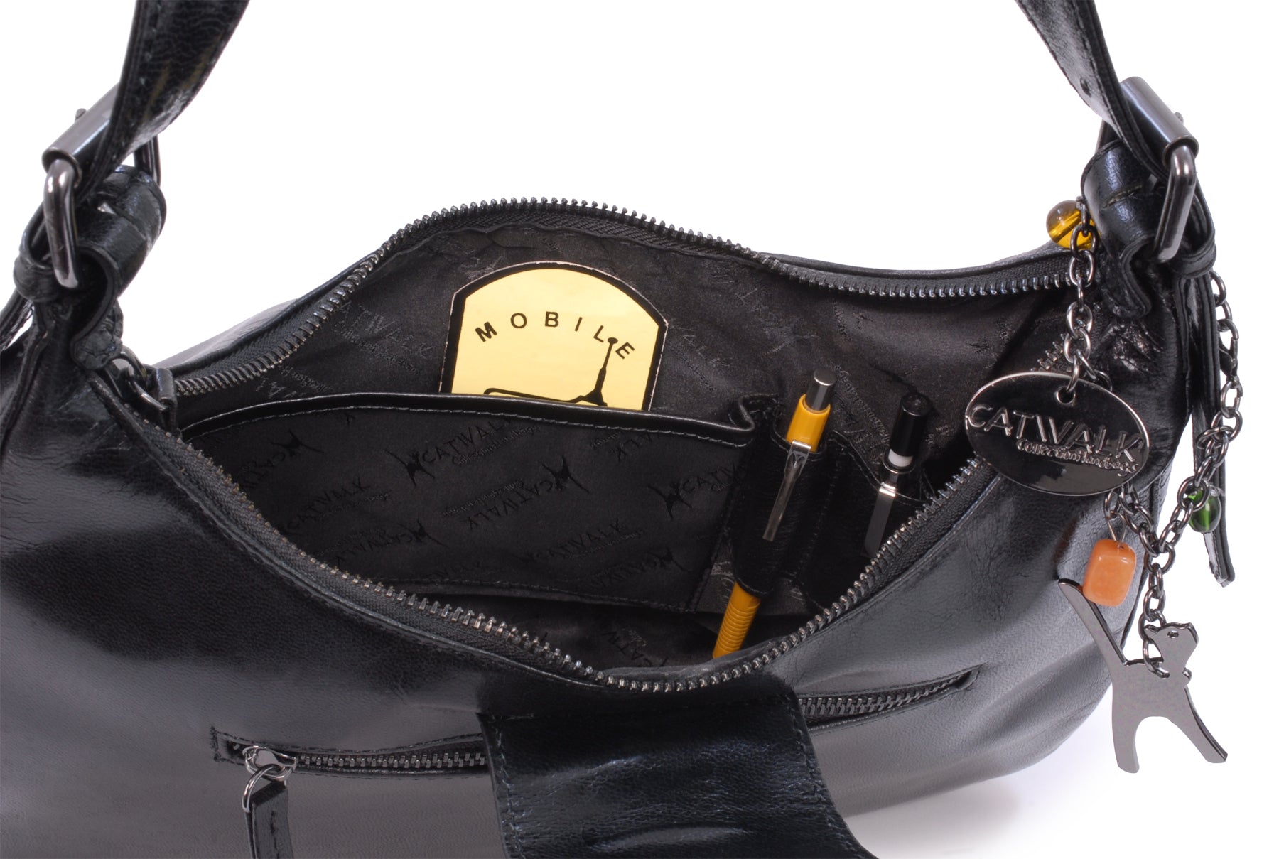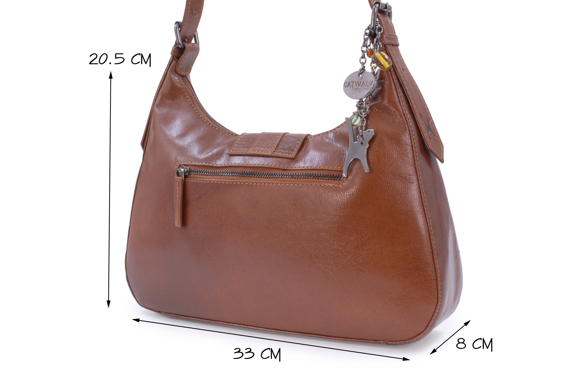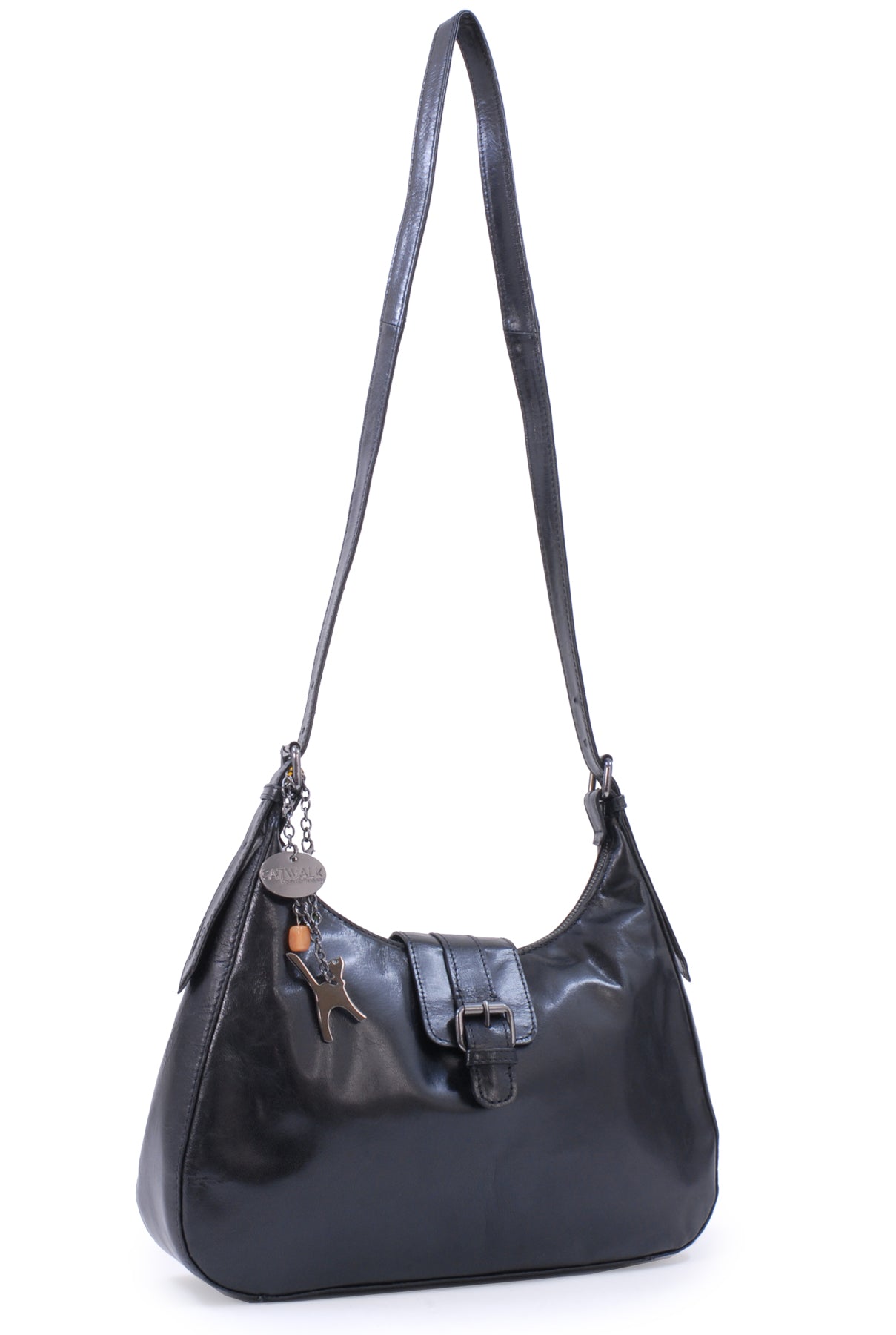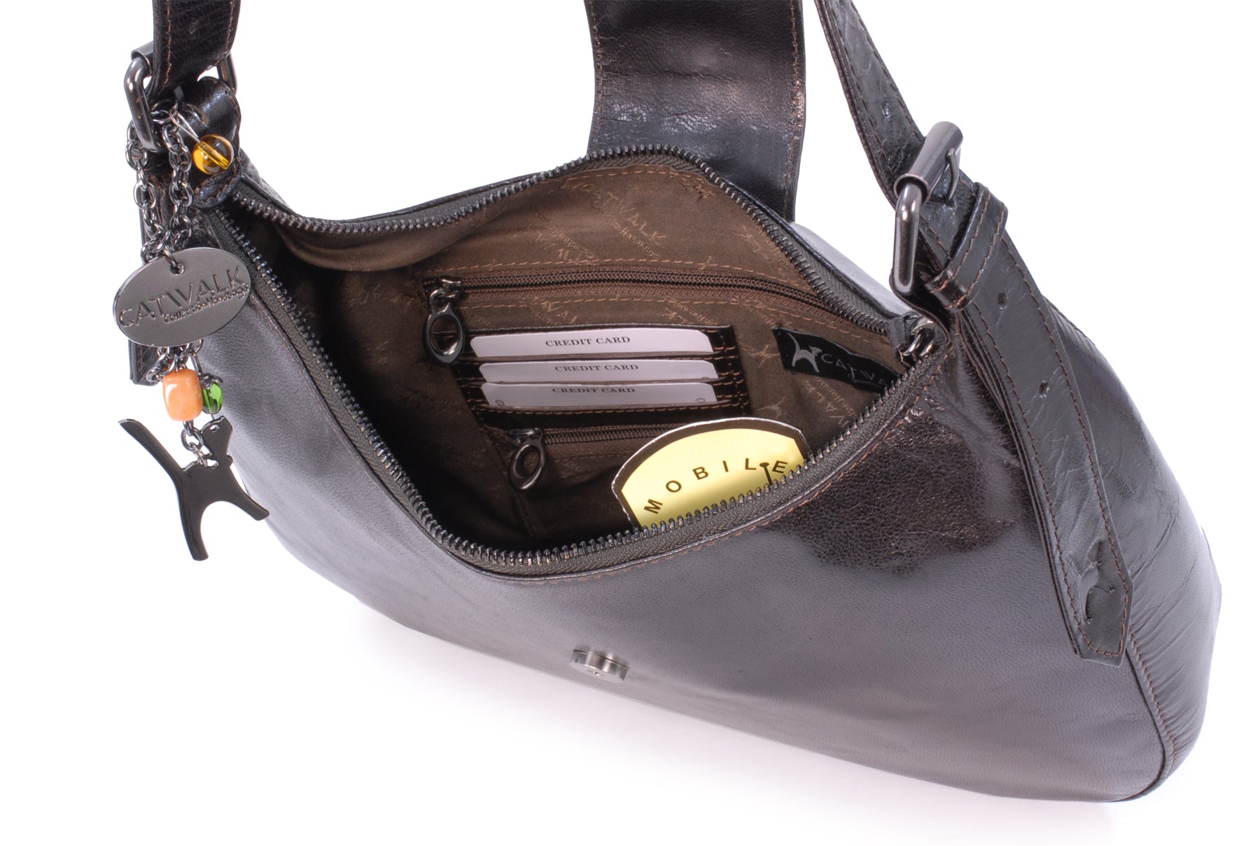A long, adjustable leather strap allows it to be worn comfortably on the shoulder or across the body, providing hands-free convenience. The strap is embossed with the Catwalk Collection Cat Logo, adding subtle brand detailing. Inside, the signature fabric lining and leather-trimmed pockets give a tailored finish. Gun metal fittings complete the look, making this a functional option for carrying a purse, make-up case and daily necessities while keeping contents secure and accessible.