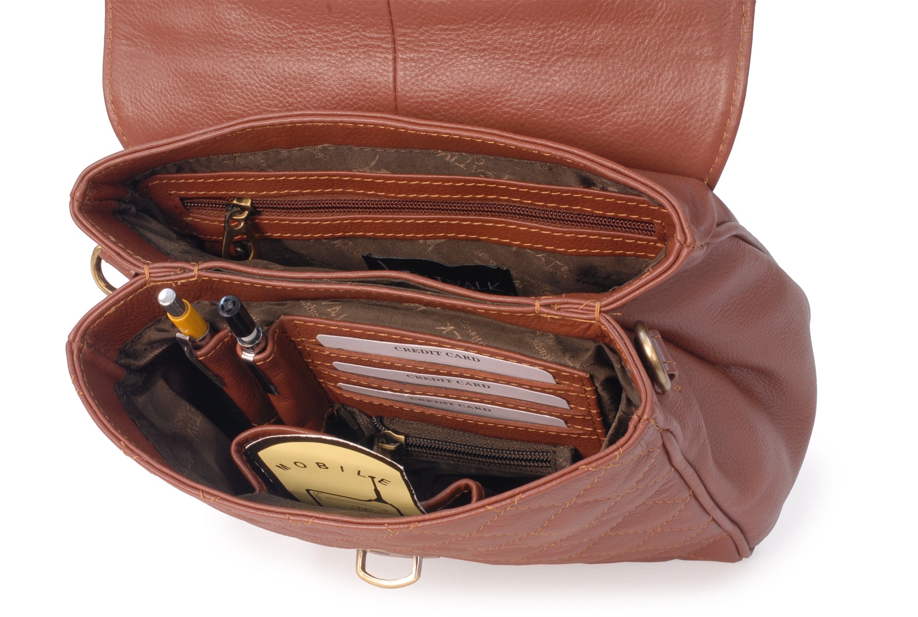 Pockets: 2 Main Compartments + 1 Slim Central Open Pocket + 1 Interior Side Zipped Pocket + 1 Leather topped Mobile Phone Holder + 3 Credit Card Holders + 2 Pen Holders + 1 Zipped Coin Pocket + 1 Key Fob