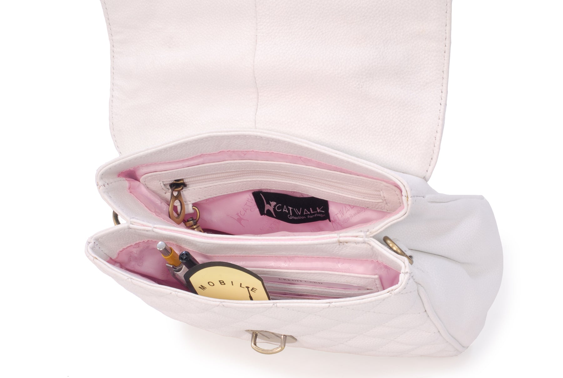 The interior includes multiple compartments and organisational features such as dedicated pockets for pens, credit cards, and a mobile phone. The flap-over closure with a push-lock fastening provides both accessibility and security, while the flat base helps the bag stay upright when placed on a surface. This mid-sized, structured handbag is suitable for everyday use or special occasions, with storage space for daily essentials and personal items.
