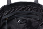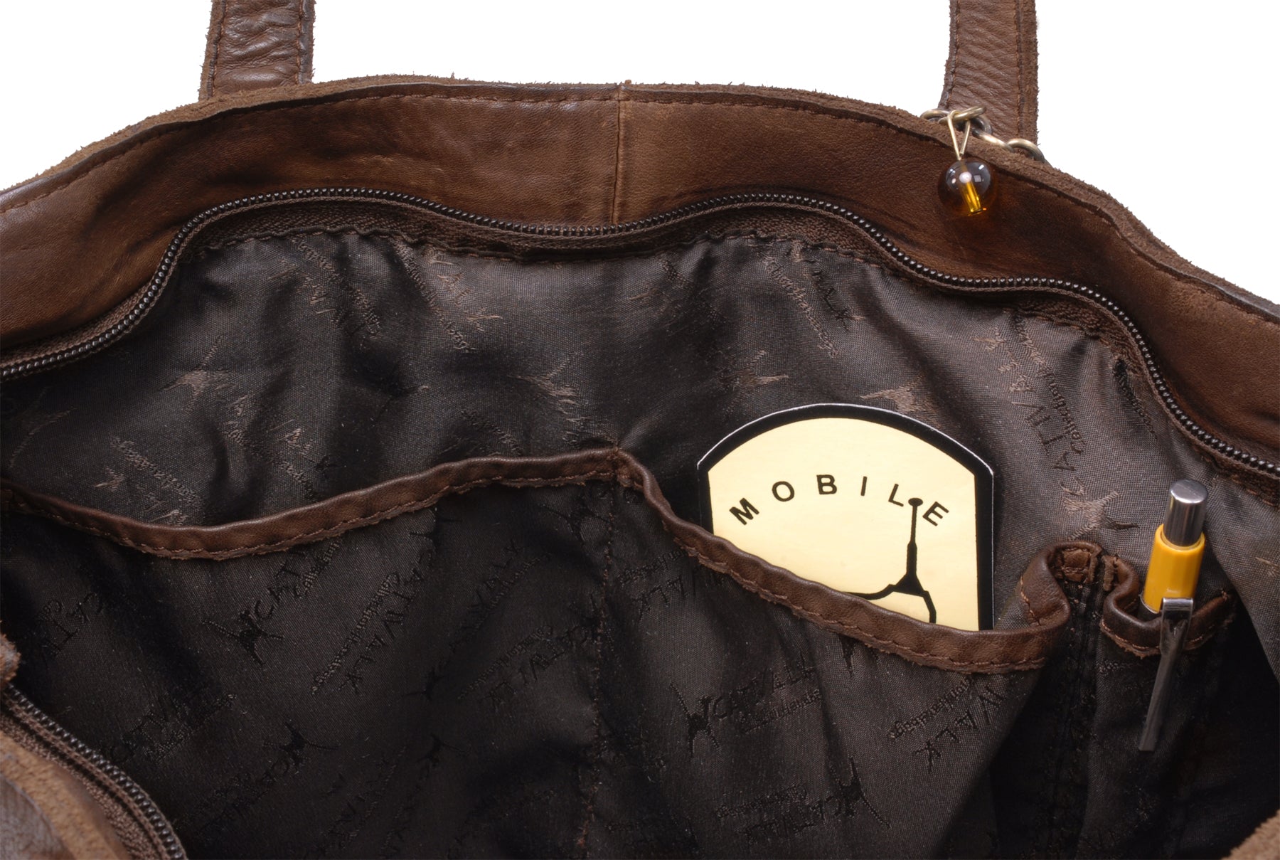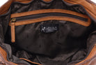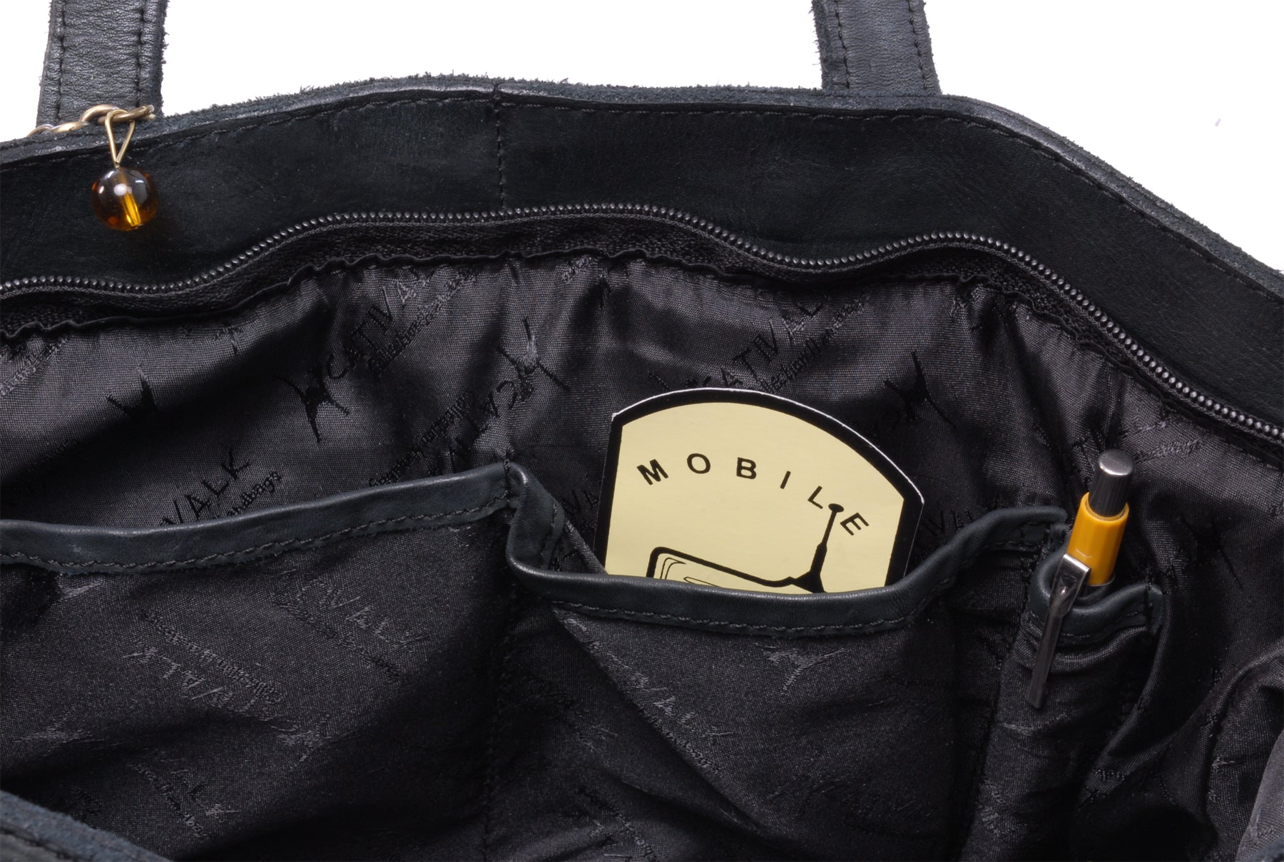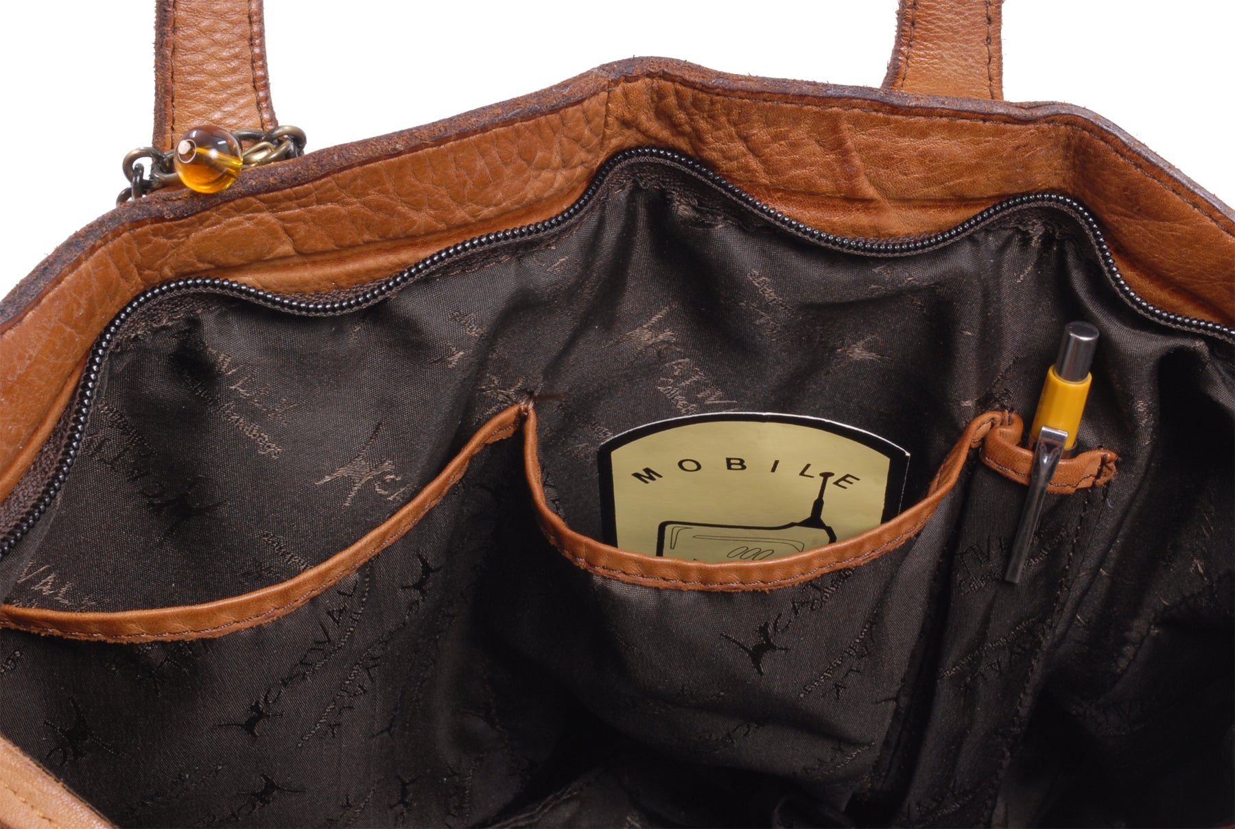 The interior is beautifully lined with signature fabric. Interior pockets are reinforced with leather trim for a touch of luxury.