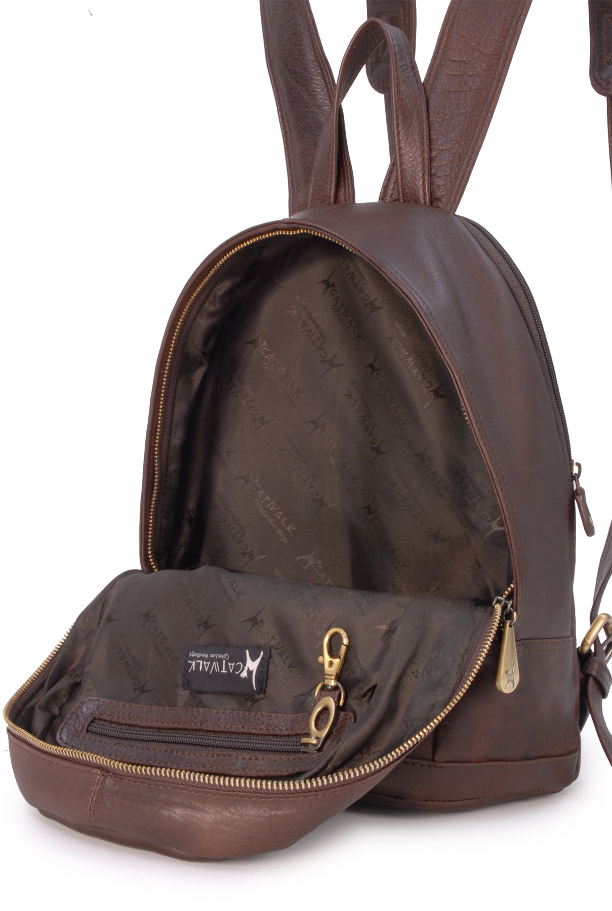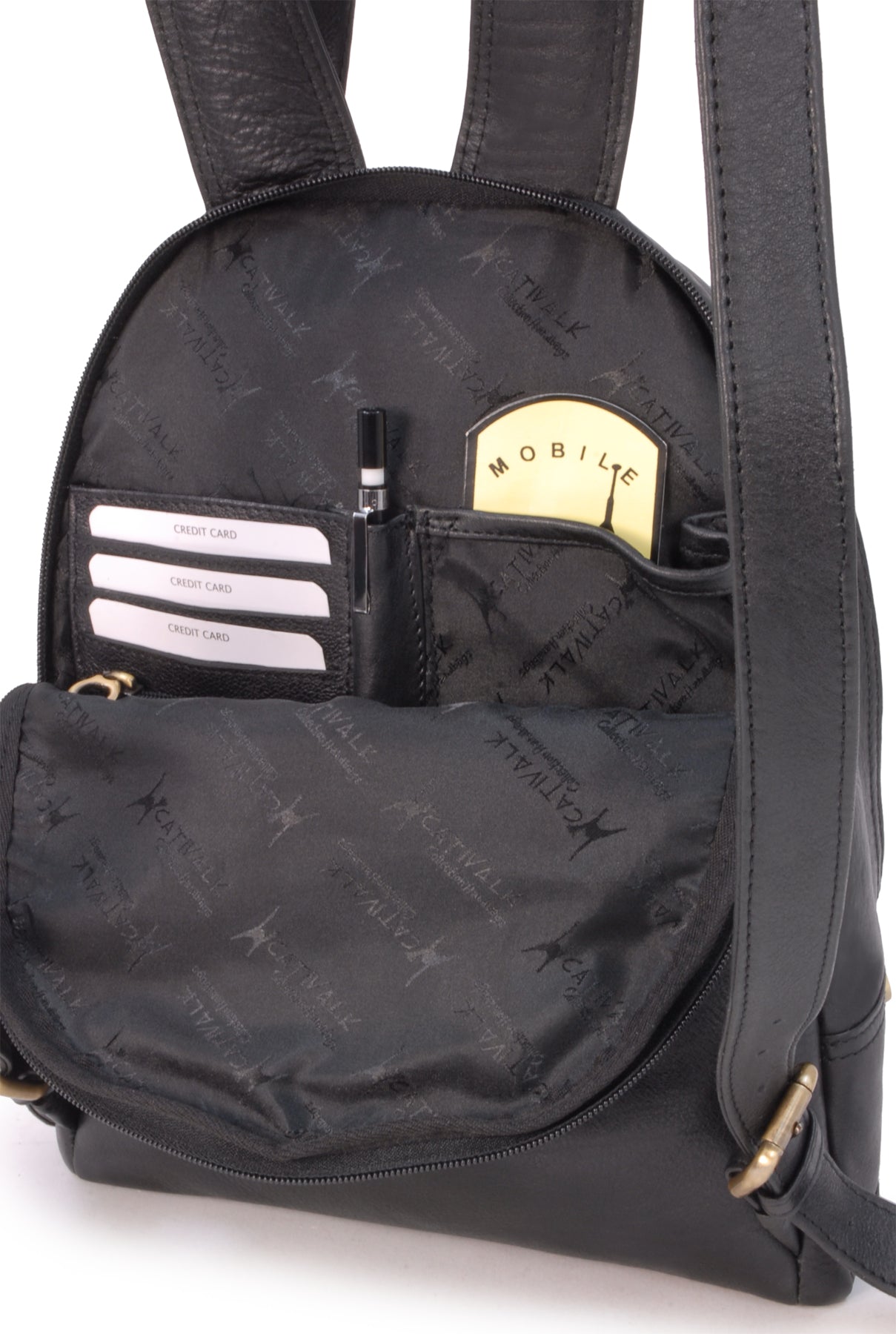 This large leather backpack is a versatile option for work, commuting, travelling, or daily use. The main compartment offers generous space for storing essentials, while multiple interior and exterior pockets help keep everything organised. Adjustable leather shoulder straps provide a comfortable fit and can be worn high or low on the back, even over thick coats. A sturdy grab handle adds flexibility when carrying by hand.The anti-theft design includes rear access to the main compartment, keeping valuables close to your back. Roller buckles at the front can be undone and threaded around the back of a chair, adding a layer of protection in busy environments like cafés or restaurants.Inside, there are dedicated pockets for credit cards, coins, a phone. This bag fits eReaders and tablets up to 26 x 18 cm. A hidden zip pocket at the back is ideal for storing a passport or travel documents, deterring pickpockets. The front compartment is designed for less valuable items such as an umbrella, water bottle, glasses, or paperback, and fastens with a concealed zip for a streamlined appearance.Brass zip pulls are engraved with the Catwalk Collection cat logo, and a brass-plated logo plate features on the front. The flat base helps keep the rucksack upright when set down. This leather travel backpack is both practical and secure, ideal for commuting, office use, city breaks or daily routines.