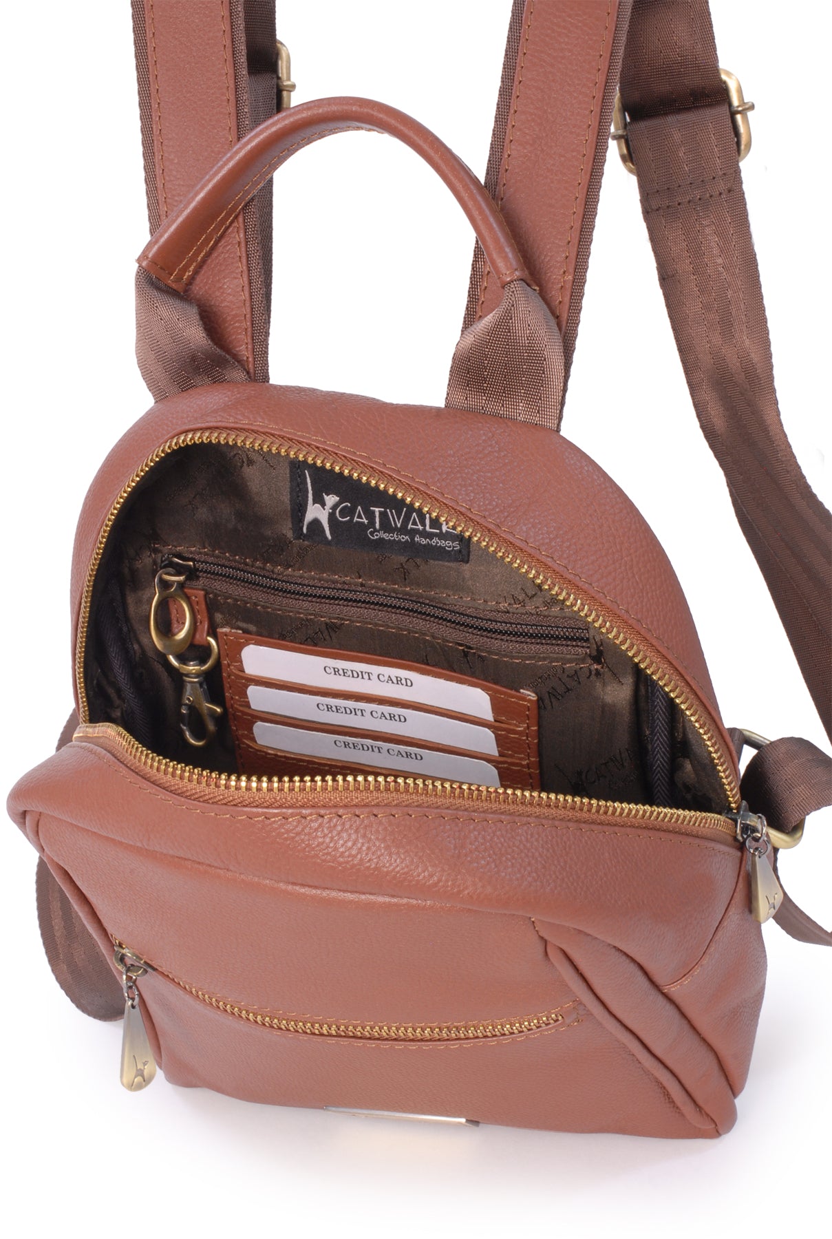 A practical leather backpack with secure zip fastening.This is a small to medium sized bag. It can accommodate pocket diary, purse, make-up case and umpteen other handbag essentials.Organisational features include pockets for pens, credit cards and mobile phone. There is sufficient capacity for a tablet or eReader and notepads up to A5 size.The bag opens wide for easy access and fastens securely with a metal zip. The Catwalk Collection Cat Logo is imprinted onto the brass zip pull. Long shoulder straps can be adjusted to fit any size; extend over thick coats or wear fashionably low on your back. This bag also has a handy leather grab handle.The interior is lined with signature fabric.The Catwalk Collection Cat Logo is imprinted into a brass plate attached to the front panel.The base of the bag is flat for stability when placed on surfaces.
