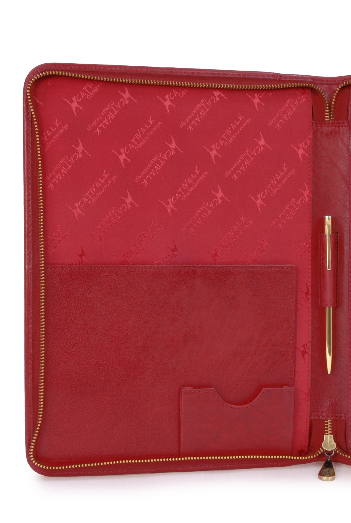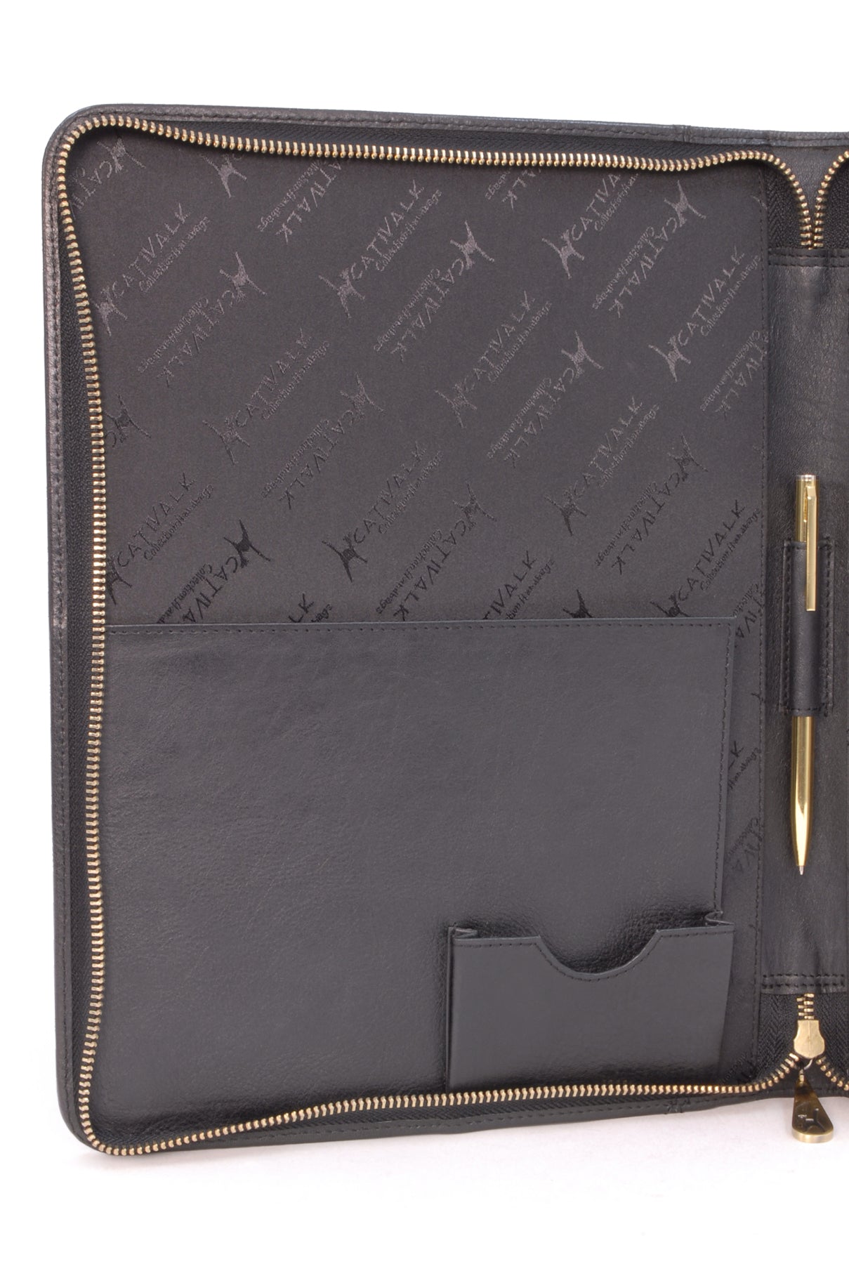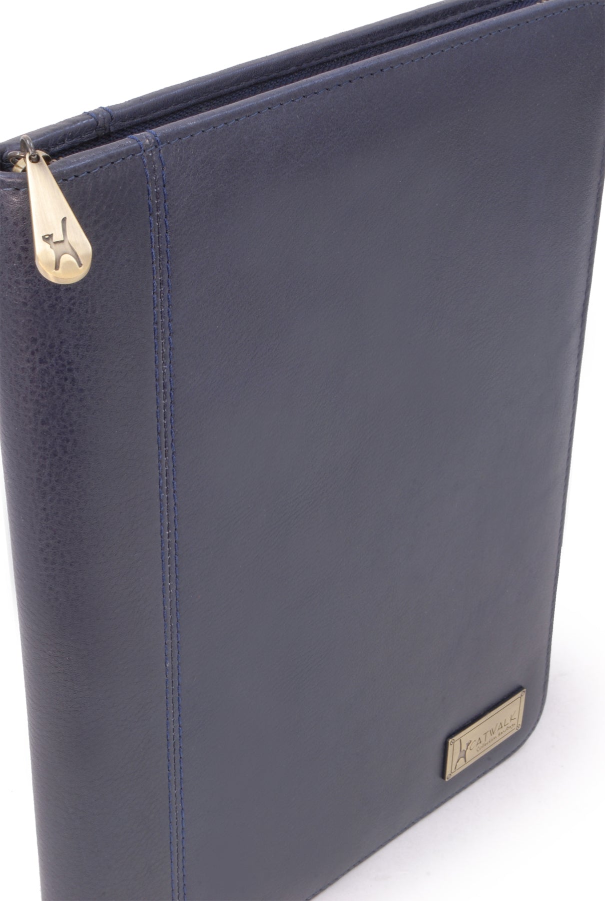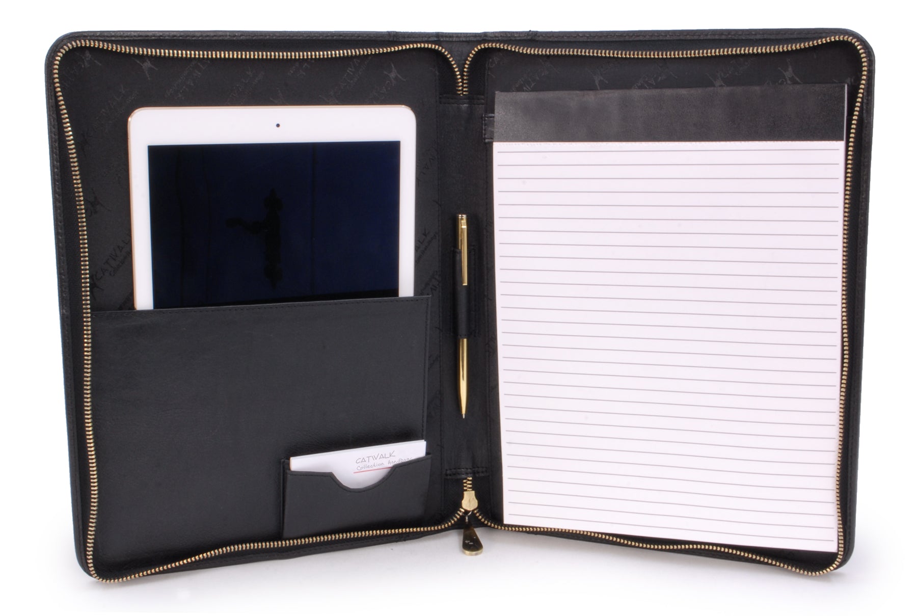 This is a practical yet stylish A4 document holder designed for use at work, college, or university.This leather zip folder includes a notepad and can be carried under the arm. It functions as a conference folder, portfolio, or travel document holder. A solid brass zip pull features the Catwalk Collection Cat Logo. The interior is lined with a combination of leather and branded fabric.Interior dimensions are 31 x 23 x 2 cm. Organisational features include pockets for a pen, business cards, and an A4 notepad. Notepads can be inserted from the top or the side.Designed to hold tablets or eReaders up to 11 inches. Devices can also be placed behind the leather interior panel.Each item is supplied in a gift box, making it suitable as a gift.The leather matches a selection of Catwalk Collection Handbags: Fern, Gallery, Sienna, Victoria, Vicky, Isla, and Emma.For a smaller A5 version of this folder, see the 'Angela' range.