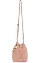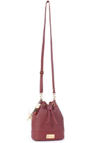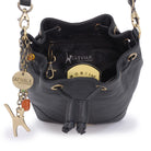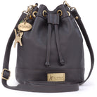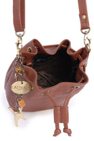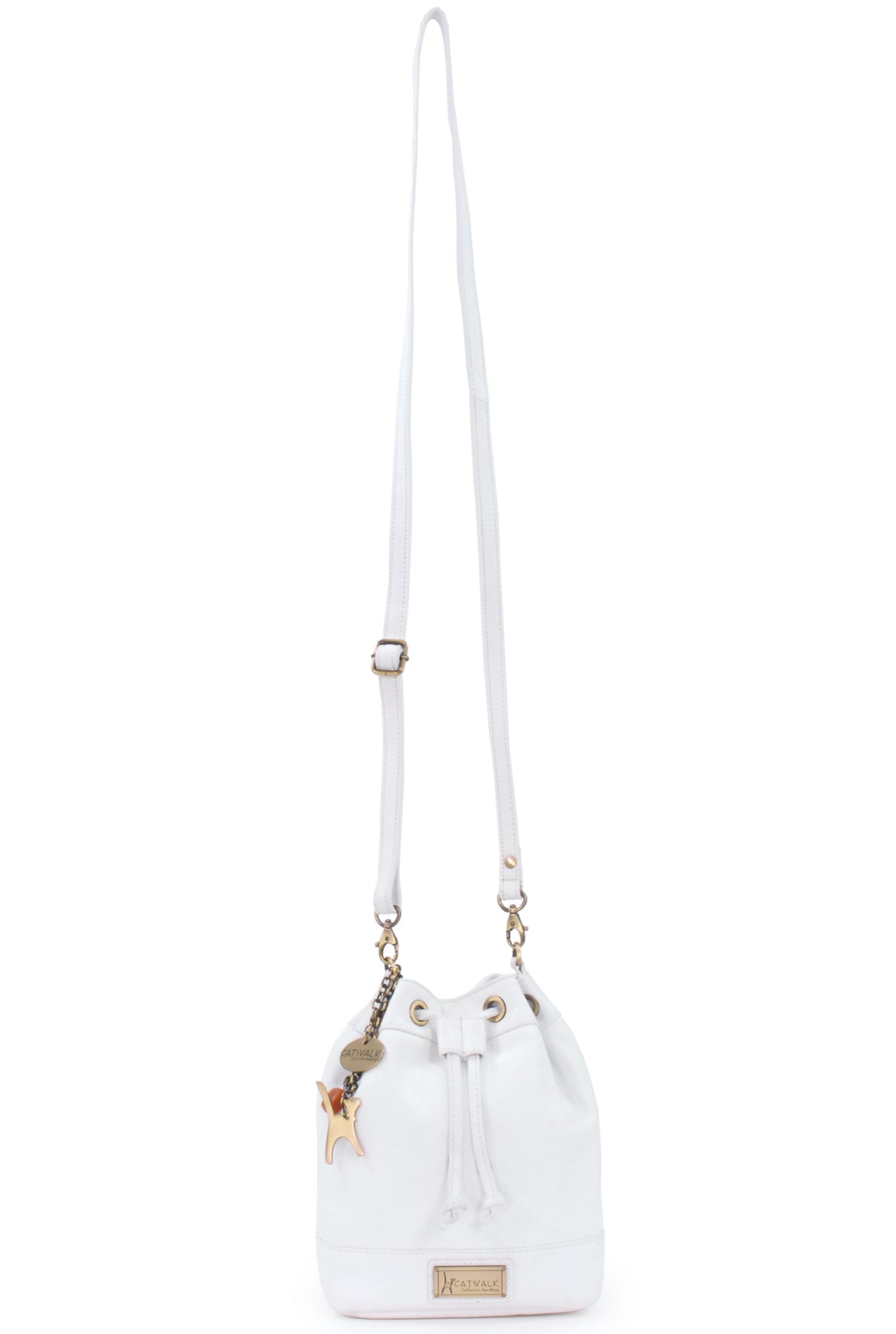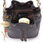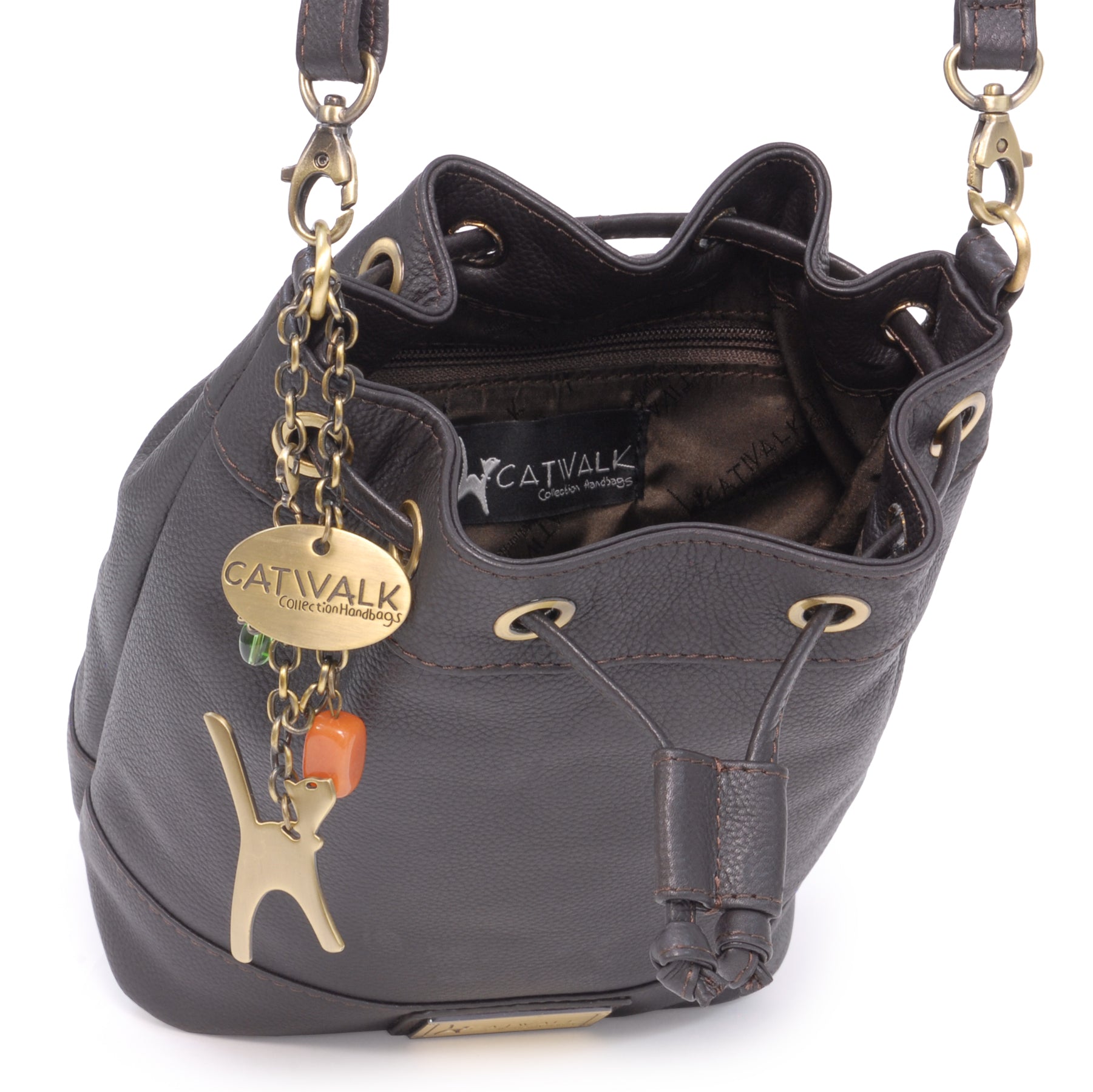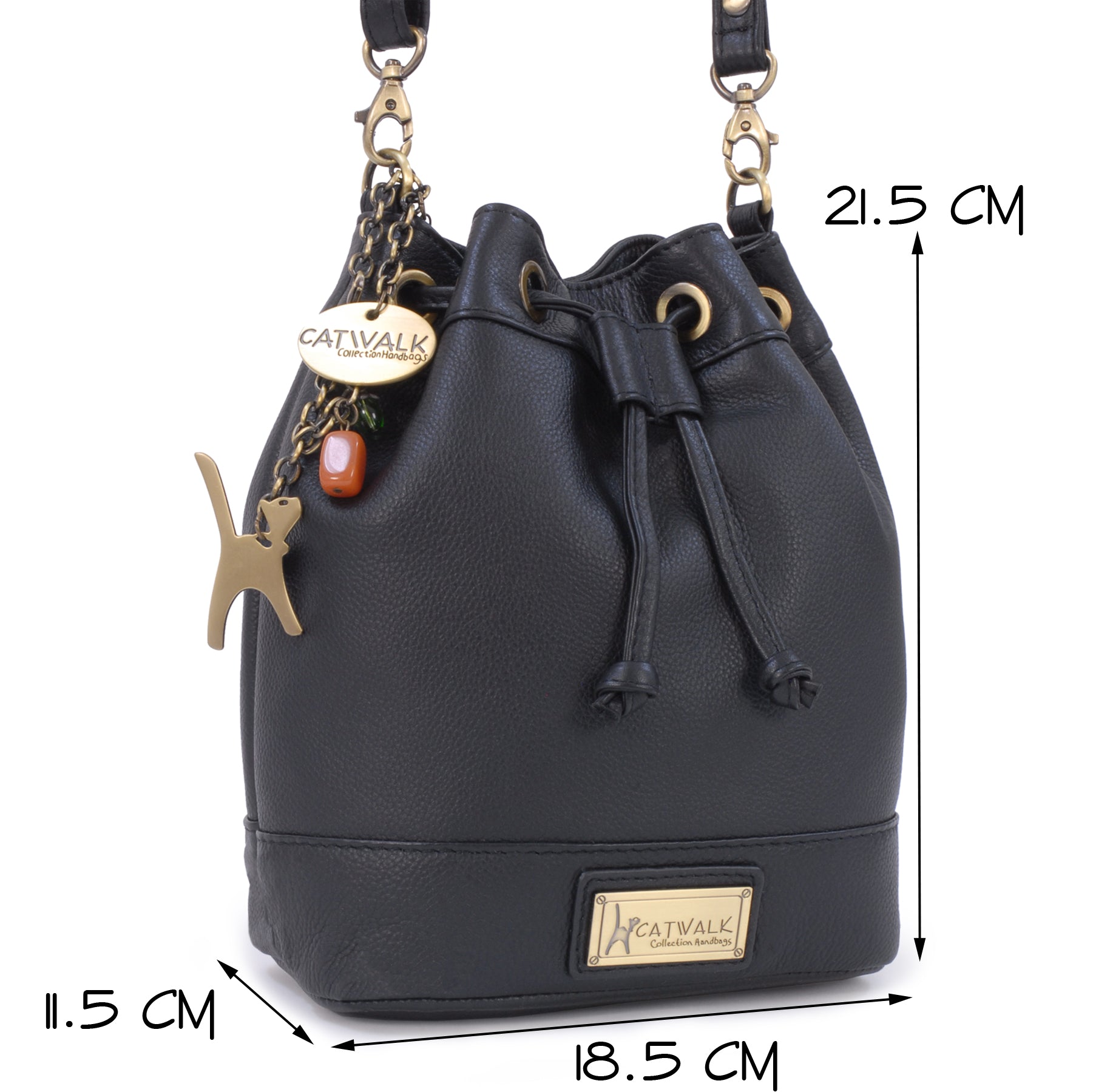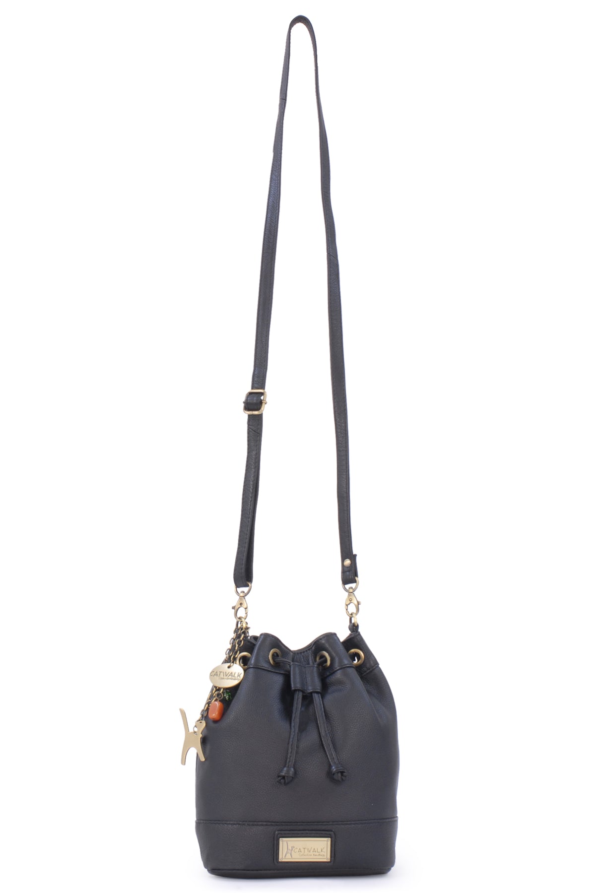 A compact leather crossbody bag with a drawstring closure, designed for effortless style and everyday practicality. Ideal for shopping trips, casual outings, and evening meals.This stylish drawstring bucket bag is crafted from ruched soft leather and finished with decorative brass eyelets and a robust leather drawstring. The simple bucket silhouette is both functional and contemporary.The compact shape opens up to a roomy interior with well-placed organisational pockets, making it easy to store essentials while on the move. The drawstring closure ensures quick access while keeping contents secure. The interior is lined with signature fabric.An adjustable, detachable leather strap allows the bag to be worn comfortably over the shoulder or hands-free across the body, offering versatility for different occasions.The Catwalk Collection Cat Logo is stylishly imprinted into a brass plate attached to the front panel. The base of the bag is flat, offering structure and stability.