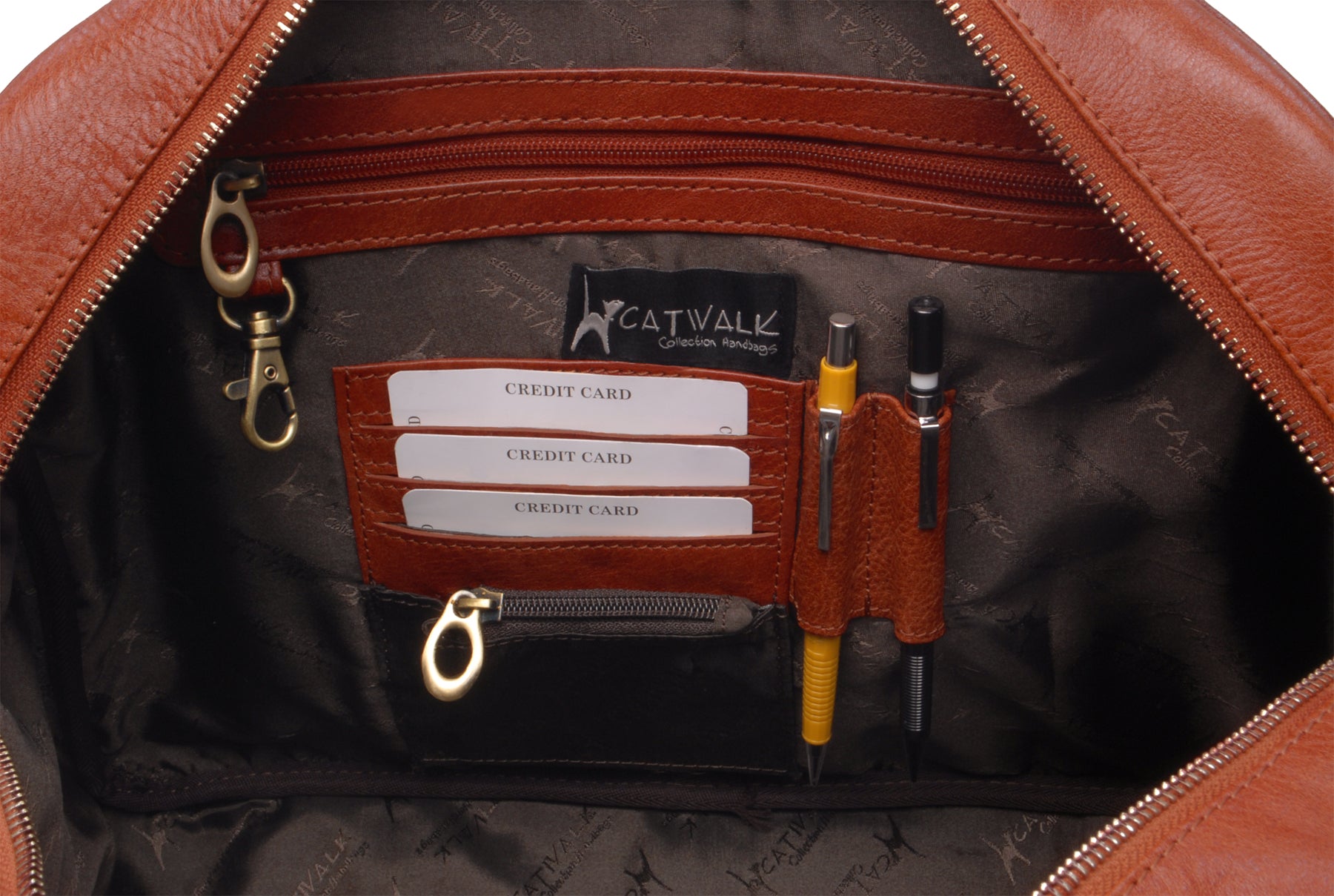 Inside, the bag is fully lined with branded fabric and pockets are reinforced with leather trim to support regular use.. The base is flat and supported with studded feet to keep it upright and protected from wear.