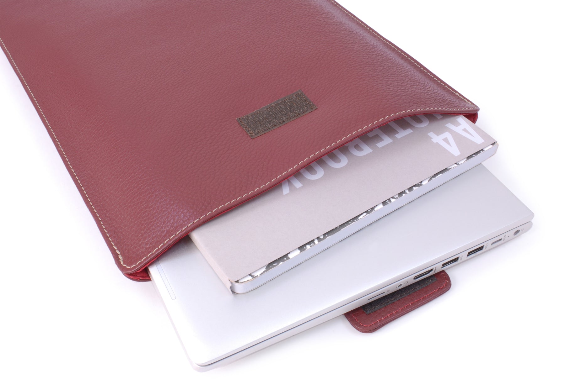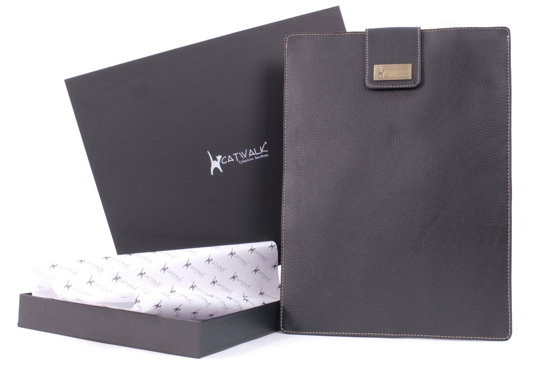 This leather laptop pouch is designed to withstand the daily rigours of business, leisure, and travel.Carry laptops and tablets up to 15.6 inches safely and stylishly. Interior capacity: 38 x 26 x 1.8 cm. The flap-over design with Velcro fastening provides secure closure. The interior is fully lined and slightly padded for added protection.Contrast stitching highlights the features of the laptop sleeve. The Catwalk Collection Cat Logo is imprinted on a brass plate attached to the front panel.The sleek and simple design offers a slim, streamlined profile that effortlessly slides into briefcases and backpacks for easy portability. An ideal choice for busy professionals, combining practicality with flair.Presented in a gift box. Suitable as a gift for women on occasions such as Valentine’s Day, Mother’s Day, birthdays, and Christmas.