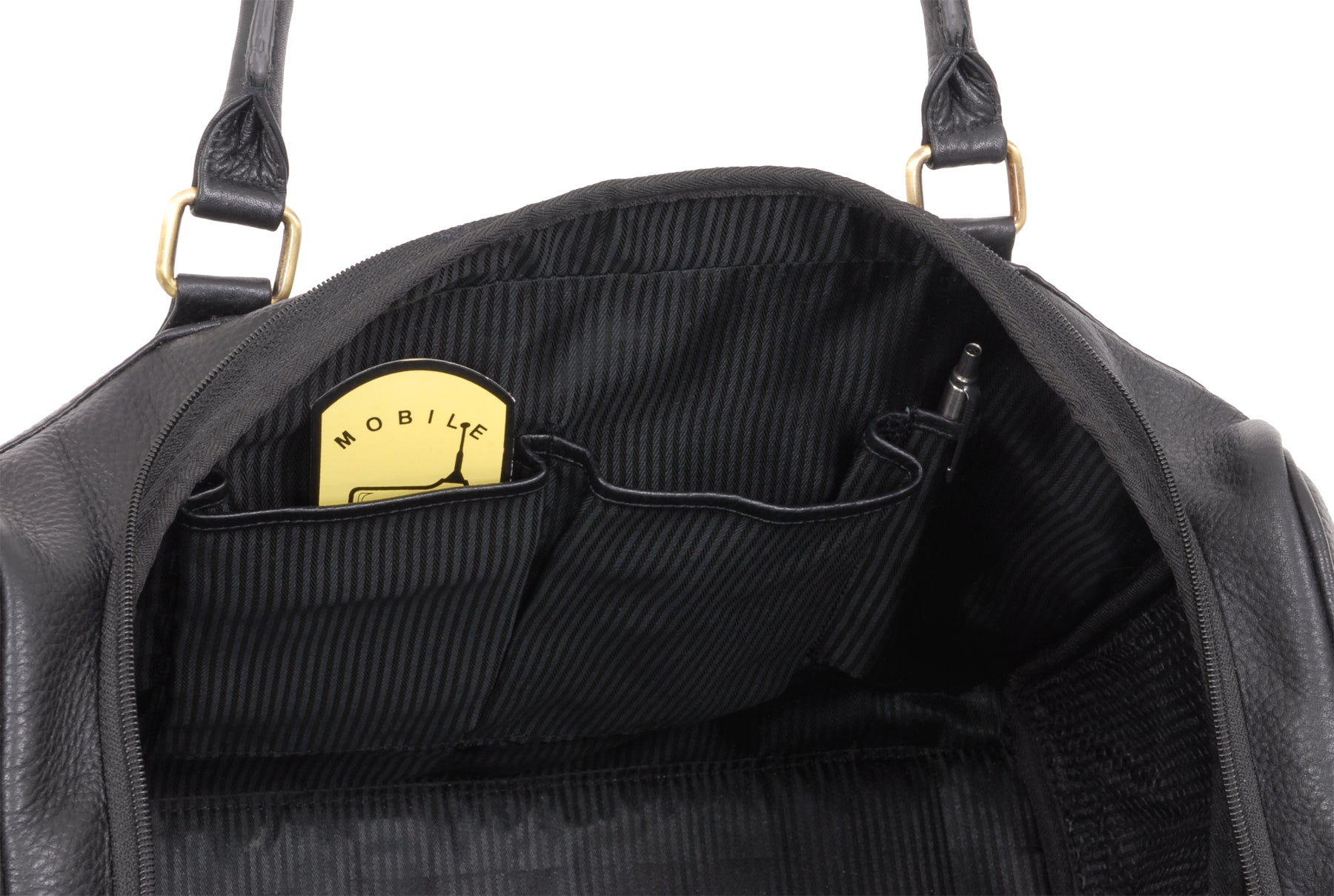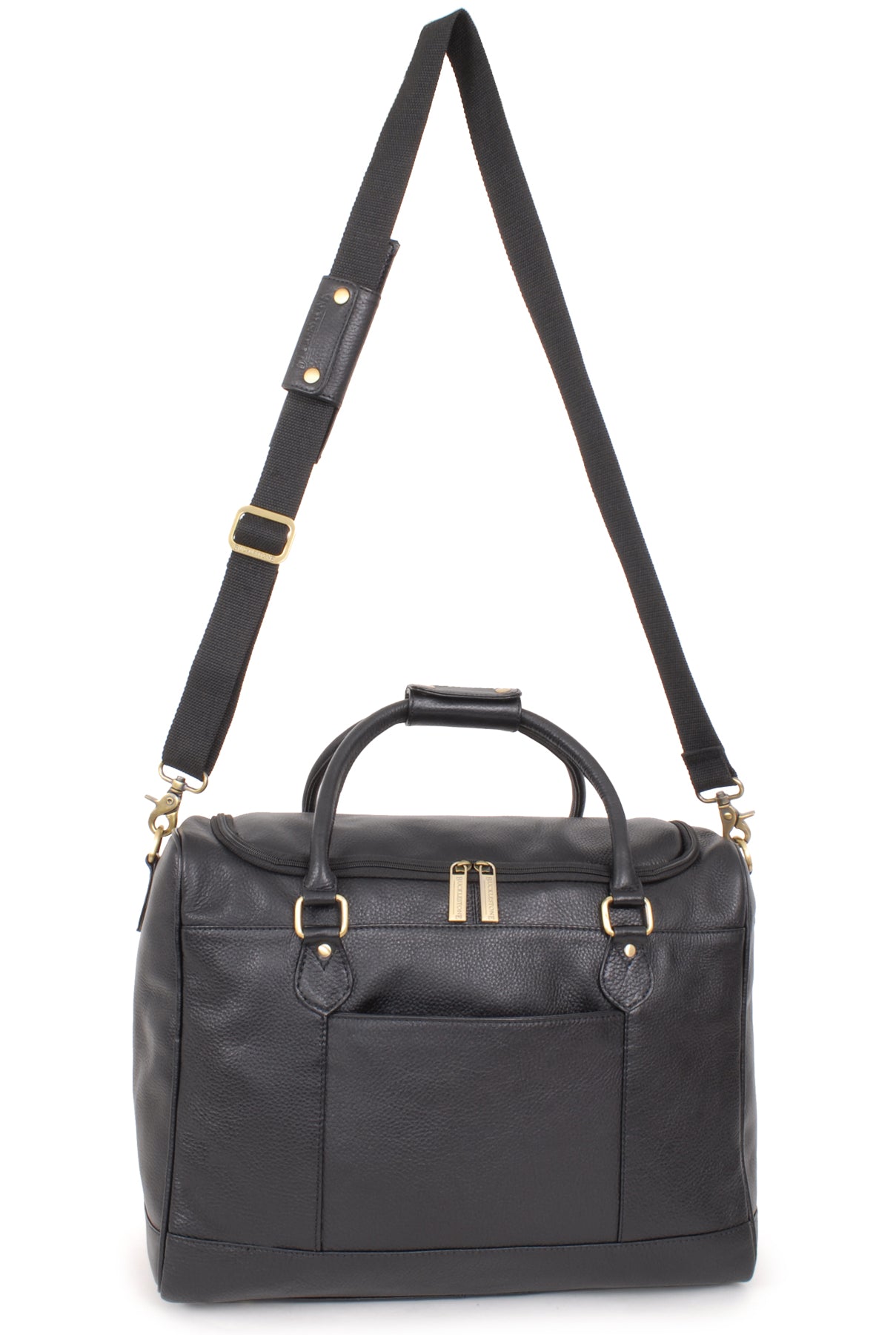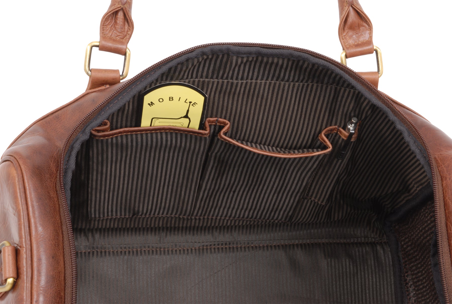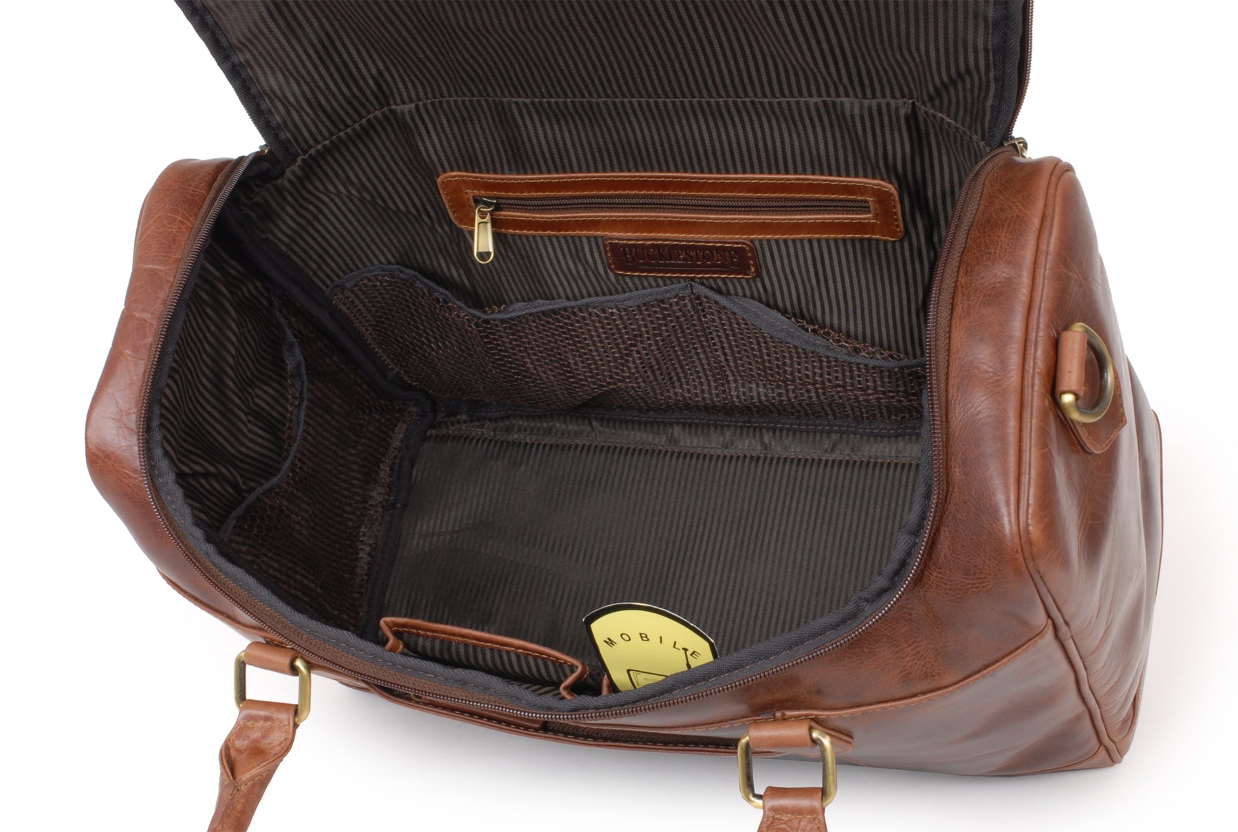 This leather holdall is ideal as a weekender bag or travel bag for men. It is designed to fit as a cabin bag in the overhead storage on the majority of worldwide airlines. Compact yet spacious, it offers multiple compartments and pockets to keep belongings organised.The front zip pocket includes an open pocket that can hold two passports, allowing secure and convenient access while travelling. The holdall has two rounded handles that can be secured together with a leather handle grip for comfortable hand carry.A long detachable crossbody strap is included. The strap can be adjusted to carry the bag on the shoulder or across the body. A padded shoulder pad is also provided to help distribute weight and add comfort. The strap is made from fabric for durability and the shoulder pad is lined for slip-resistant wear.The top of the holdall features a wide U-shaped zip. This design opens up the entire top of the bag, making it easy to see and access the contents inside. The base of the bag is flat with metal feet to protect the leather and to keep the holdall upright on surfaces. The back of the bag features a leather trolley strap, allowing the bag to slide securely over the telescopic handle of a suitcase or trolley.Inside, the bag includes multiple organisational features. These include an inner zip pocket, two mesh pockets on each side for socks or small garments, a mesh pocket along the rear width, a pen holder, and two small open pockets suitable for a mobile phone or charging bank.