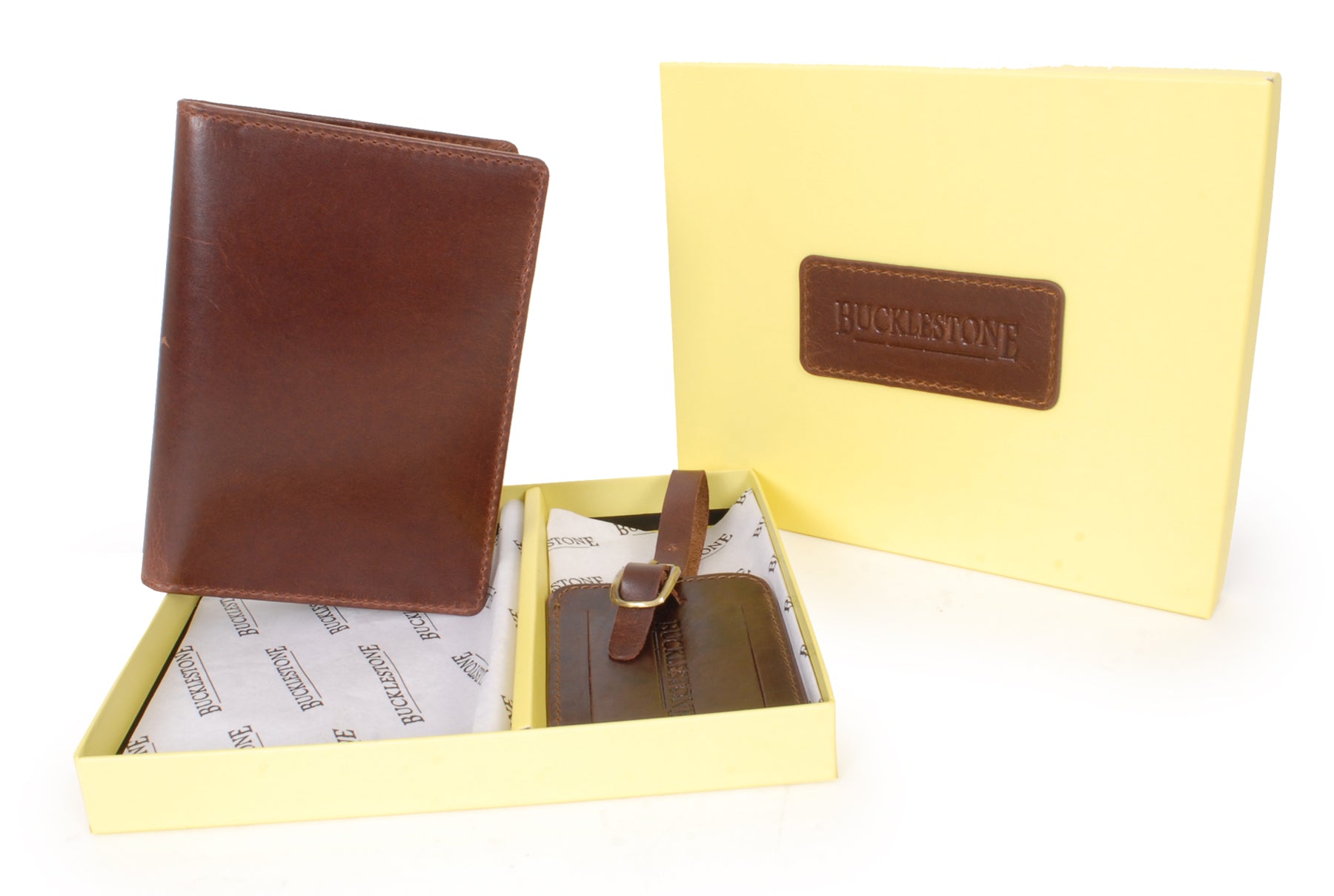 Bucklestone Leather Travel Gift Set for Men – Men's Passport Holder & Luggage TagJet off in style with the Bucklestone Leather Travel Gift Set, an elegant pairing of our leather passport holder and luggage tag. Presented in a branded Bucklestone gift box with tissue paper, this set makes an ideal Christmas gift, leather anniversary present, birthday surprise, or thoughtful gift for frequent flyers, business travellers, and holidaymakers alike.The Bucklestone leather luggage tag is a smart and practical accessory for any suitcase or holdall. Crafted from leather and embossed with the Bucklestone brand, it includes a discreet address card and a protective window flap to keep personal details secure while ensuring your luggage is easy to spot at airports, train stations, or hotels.Complementing this, the slim leather passport holder is designed to keep essential travel documents organised and accessible. With dedicated slots for your passport, boarding pass, credit cards, and folded banknotes, it’s the ultimate travel wallet for moving seamlessly through airports and stations. Fitted with Nationally Accredited RFID protection, it helps shield biometric passports and contactless cards from unauthorised scanning, reducing the risk of identity theft. The leather and striped fabric interior, matching stitching, and embossed logo create a sleek, timeless finish.Whether you’re shopping for a stylish men’s travel gift set, a practical present for travellers, or a luxury gift for a frequent flyer, this Bucklestone gift set offers both sophistication and everyday travel convenience.