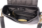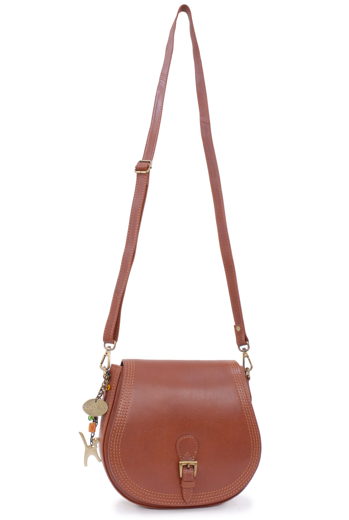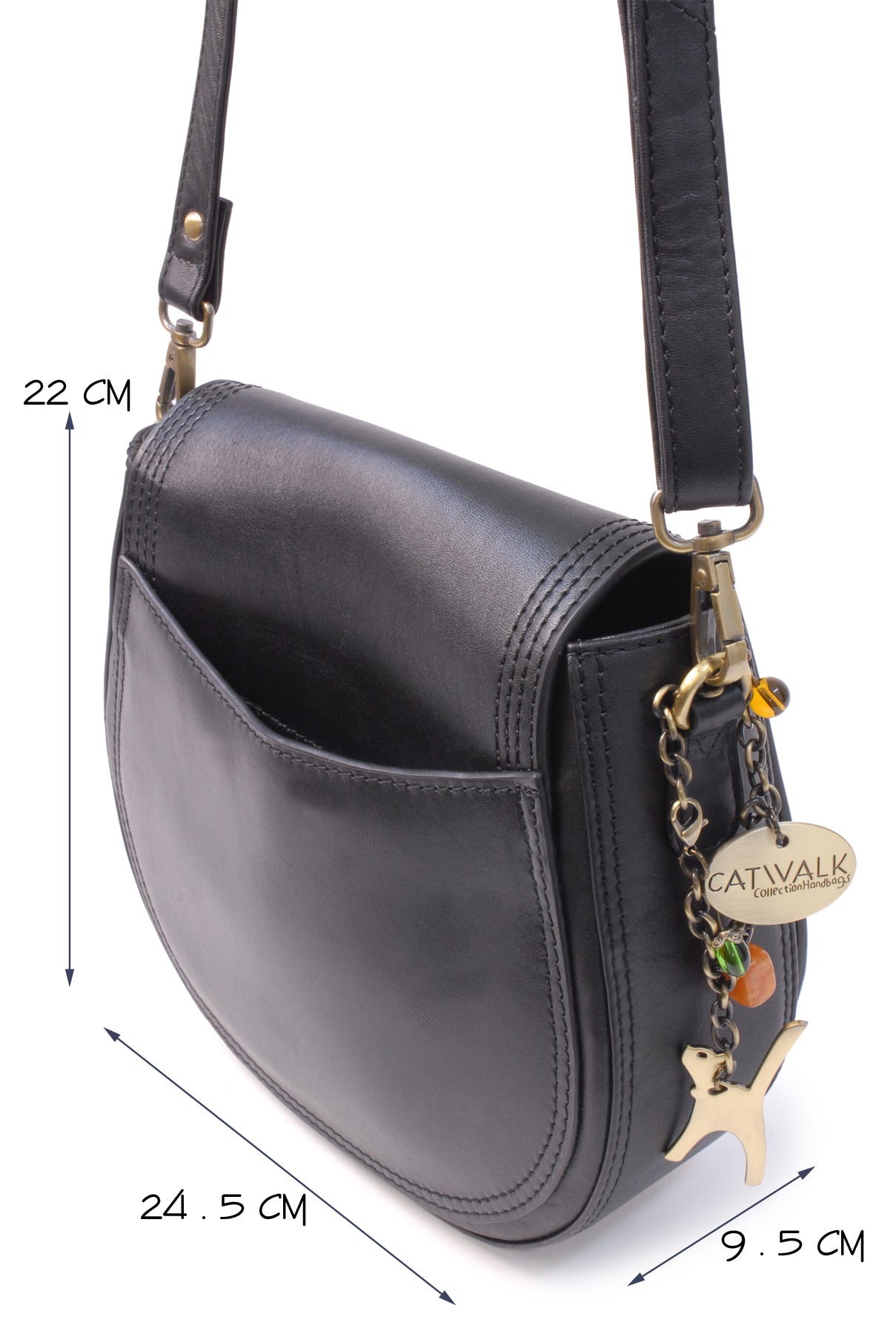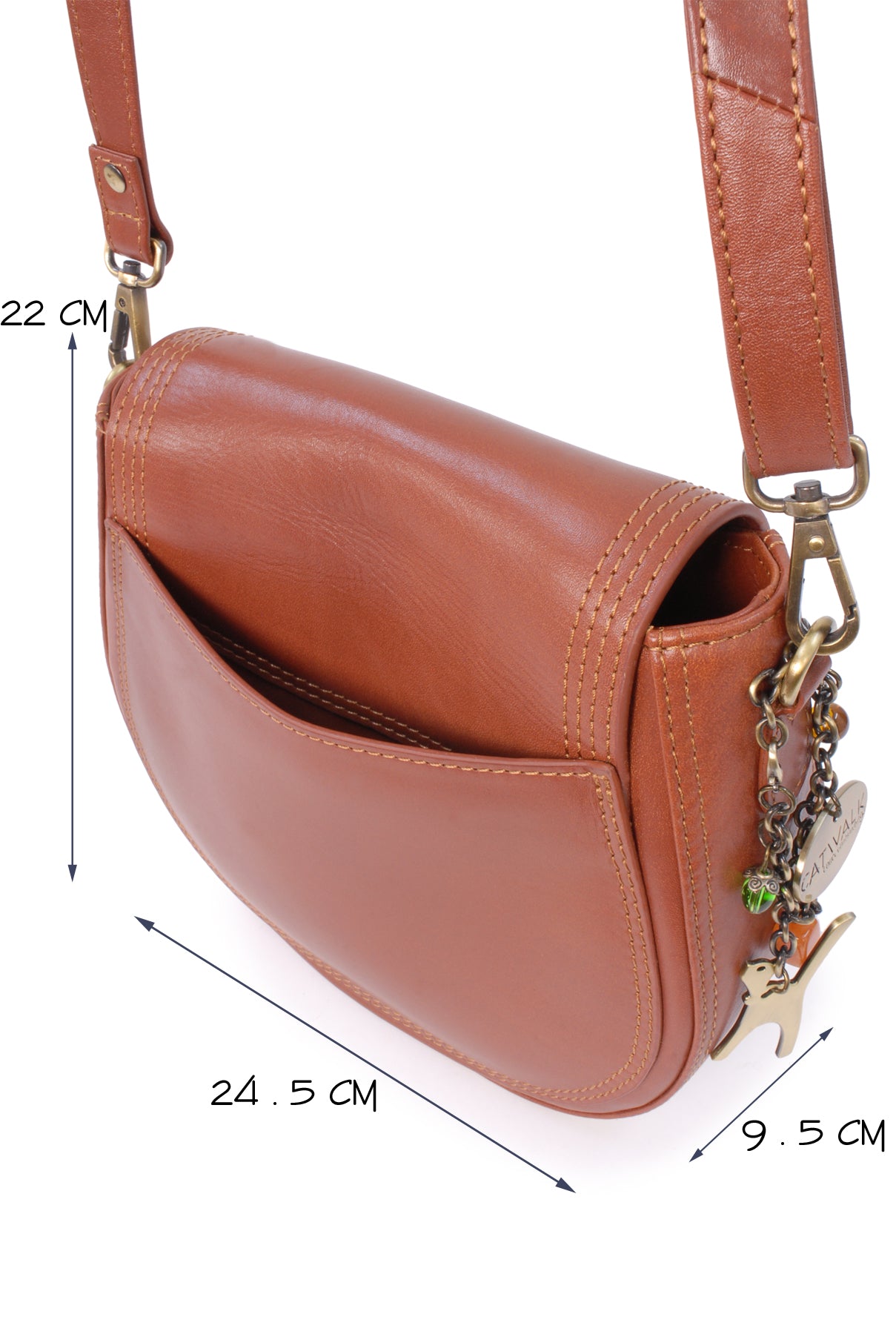 Give any outfit a classic country-inspired twist with this leather saddle bag.This is a traditional flap-over handbag and crossbody bag made from smooth leather. Designed for everyday use, it can be worn over the shoulder or hands-free across the body using the adjustable, detachable leather strap.This is a medium-sized bag with multiple compartments and internal pockets to organise contents. There are handy pockets for storing a mobile phone and pen. Includes an interior key fob clasp designed to keep keys easily accessible and prevent them from slipping to the bottom of the bag.The bag fastens securely with a flap-over and magnetic snap beneath the buckle.Interior pockets are finished with leather trim. The interior is lined with signature branded fabric.