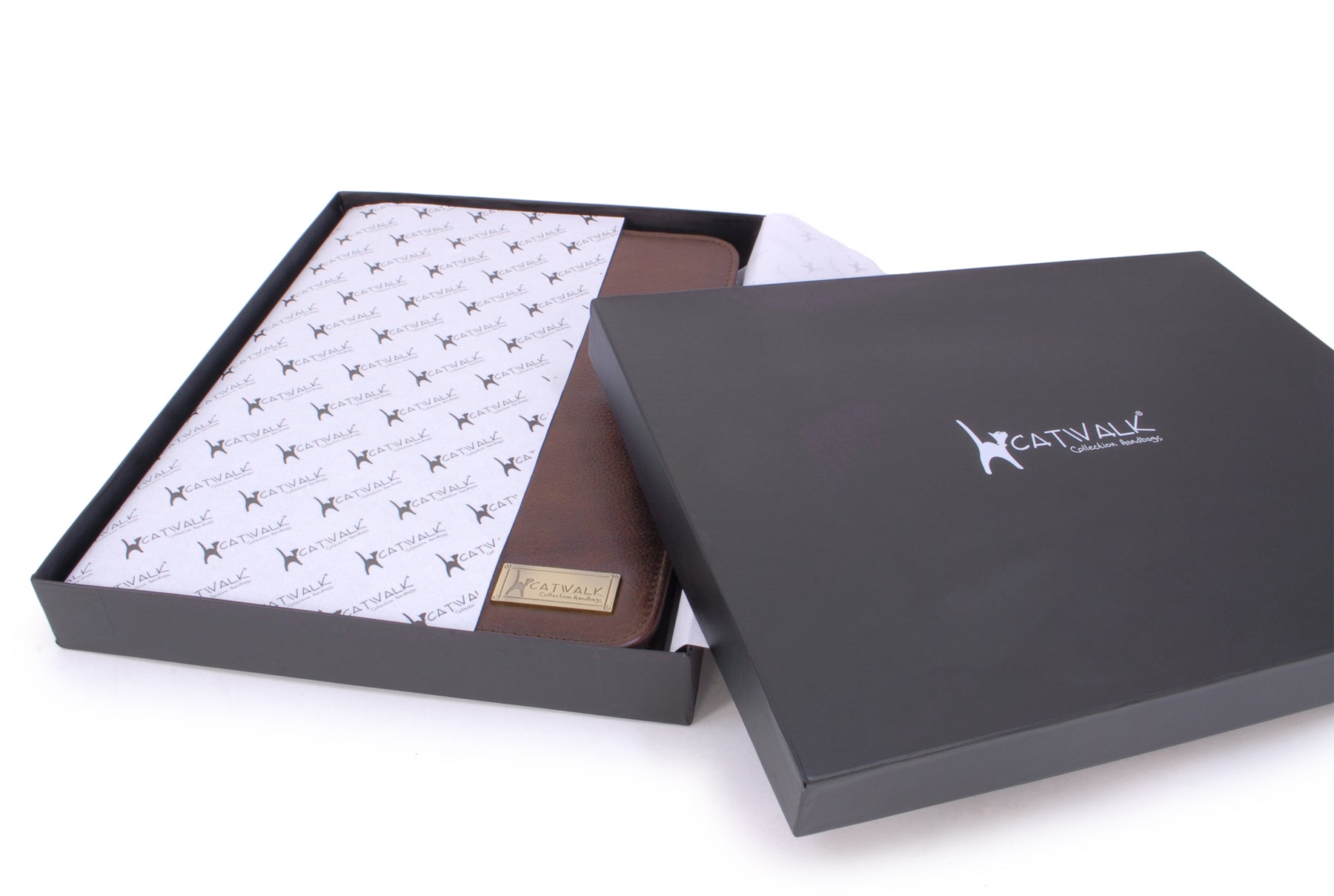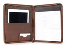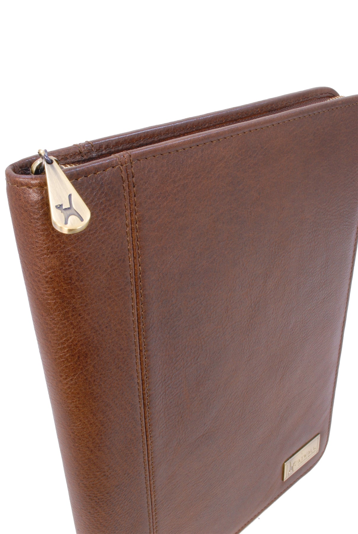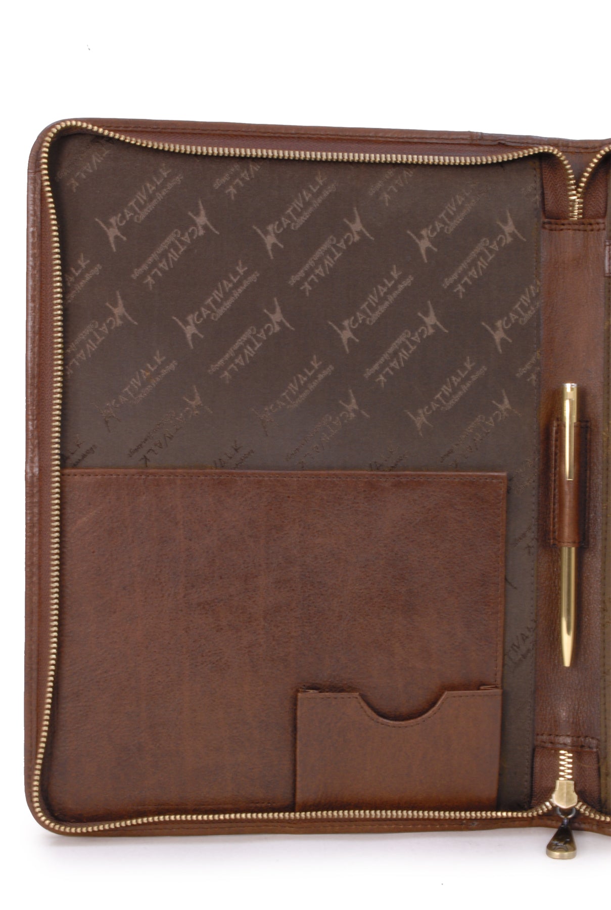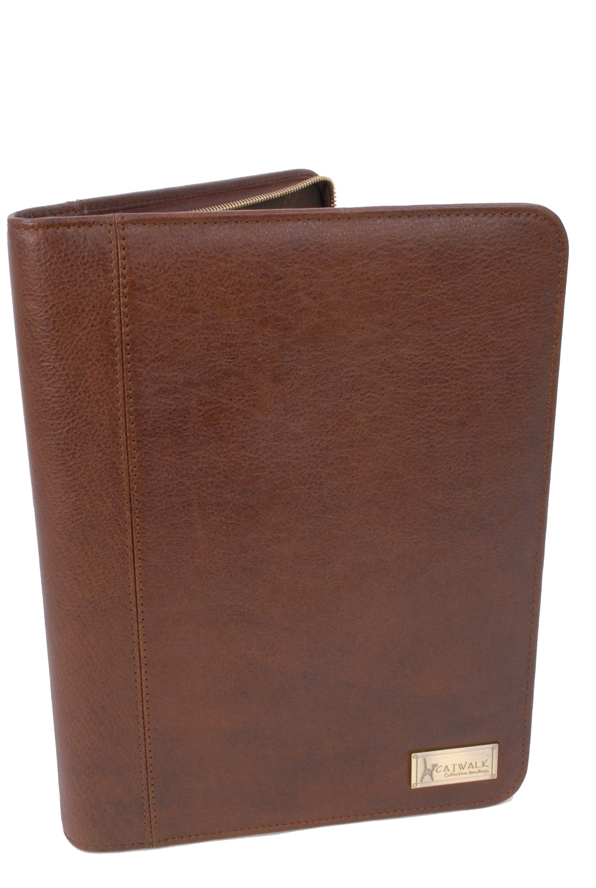 This is a practical yet stylish A4 document holder designed for use at work, college, or university.This leather zip folder includes a notepad and can be carried under the arm. It functions as a conference folder, portfolio, or travel document holder. A solid brass zip pull features the Catwalk Collection Cat Logo. The interior is lined with a combination of leather and branded fabric.Interior dimensions are 31 x 23 x 2 cm. Organisational features include pockets for a pen, business cards, and an A4 notepad. Notepads can be inserted from the top or the side.Designed to hold tablets or eReaders up to 11 inches. Devices can also be placed behind the leather interior panel.Each item is supplied in a gift box, making it suitable as a gift.The leather matches a selection of Catwalk Collection Handbags: Fern, Gallery, Sienna, Victoria, Vicky, Isla, and Emma.For a smaller A5 version of this folder, see the 'Angela' range.