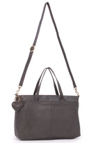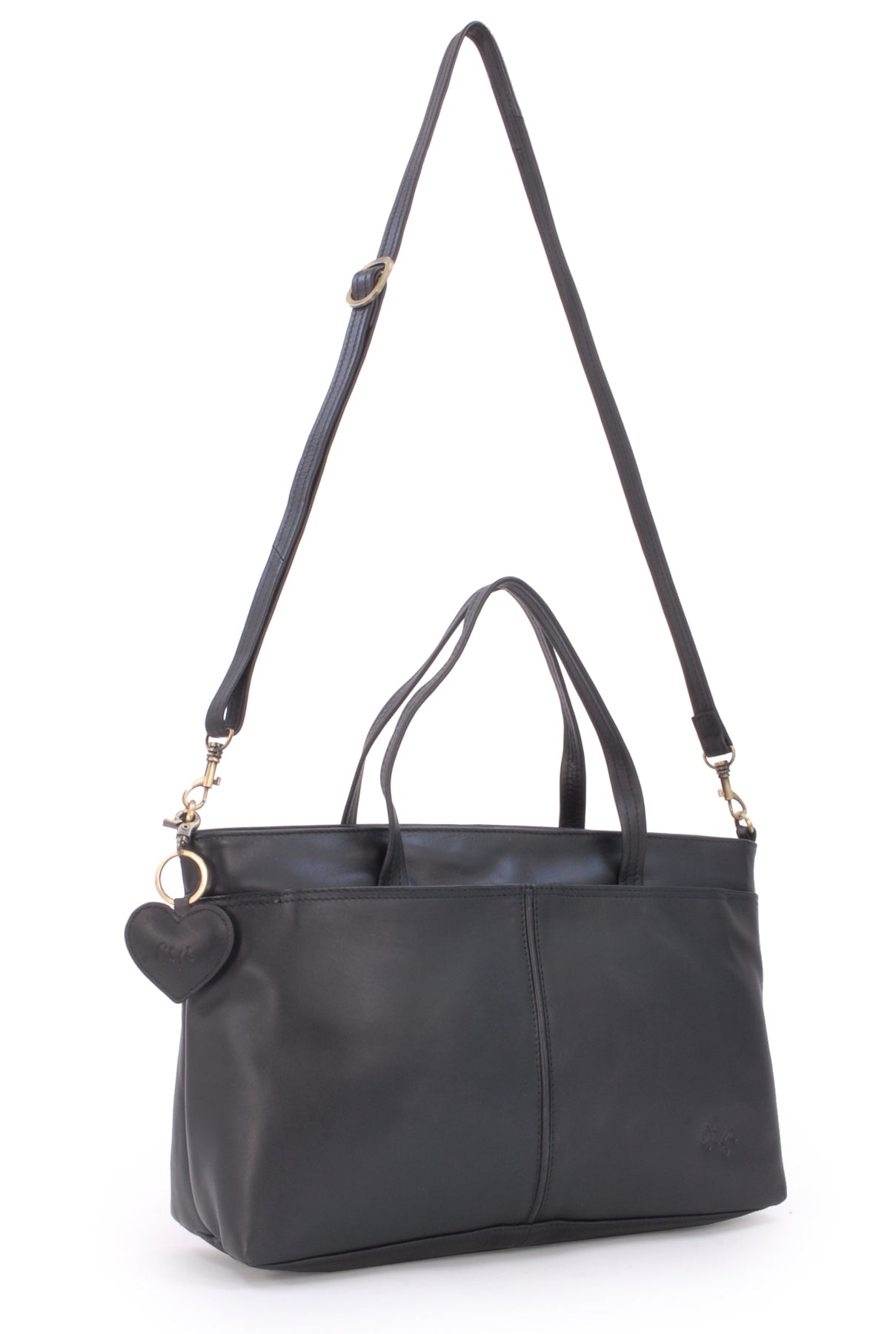 The long detachable, adjustable strap is made from leather; wear either over-the-shoulder or hands-free across-the-body.