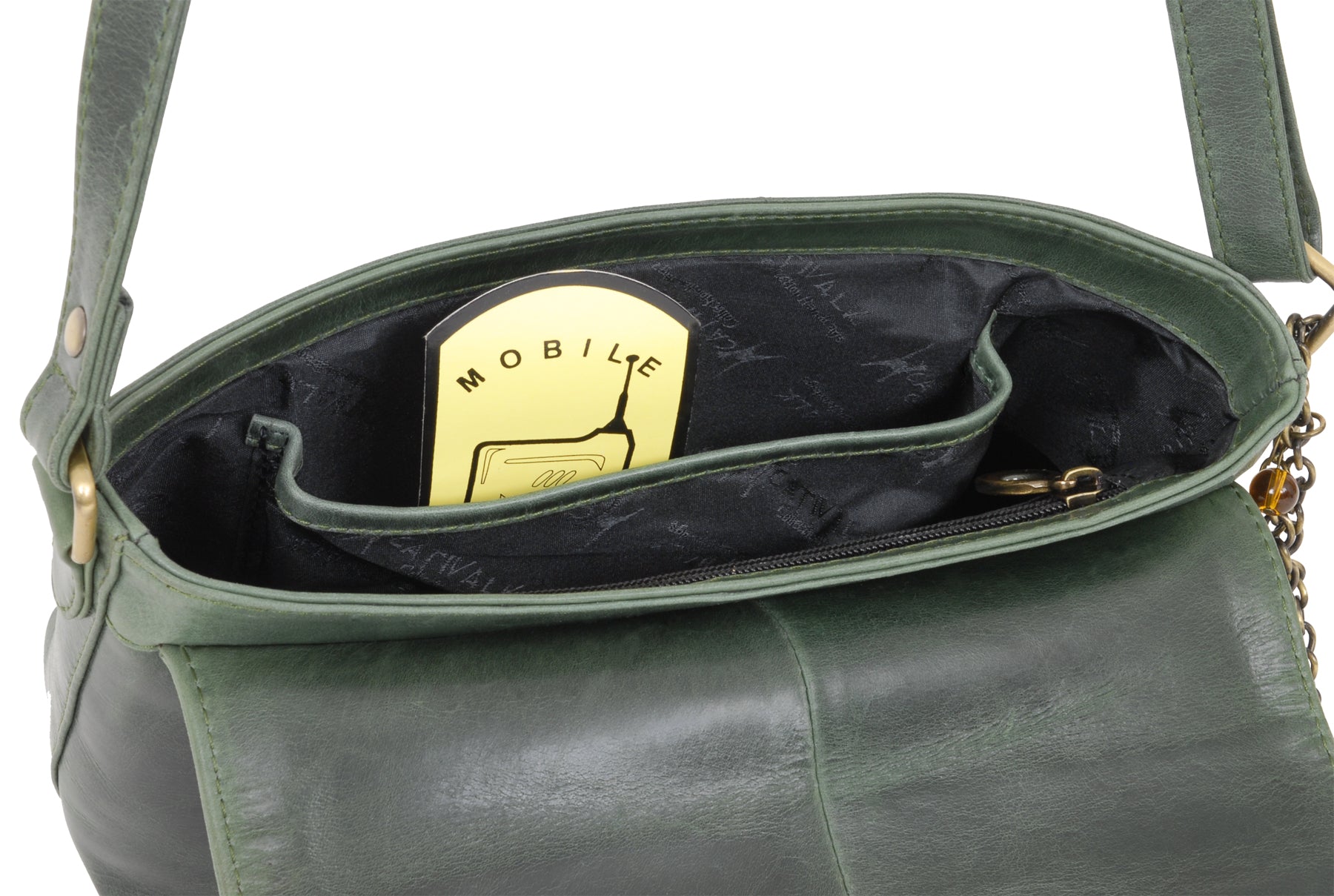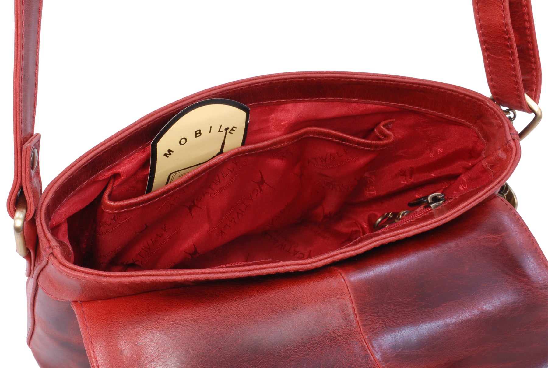 Pockets: 1 Main Compartment + 1 Interior Rear Zipped Pocket + 1 Leather Topped Mobile Phone Holder + 1 Spring Clip Key Fob + 1 Outer Rear Zipped Pocket