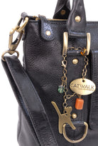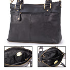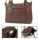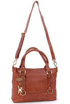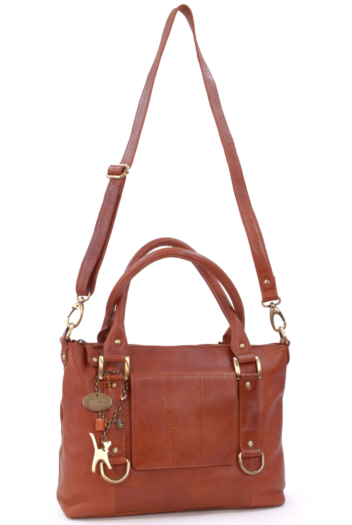 A versatile leather shoulder bag featuring an additional crossbody strap. This is a large bag offering ample capacity with multiple compartments and pockets to organise belongings. Suitable for carrying a tablet and notepad up to A4 size. Ideal as a work bag.The main compartment opens wide for easy access and closes securely with a zip. The interior is lined with signature fabric. Two interior zipped pockets provide secure storage for valuables.Under the decorative front flap is a convenient ID window, ideal for photo ID cards, bus passes, travel tickets, or health cards. A zipped outer pocket is located on the rear of the bag for extra storage.Handles are rolled for comfort when carrying by hand. The bag can be worn on the shoulder. The long detachable, adjustable crossbody strap allows for over-the-shoulder or hands-free crossbody wear.The base of the handbag is flat and features studded feet for stability and protection.