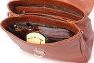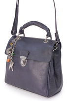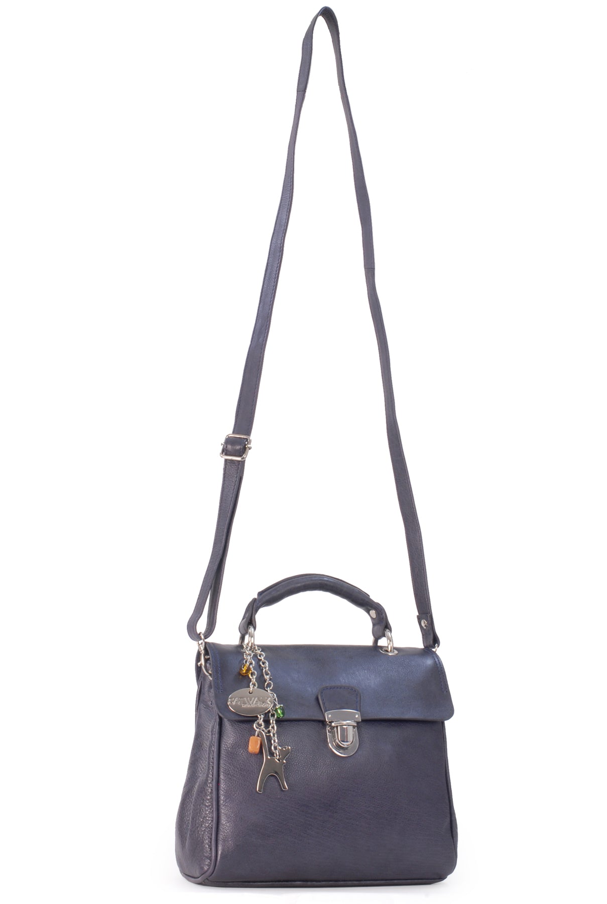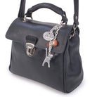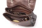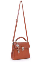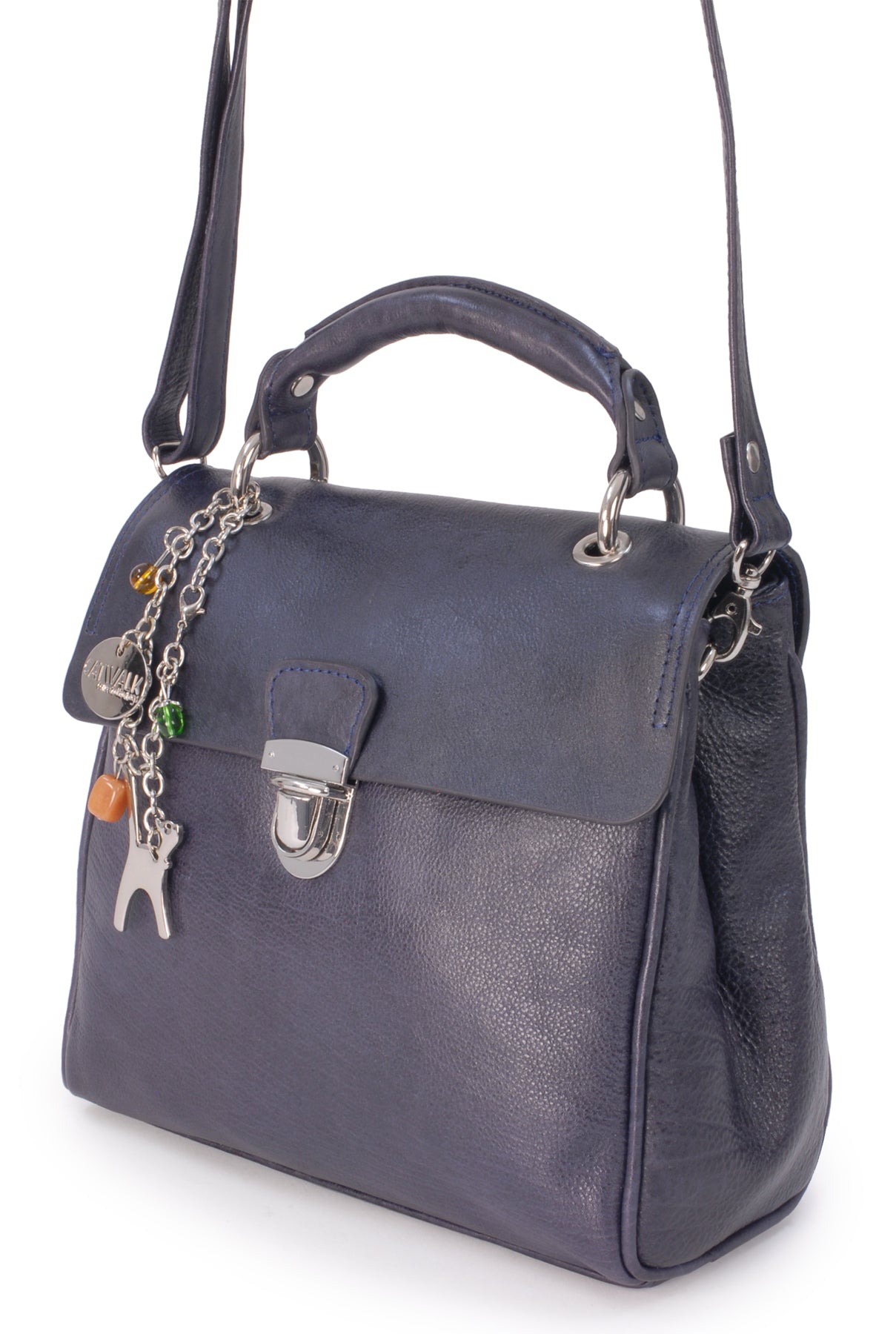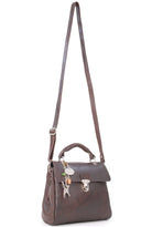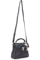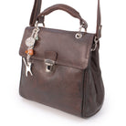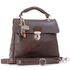 This leather handbag features a classic top handle silhouette with a contemporary twist on vintage styling, designed to transition seamlessly from daytime use to evening occasions.