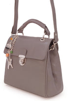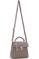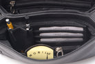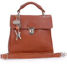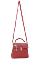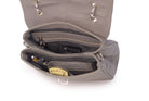 The interior includes multiple compartments and organisational features such as dedicated pockets for pens, credit cards, and a mobile phone. The flap-over closure with a push-lock fastening provides both accessibility and security, while the flat base helps the bag stay upright when placed on a surface. This mid-sized, structured handbag is suitable for everyday use or special occasions.