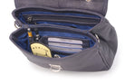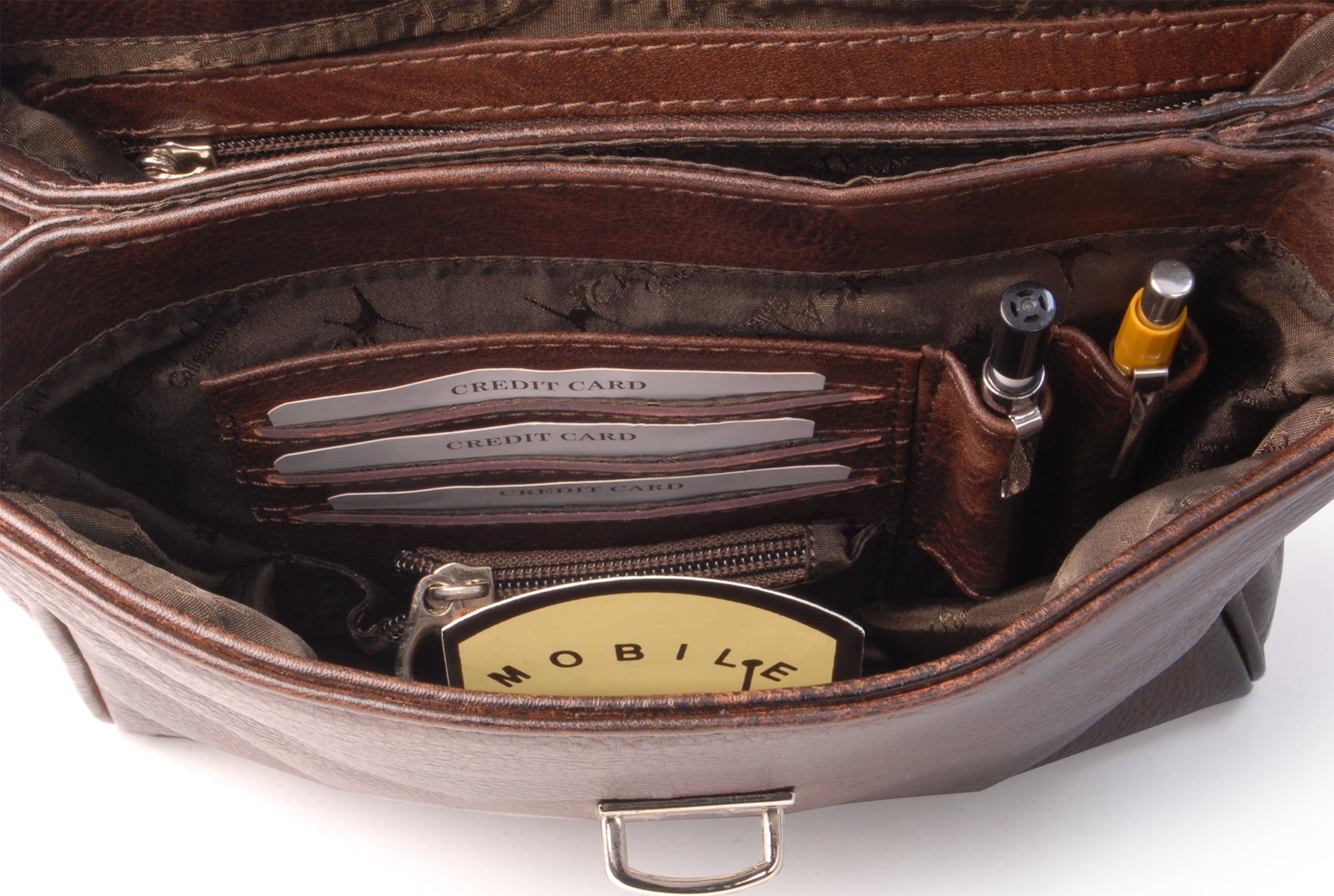 Pockets: 2 Main Compartments + 1 Slim Central Open Pocket + 1 Interior Side Zipped Pocket + 1 Leather topped Mobile Phone Holder + 3 Credit Card Holders + 2 Pen Holders + 1 Zipped Coin Pocket + 1 Key Fob
