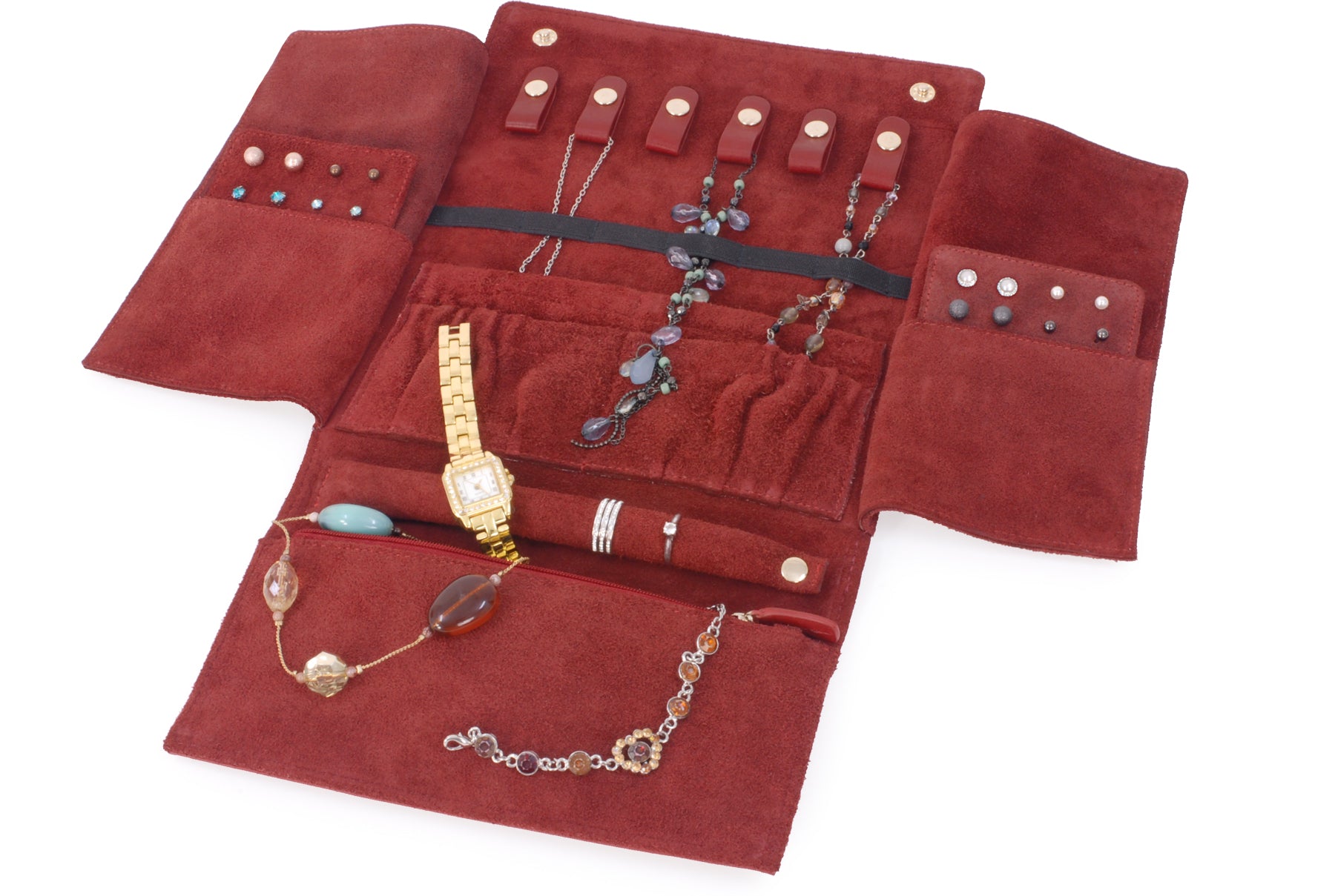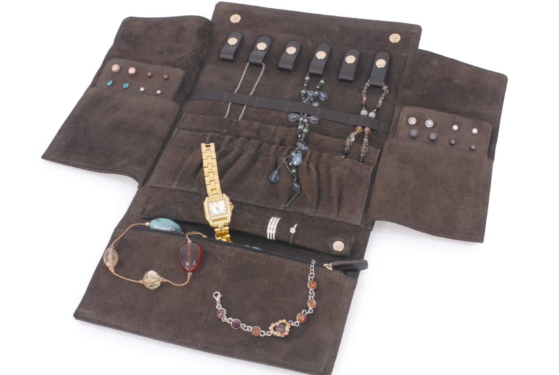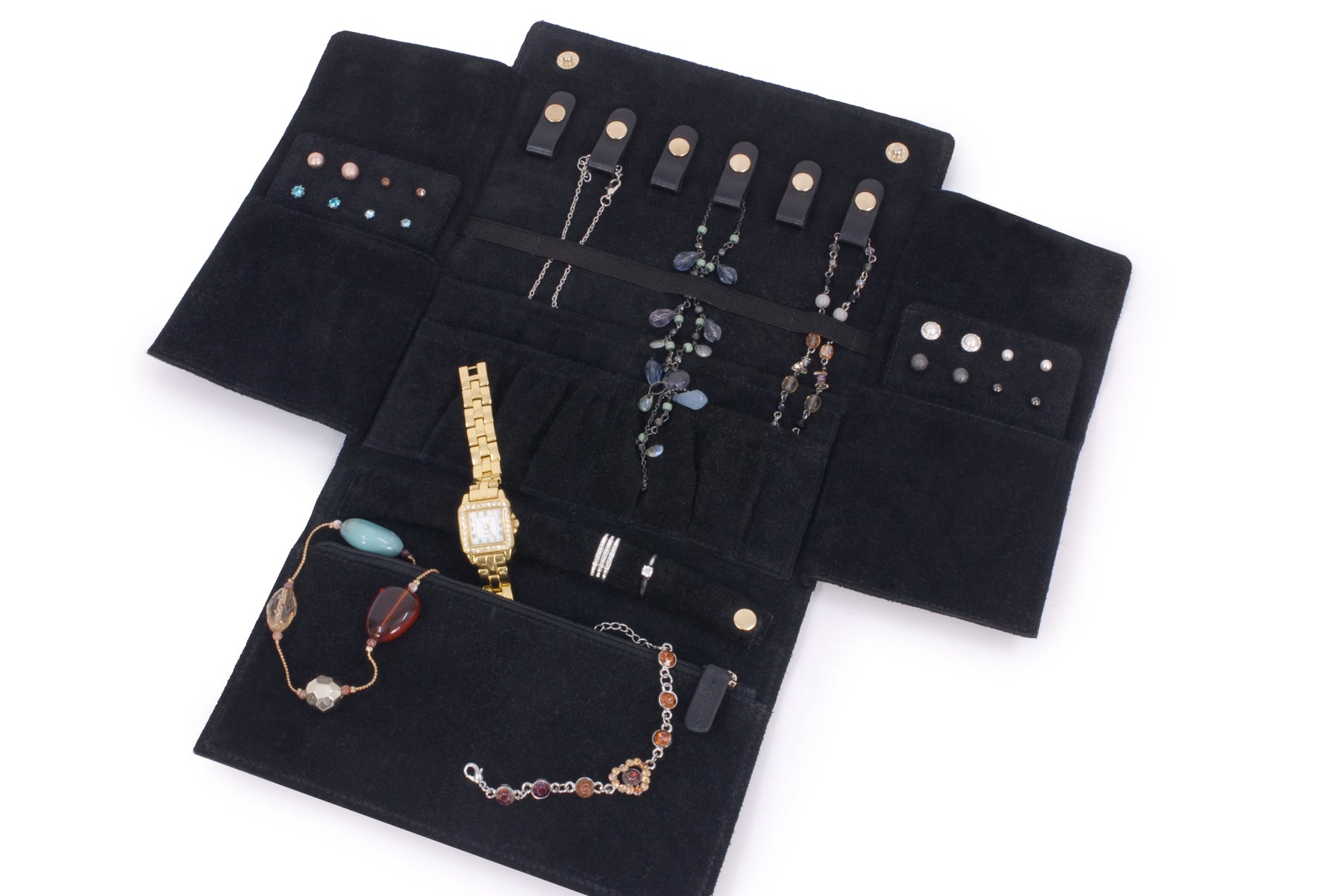 Pockets: 6 Tabs and Pockets for Necklaces/Chains + 2 Elasticated Open Pockets for Bracelets/Bangles + 2 Open Pockets containing Padded Holders for up to 16 Pairs of Earrings/Studs + 1 Long Holder for Rings + 1 Zip Pocket for Watches/Brooches