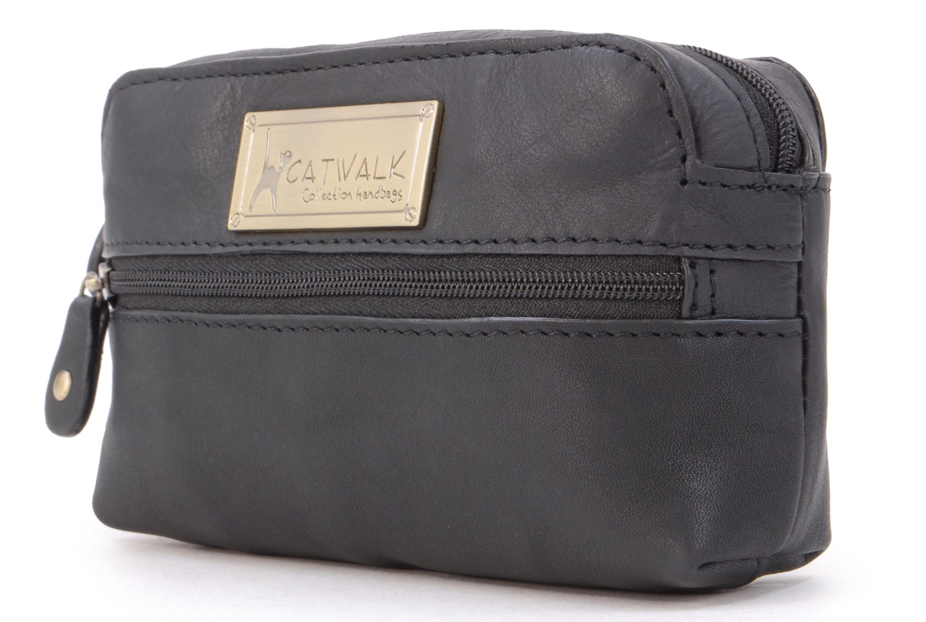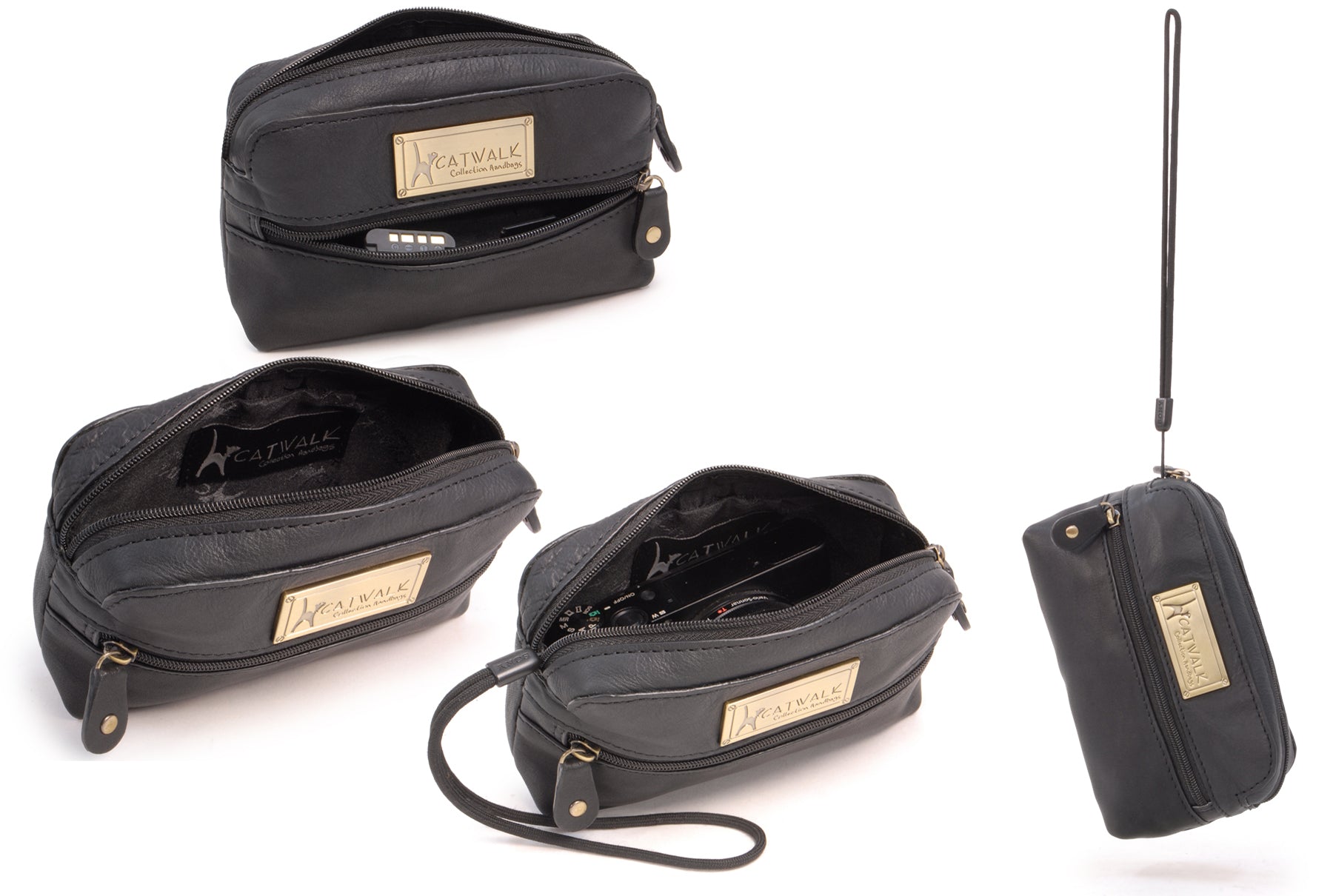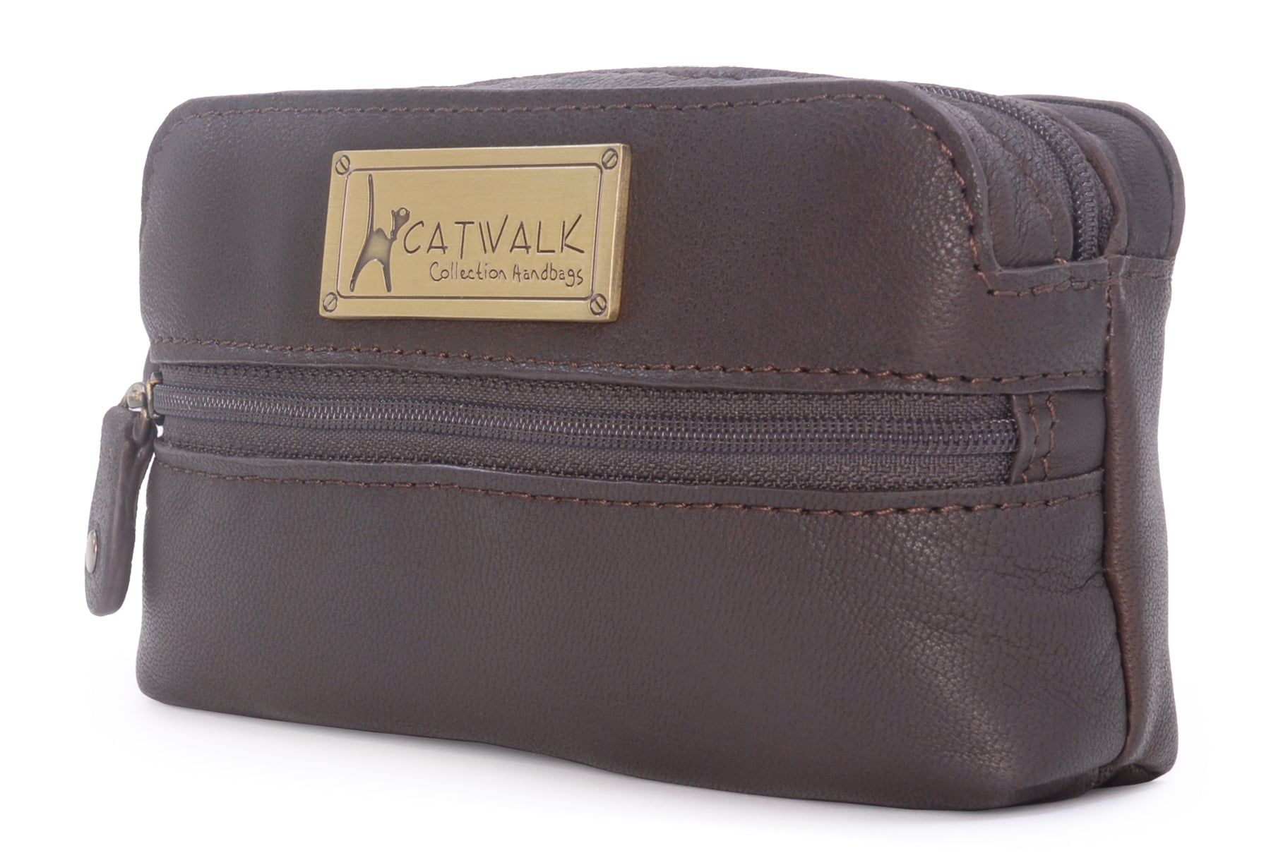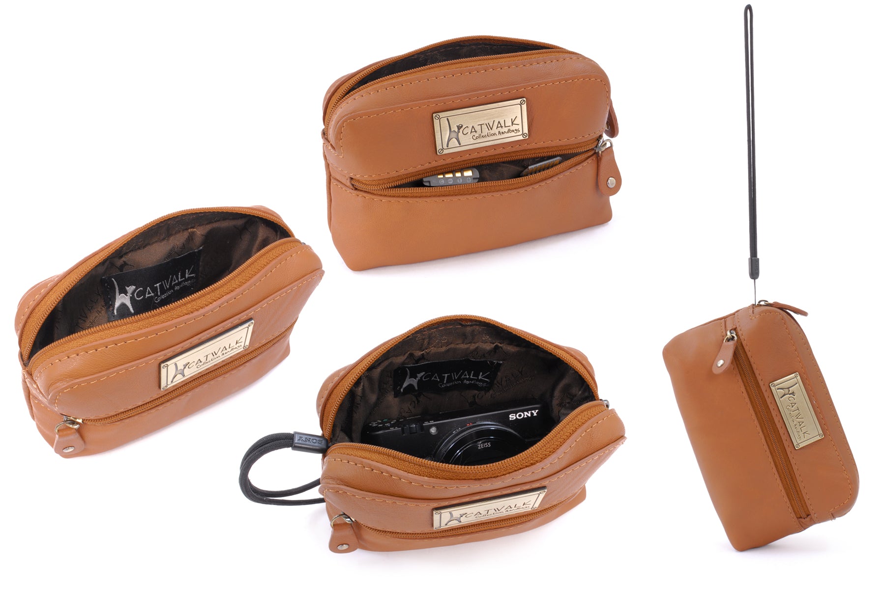 A small leather zipped pouch offering stylish practicality in a compact form. Presented in a branded gift box, it makes a thoughtful gift for women.A versatile accessory sized to fit most compact digital cameras, this leather case offers protection against knocks and scratches while travelling. Interior Capacity: 13 x 7 x 3 cm. Using your camera’s own wrist strap, you can zip this case around your camera to create a protective cover when out and about.Lightweight and easy to slip inside your handbag, tote or luggage, this pouch is also ideal for storing everyday small essentials. Whether it’s lipstick, hand sanitiser, tissues, sanitary items, medicine, keys or hair accessories—this pouch keeps everything neatly in place and close at hand.The interior is lined with signature fabric.A practical travelling companion. The Catwalk Collection Cat Logo is imprinted into a brass plate attached to the front panel. Suitable as gifts for women on Valentine’s Day, Mother’s Day, Birthdays, and Christmas.