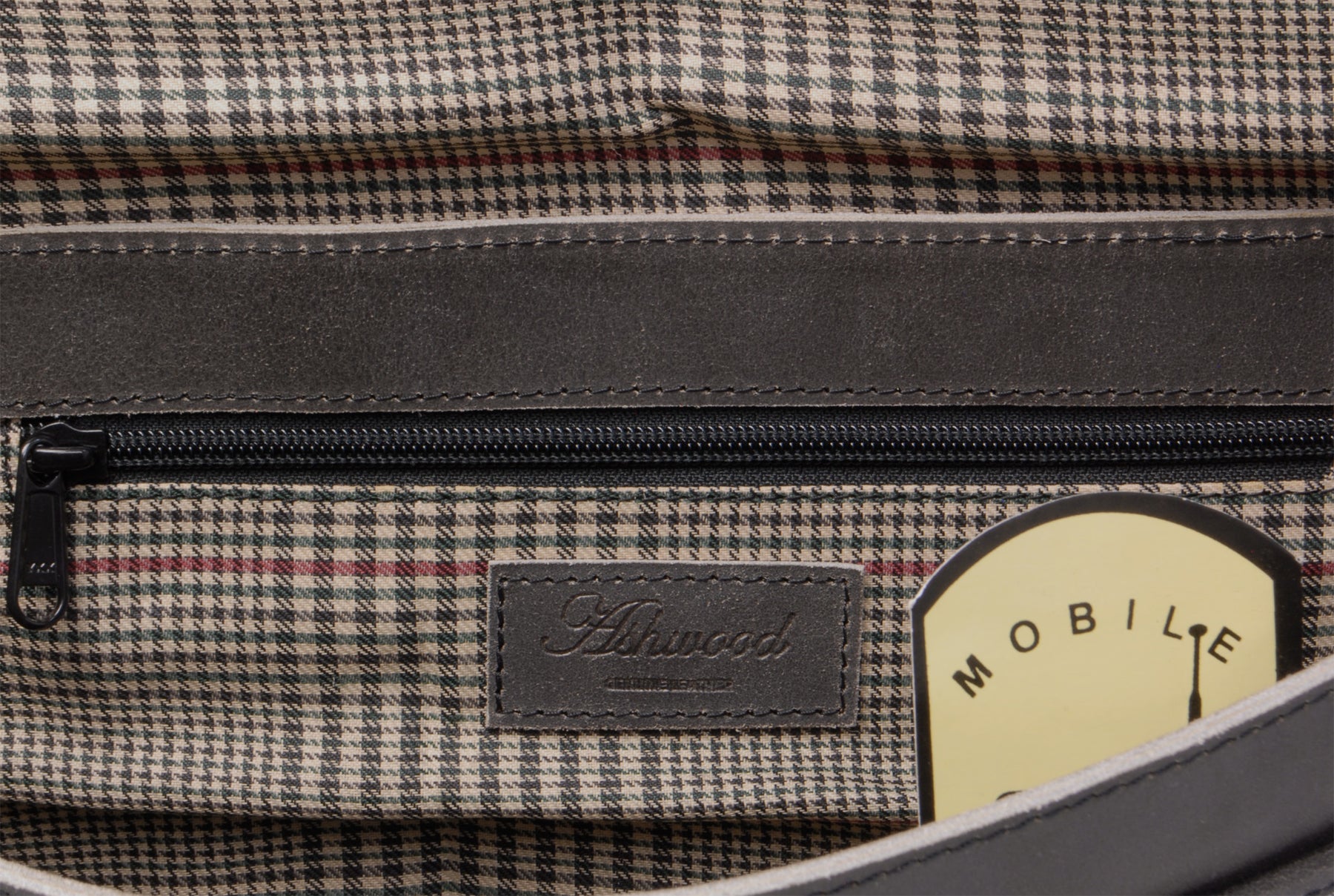 Pocket tops are finished with leather for extra durability. The base of the bag is flat.