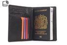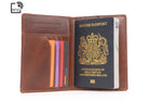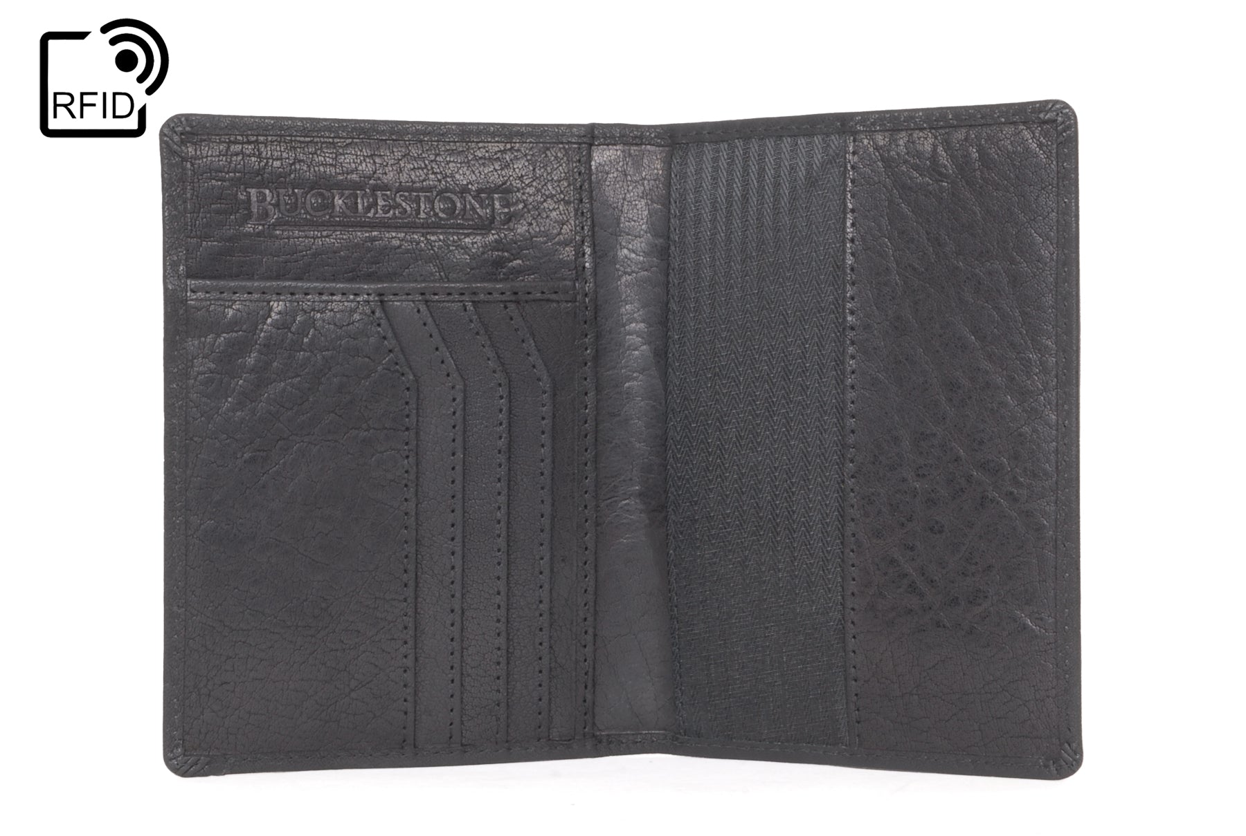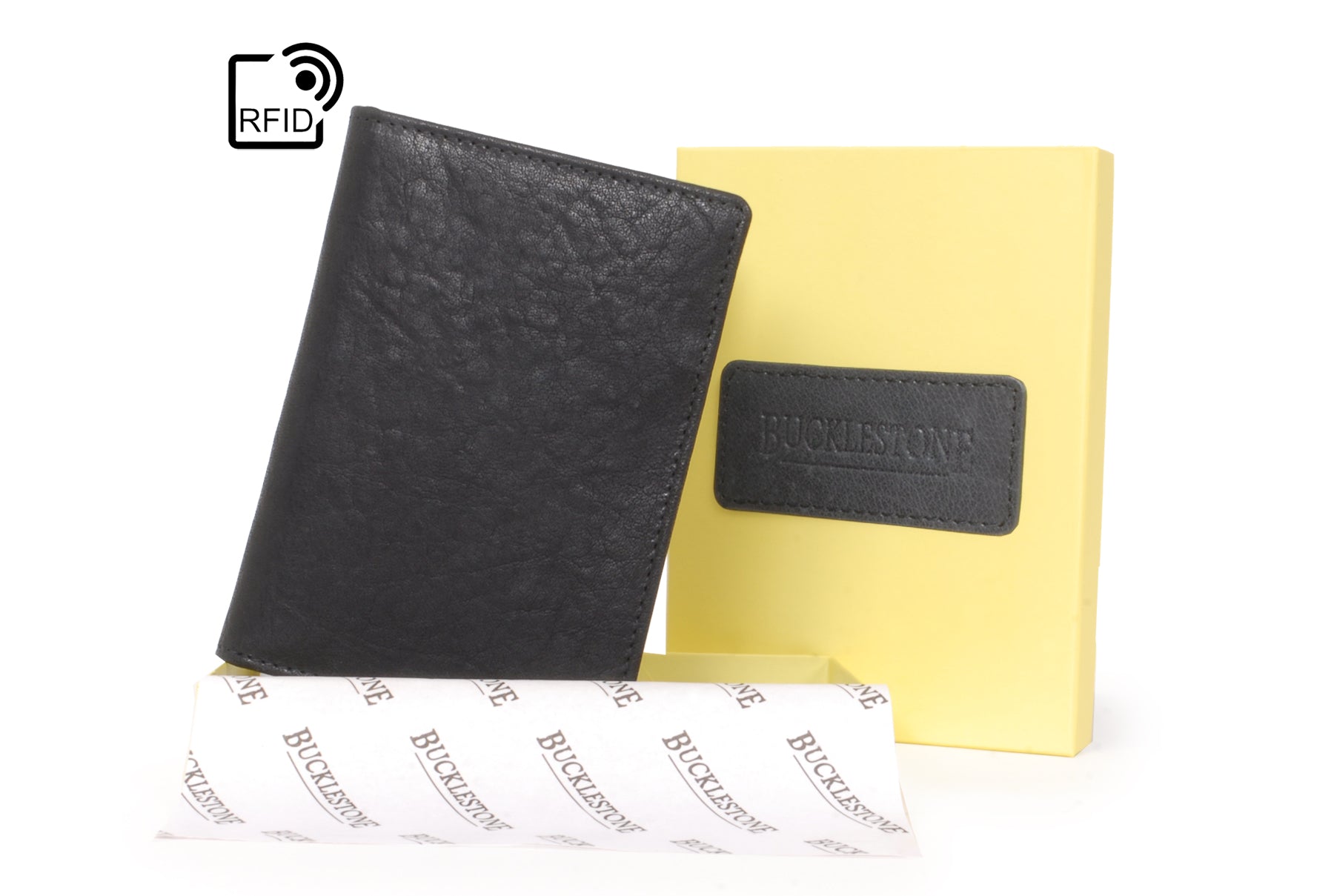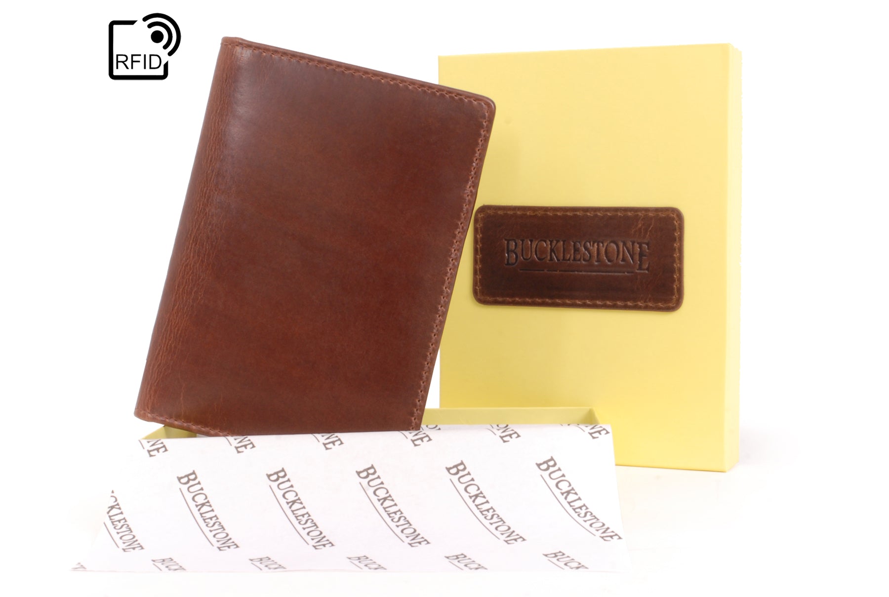 This slim leather passport holder is designed for keeping essential travel documents organised in one place. With dedicated slots for a passport, boarding pass, credit cards, and folded banknotes, it provides a compact, easy-access solution when moving through airports or stations. The lightweight profile makes it easy to slip into a messenger bag or carry-on bag without adding bulk.Fitted with Nationally Accredited RFID Protection, this travel wallet helps block unauthorised access to personal data stored on biometric passports and contactless credit or debit cards, reducing the risk of identity theft and fraud.The interior is lined with a combination of leather and striped fabric for a neat finish, while matching stitching and the embossed logo add subtle detailing.Presented in a Bucklestone gift box, this item is suitable for gifting and offers a practical option for business or leisure travel.