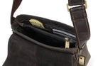 The main body of the bag is made from distressed oil Hunter leather which has that dark and sultry look about it, whilst trim is made from highly polished Mocha leather for a cool contrast.