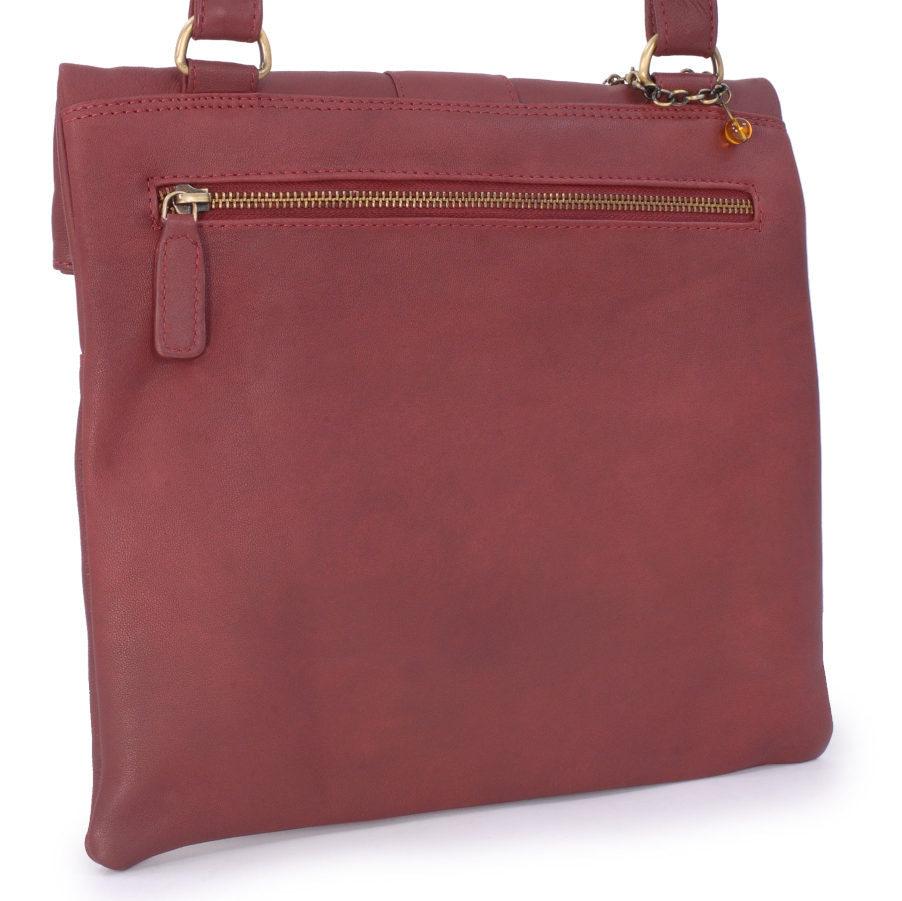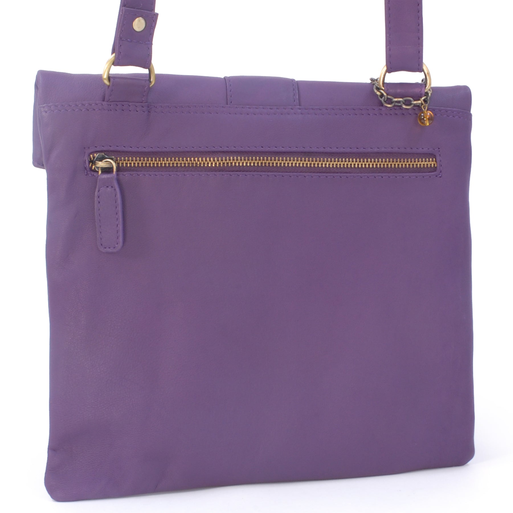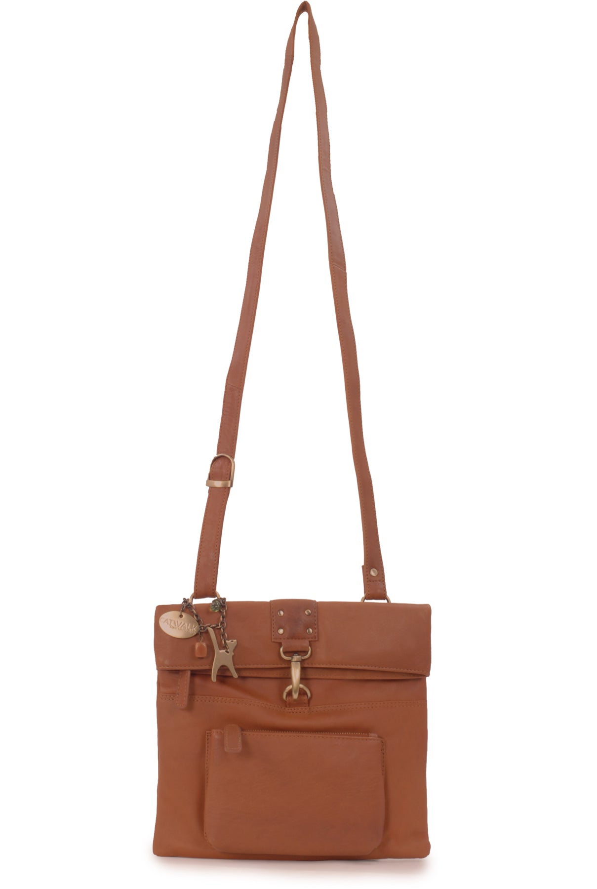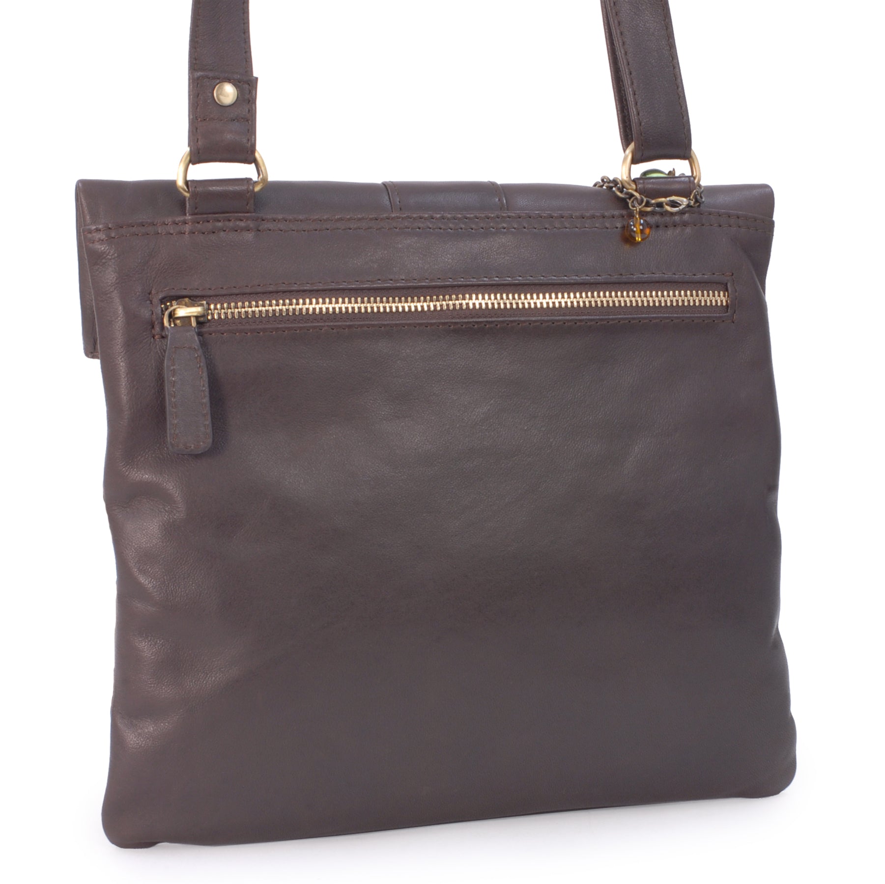 This medium-sized leather messenger-style bag features a slim profile with practical storage for everyday use.The main compartment offers space for an A5-sized diary, purse, make-up case, and other daily essentials. The interior is fully lined and slightly padded.The bag fastens securely with a metal zip. The top section folds over and is held in place with a brass spring clip, adding an extra layer of security.A zipped pocket on the rear provides convenient external storage for quick-access items.The long strap is fully adjustable with a sliding brass grip, allowing the bag to be worn comfortably over the shoulder or hands-free across the body. The strap design avoids buckles to prevent snagging on clothing.This leather crossbody bag is suited to those looking for a slim, secure, and functional option for everyday use.