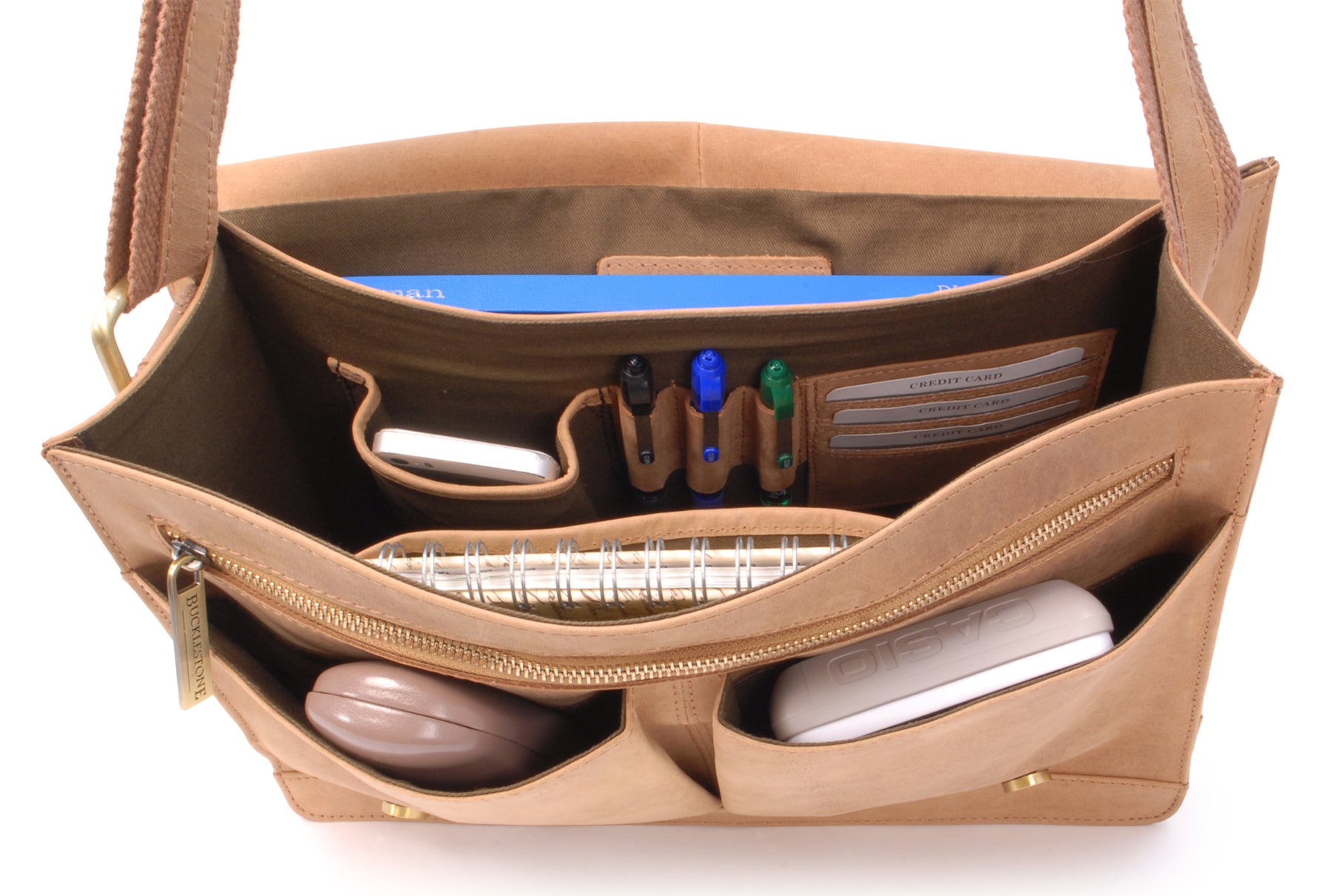 Pockets: 1 Main Compartment + 1 Interior Side Open Pocket + 3 Credit Card Holders + 1 Mobile Phone Holder + 3 Pen Holders + 1 Large Rear Open Pocket + 1 Interior Side Zipped Pocket + 2 Open Front Pockets + 1 Large Front Zipped Pocket + 1 Large Outer Rear Zipped Pocket