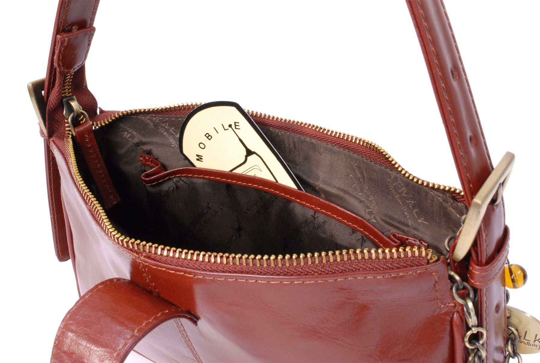 This lightweight shoulder bag is designed for everyday use or special occasions, offering a slim, close-fitting shape that sits comfortably against the body. It fastens securely with a sturdy antique-brass metal zip and is carried using a leather shoulder strap, adjustable via double brass buckles on each side of the bag.