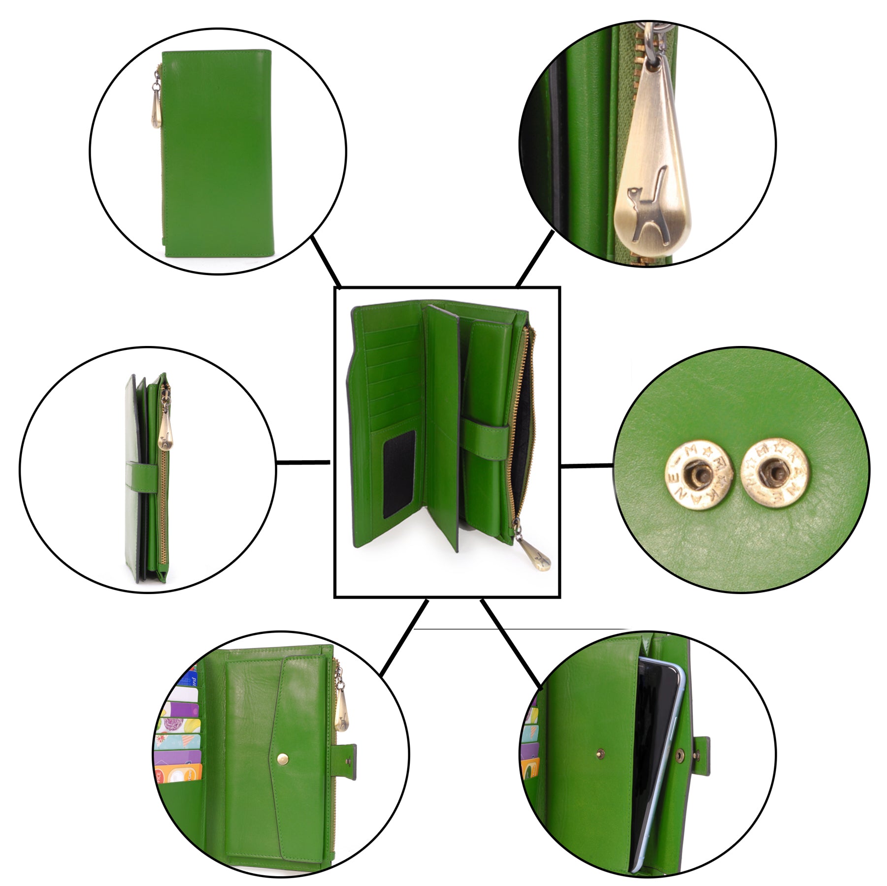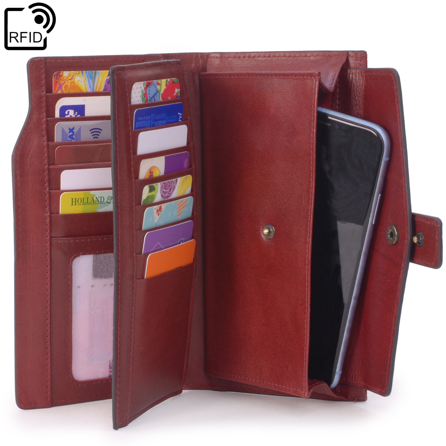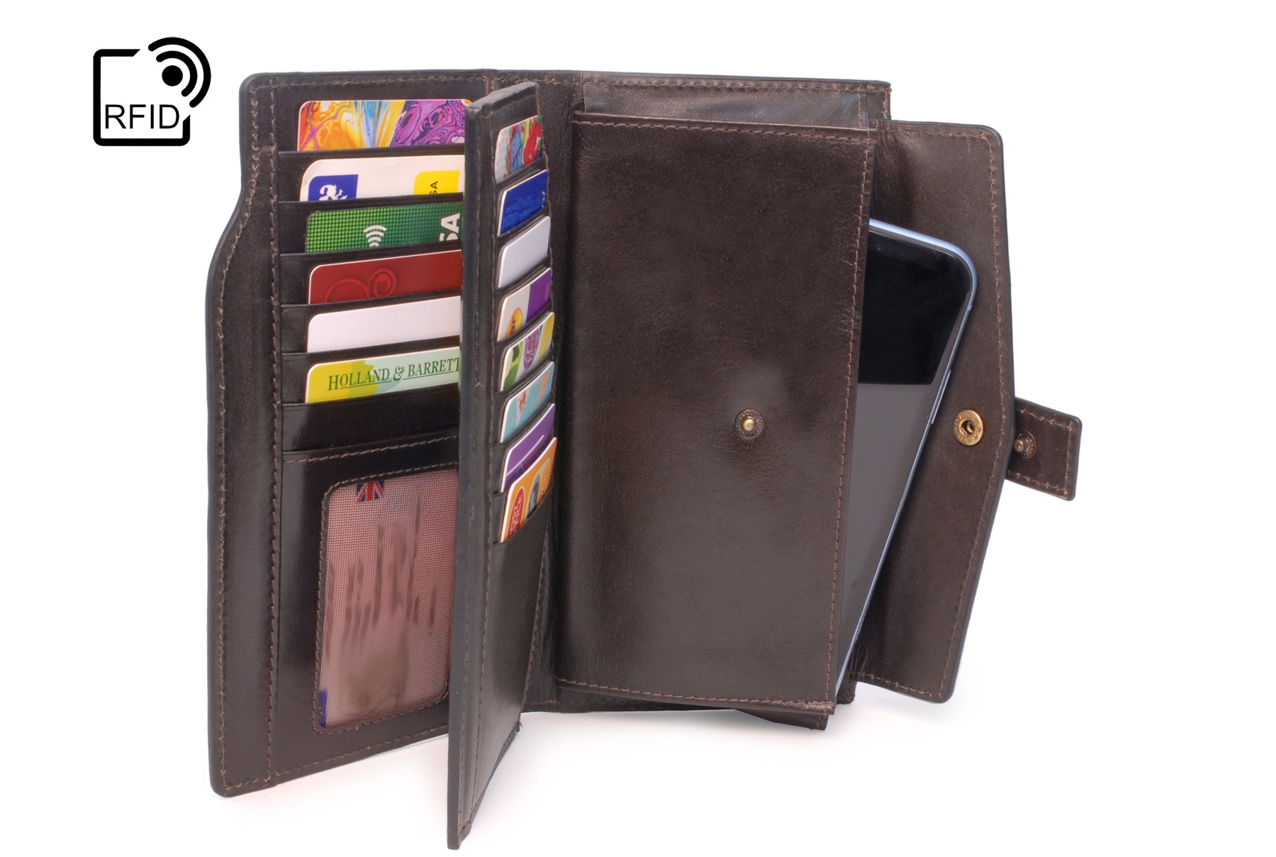 This large leather purse offers practical organisation for everyday use, with dedicated sections for cards, coins, notes, and even a smartphone.
