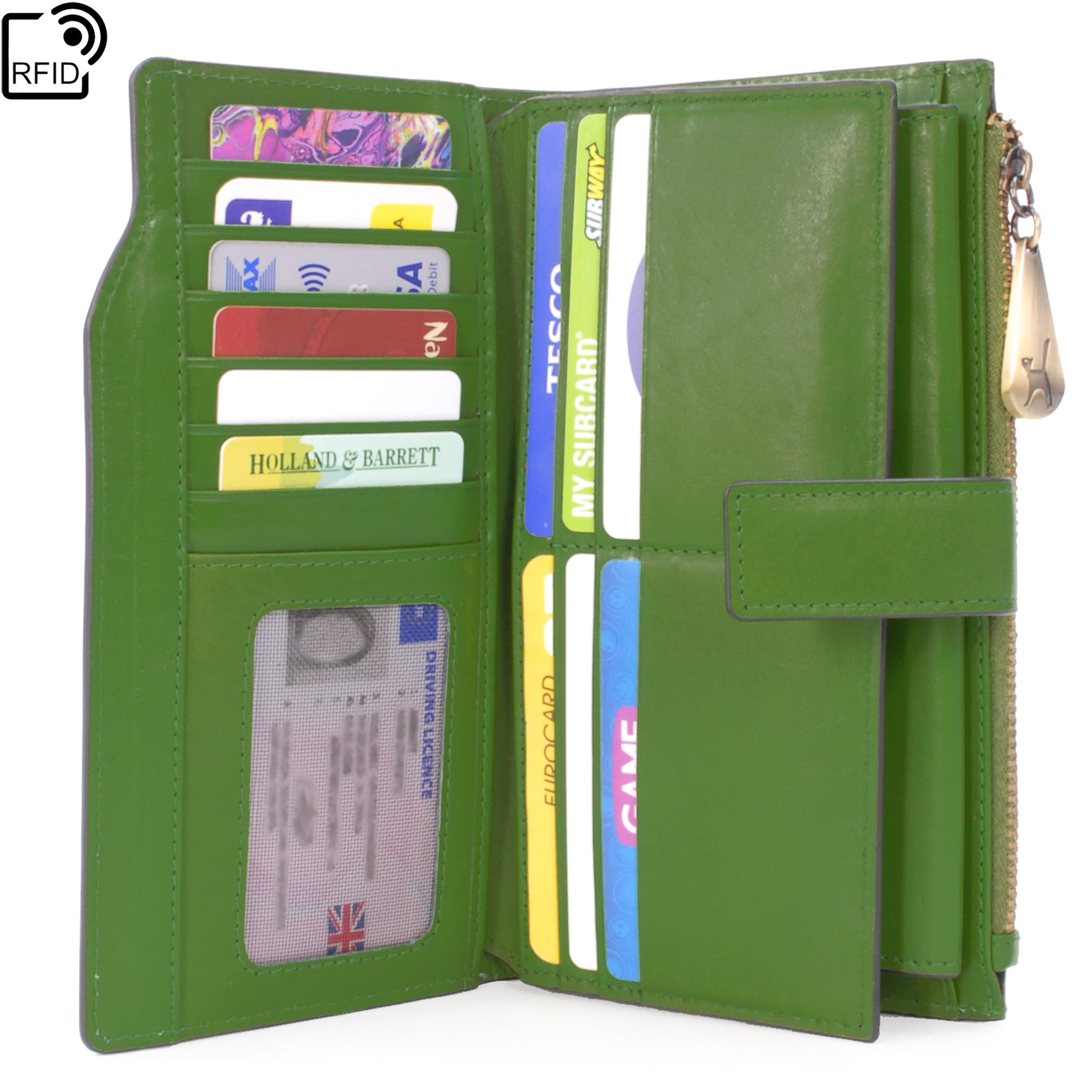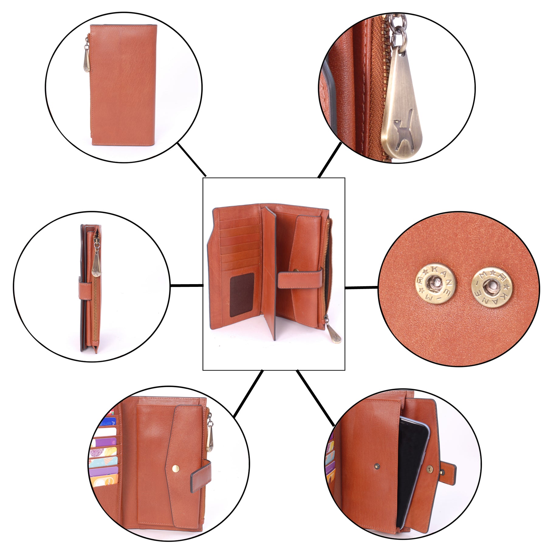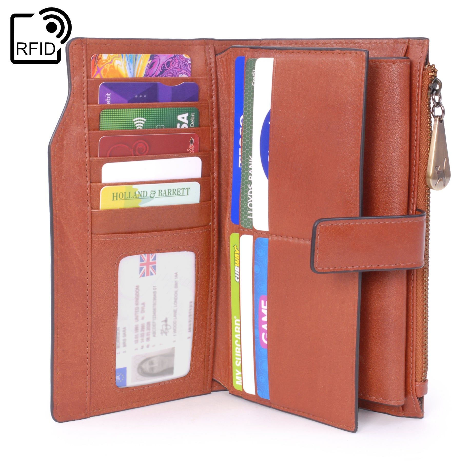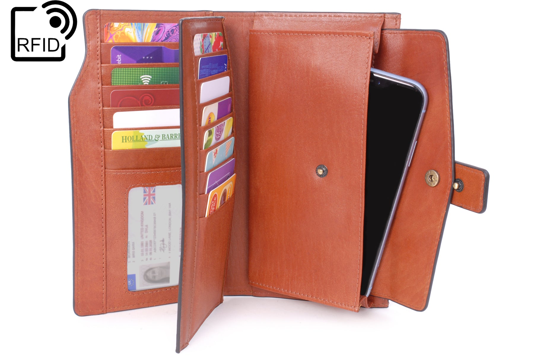Designed for straightforward access, it includes a secure zipped coin compartment and a designated phone pocket measuring 17 x 8.5 cm. The structured layout helps keep contents tidy and visible when opened.
