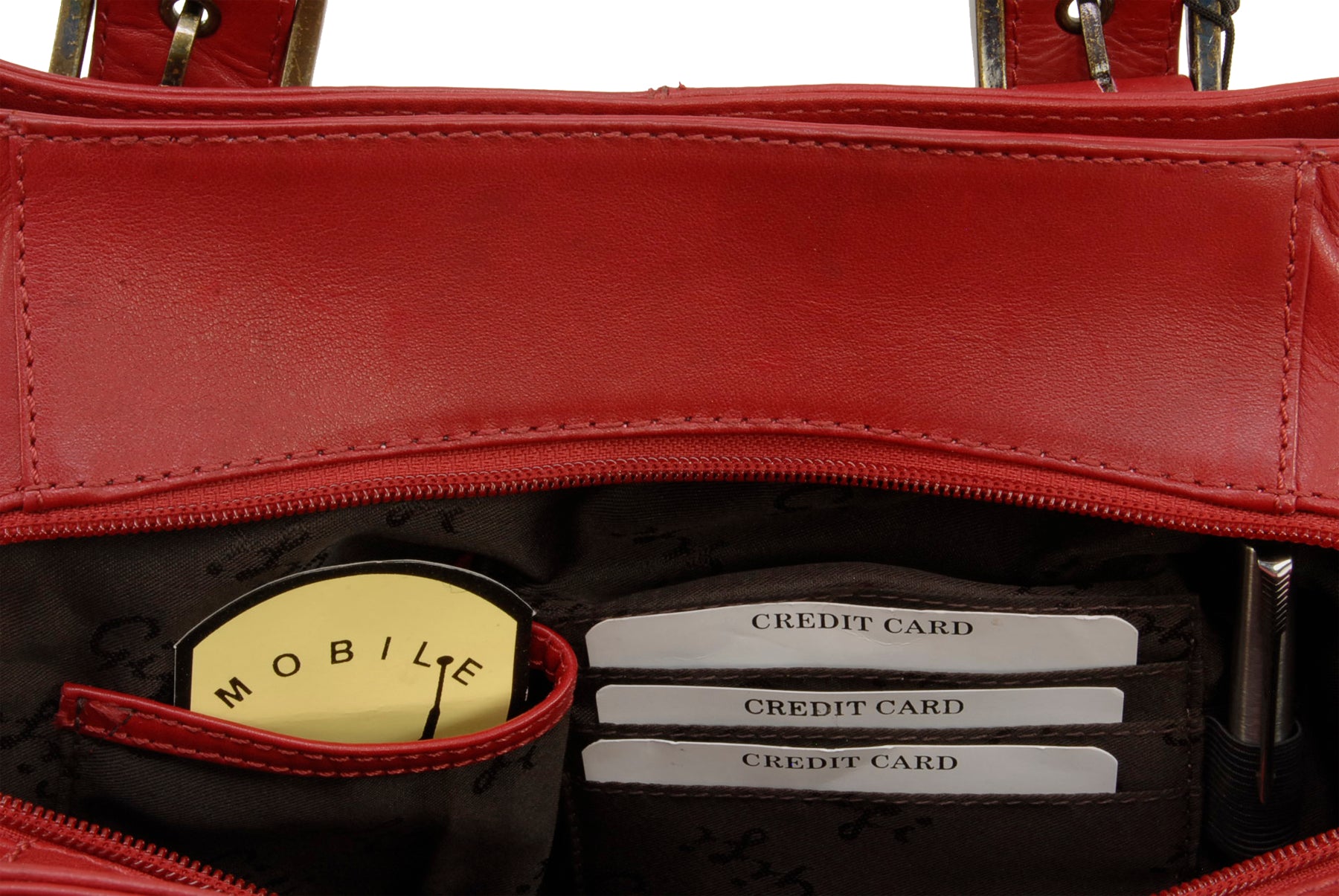 Pockets: 3 Compartments + 1 Interior Side Zipped Pocket + 1 Leather topped Mobile Phone Holder + 1 Leather topped Interior Open Pocket + 2 Outer End Zipped Pockets