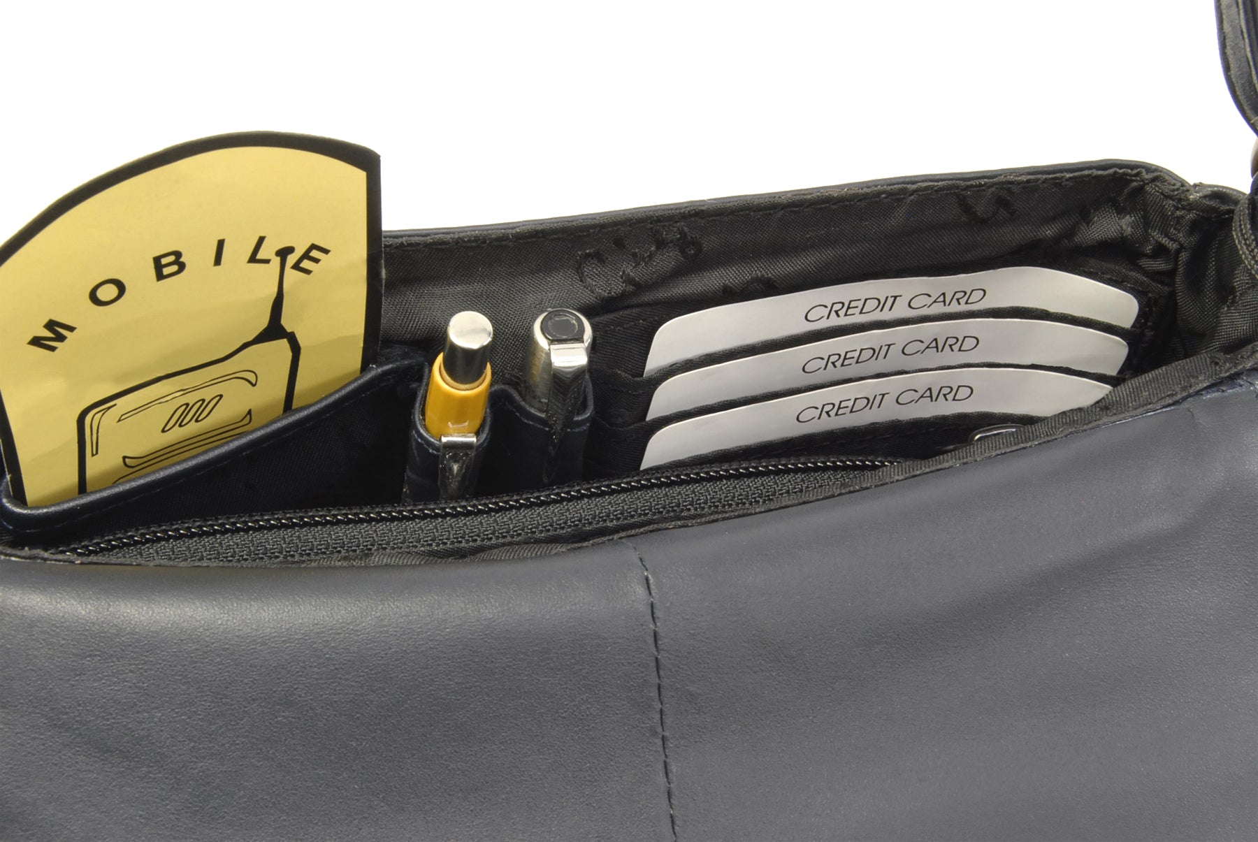 Pockets: 2 Main Compartments + 1 Central Zipped Compartment + 1 Interior Side Zipped Pocket + 1 Leather topped Mobile Phone Holder + 1 Leather topped Interior Open Pocket + 1 Rear Outer Concertina Pocket containing 1 Interior Side Zipped Pocket