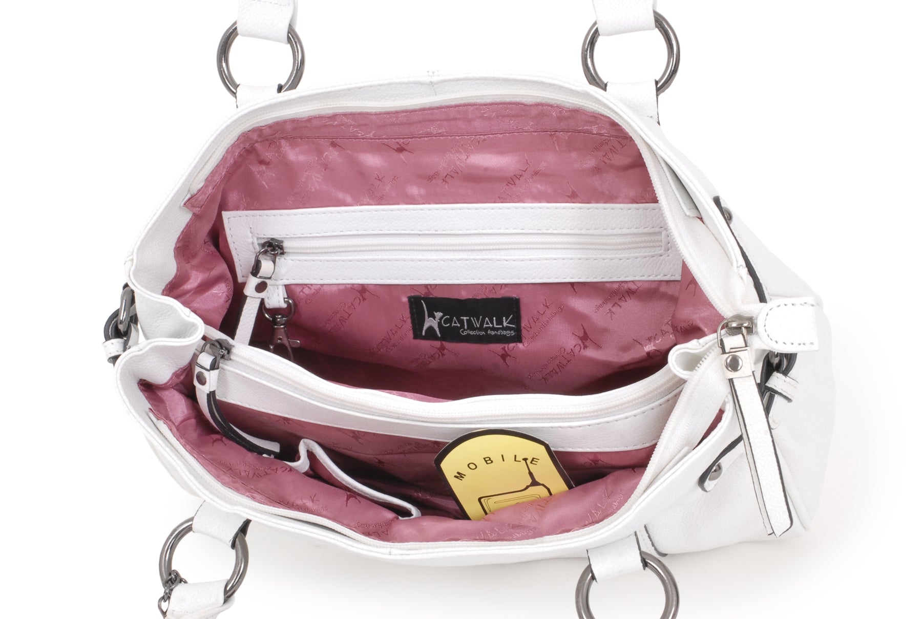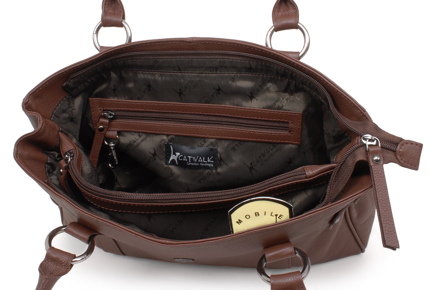 A versatile leather shoulder bag that’s ideal for carrying your daily essentials in style. Its sleek, classic design makes it a staple piece in any wardrobe.This is a mid-sized bag with plenty of compartments and pockets to organise contents. Featuring a thoughtfully designed interior with multiple pockets and compartments, this bag ensures your essentials are neatly organised and easily accessible, offering both style and functionality for wherever your day takes you.Designed for everyday use. It can accommodate A5 sized diary, purse, make-up case and umpteen other handbag essentials. Fits standard sized tablets and eReaders. The main compartment opens wide and closes securely with a metal zip. The interior is lined with signature fabric. Interior pockets are reinforced with leather trim. Two interior zipped pockets are included for valuables.A zipped outer pocket is located on the rear of the bag. The base of the bag is flat for stability when placed on surfaces.