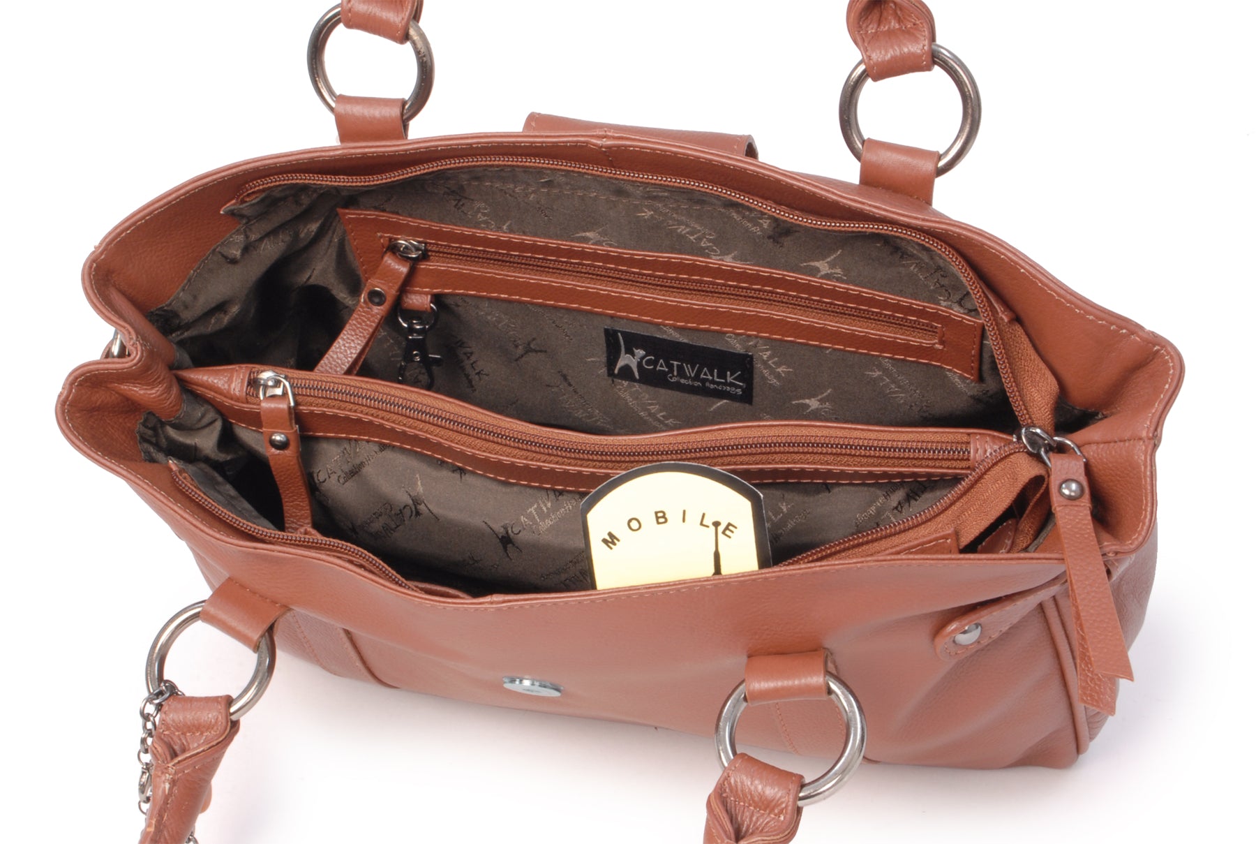 Pockets: 2 Main Compartments + 1 Central Zipped Compartment + 1 Interior Side Zipped Pocket + 1 Leather topped Mobile Phone Holder + 1 Leather topped Interior Open Pocket + 1 Key Fob