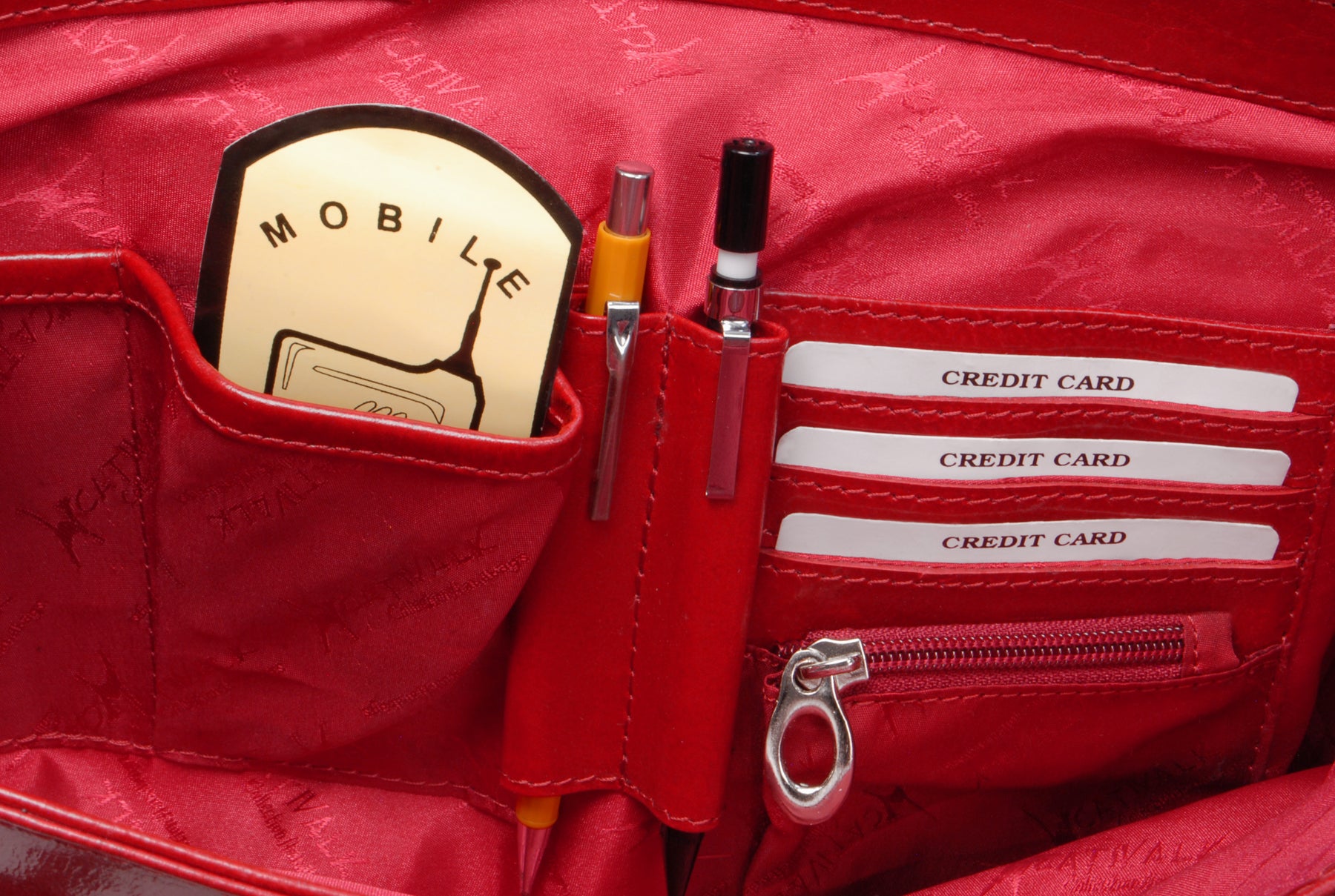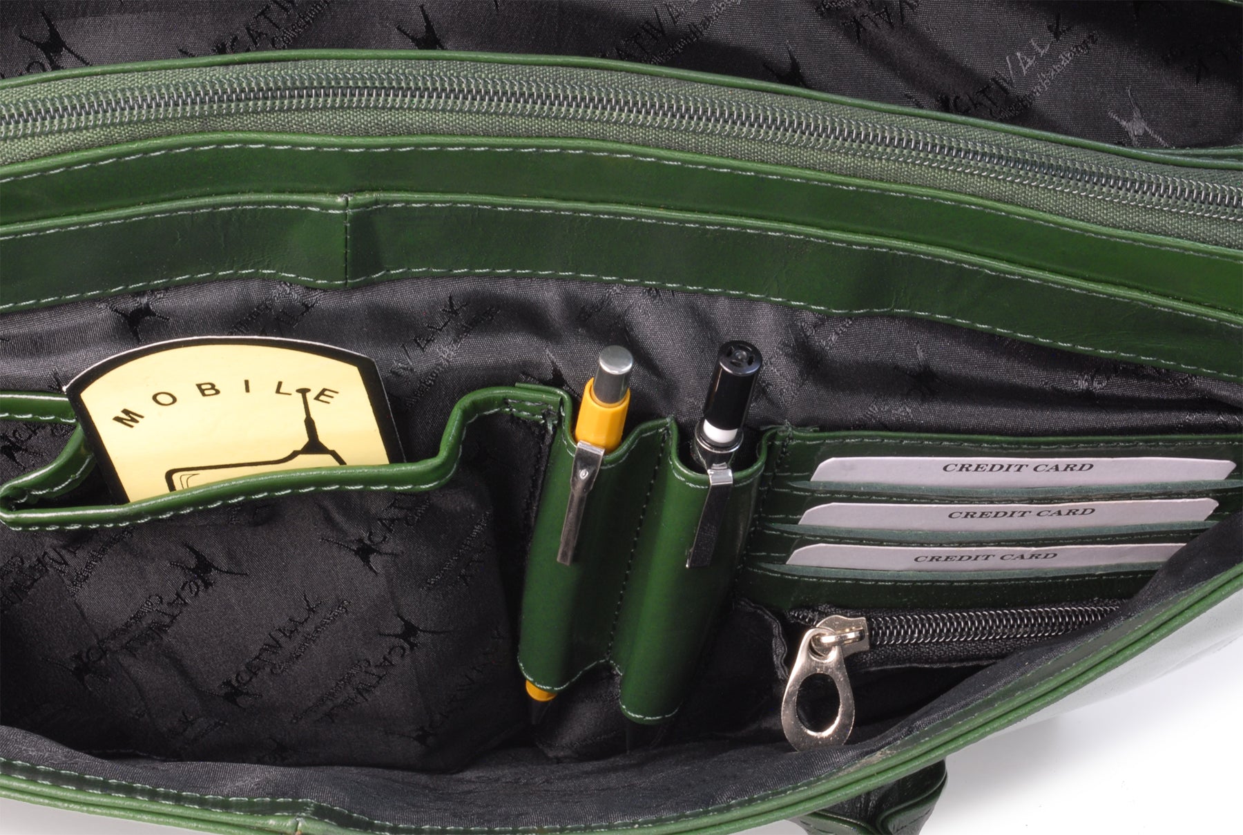 Pockets: 1 Zipped Laptop Compartment + 2 Open Compartments + 1 Interior Side Zipped Pocket + 1 Leather topped Mobile Phone Holder + 1 Leather topped Interior Open Pocket + 3 Credit Card Holders + 2 Pen Holders + 1 Zipped Coin Pocket + 1 Key Fob + 1 Outer Rear Zipped Pocket